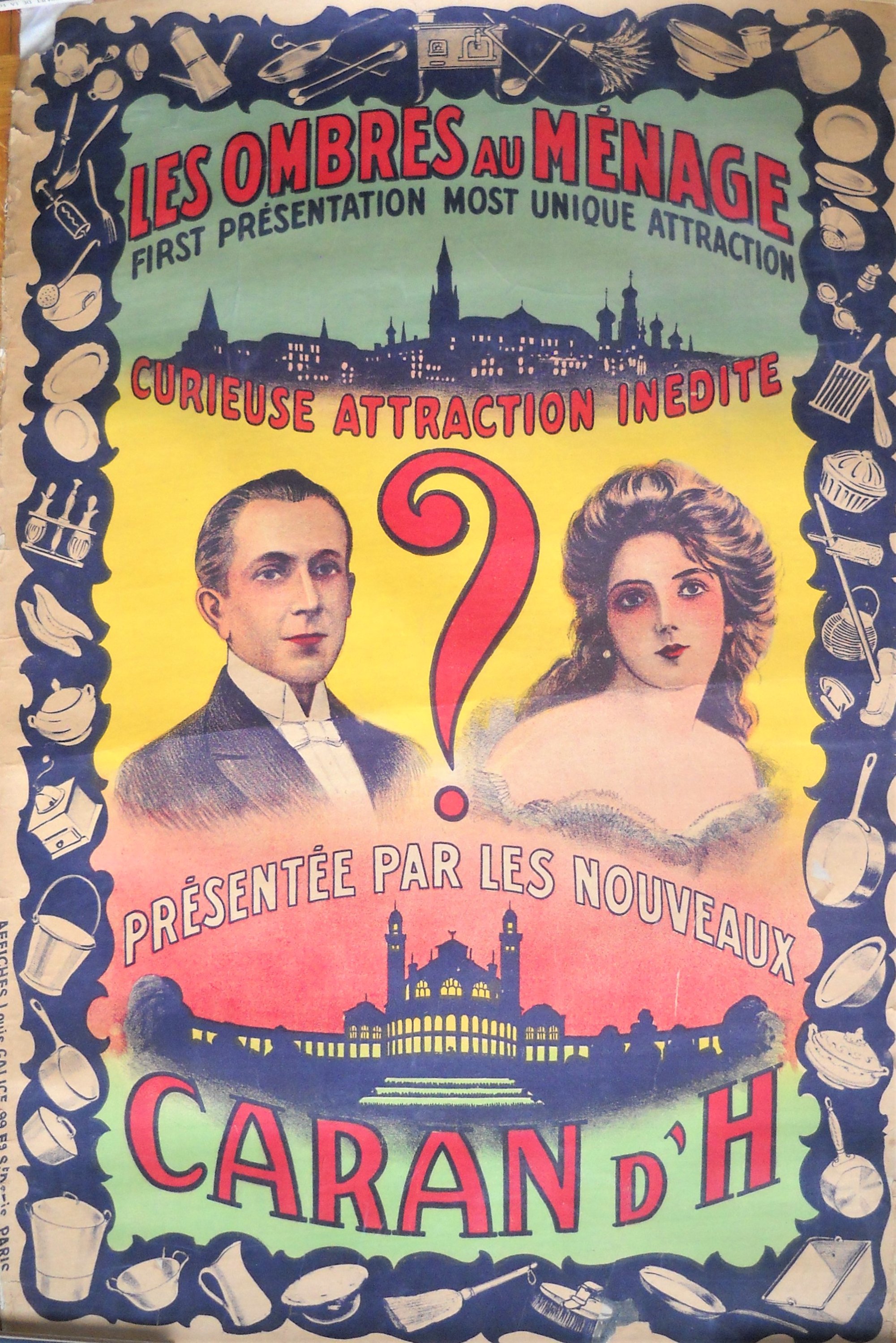 « Les Ombres au ménage / First présentation most unique attraction / Curieuse attraction inédite présentée par les nouveaux Caran dH ». vers 1900-1910. Epreuve originale imprimée en couleurs. « Affiche Louis Galice Paris ». Entoilée, 119 x 77 cm, état moyen.
