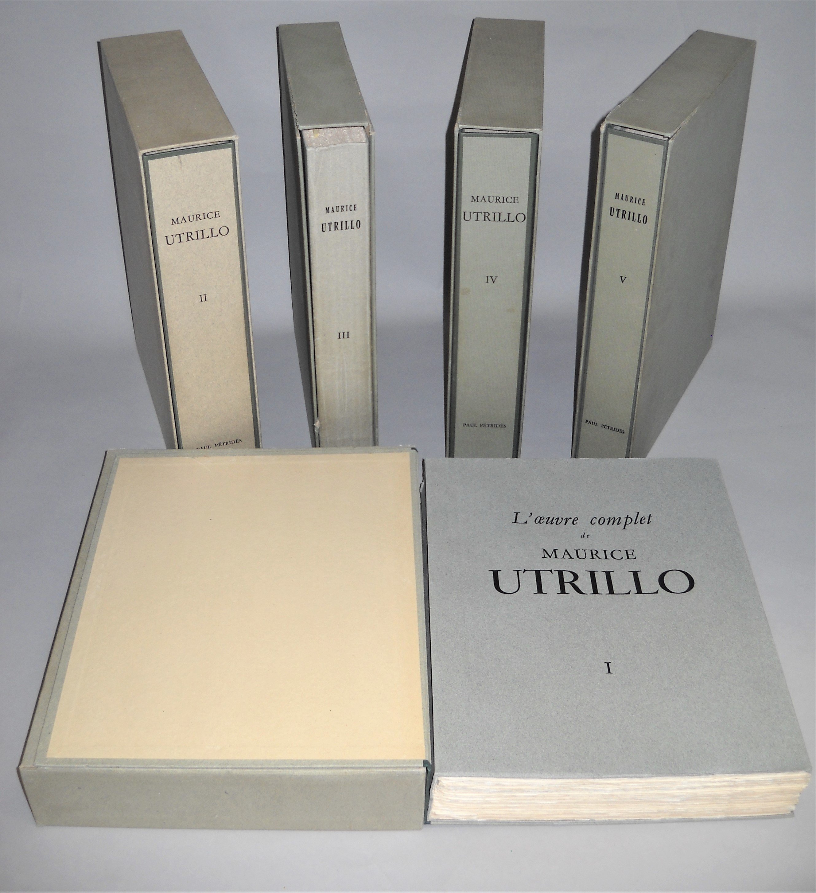 Paul Pétridès, Luvre complet de Maurice Utrillo 1959/1974. Complet en 5 volumes sur papier Arches filigrané, avec nombreuses reproductions en noir. Tirage limité n°326/1000. 34 x 26 cm (sous étuis dont certains accidentés).