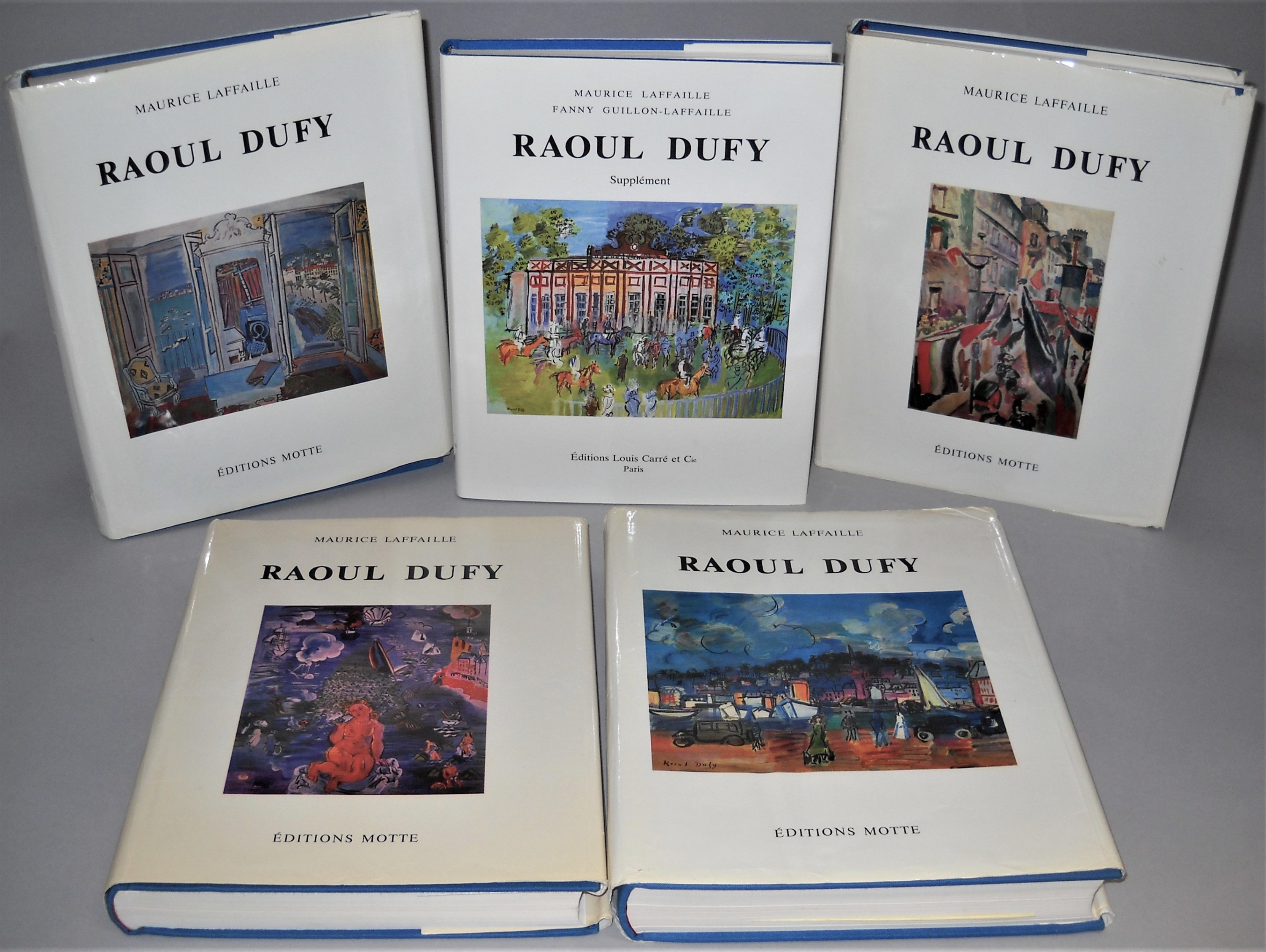 Maurice Laffaille, Raoul Dufy, Catalogue raisonné de l'uvre peint. 4 volumes + supplément. Éditions Motte, Genève, 1972-1977. Rel. toiles éditeur, jaquettes (en létat), 382-350-394-346-212 pp., 29 x 23 cm. Rare ensemble.