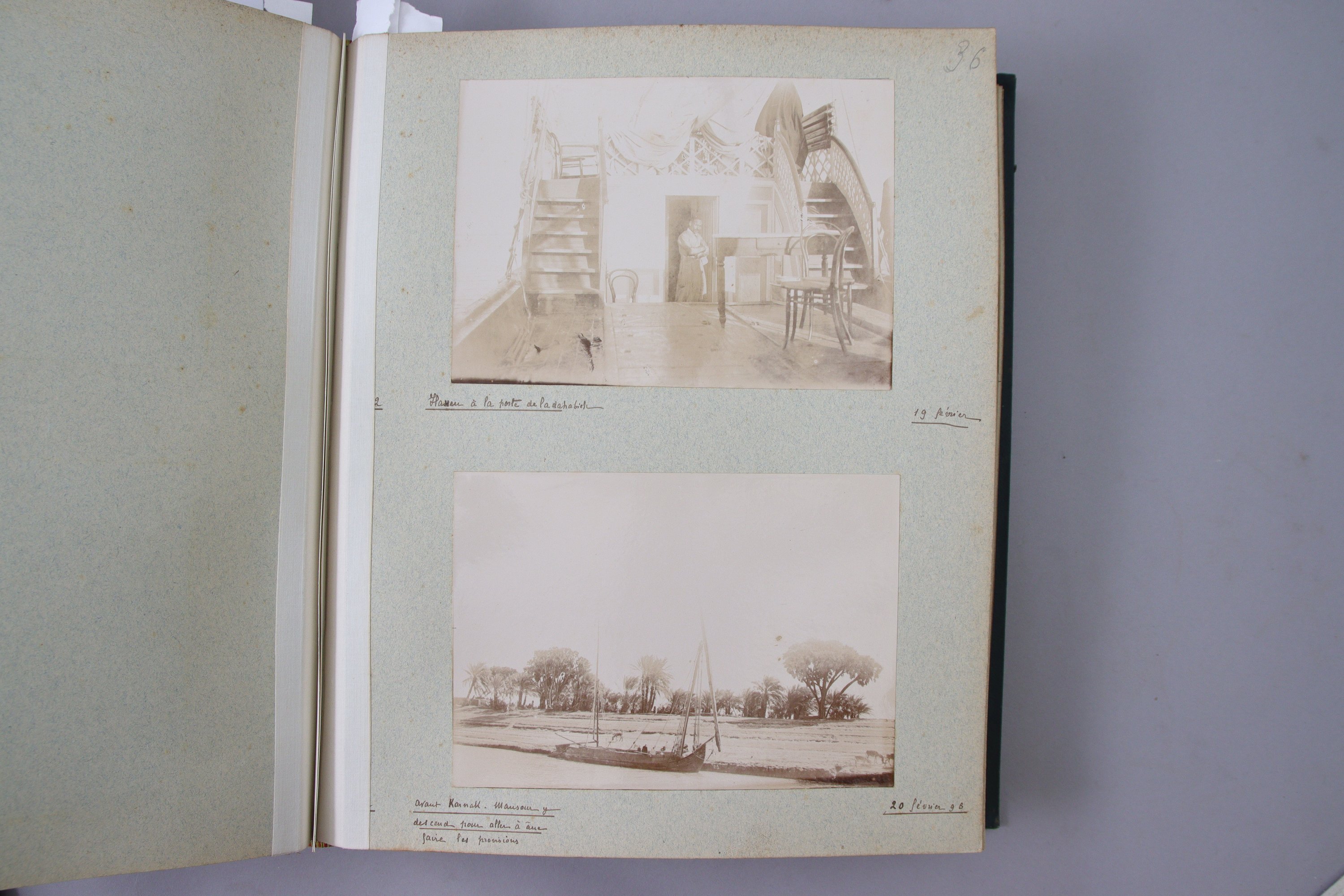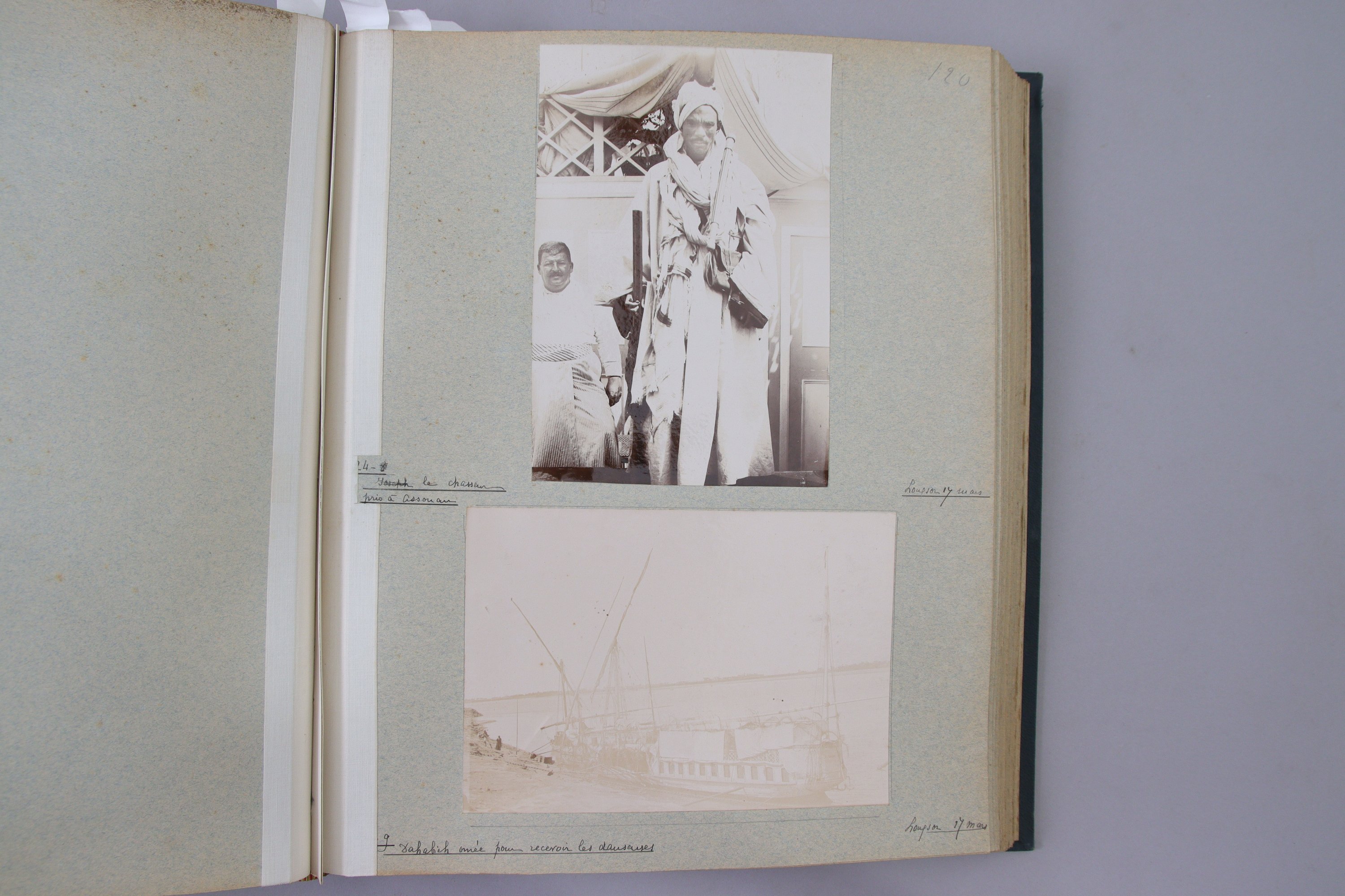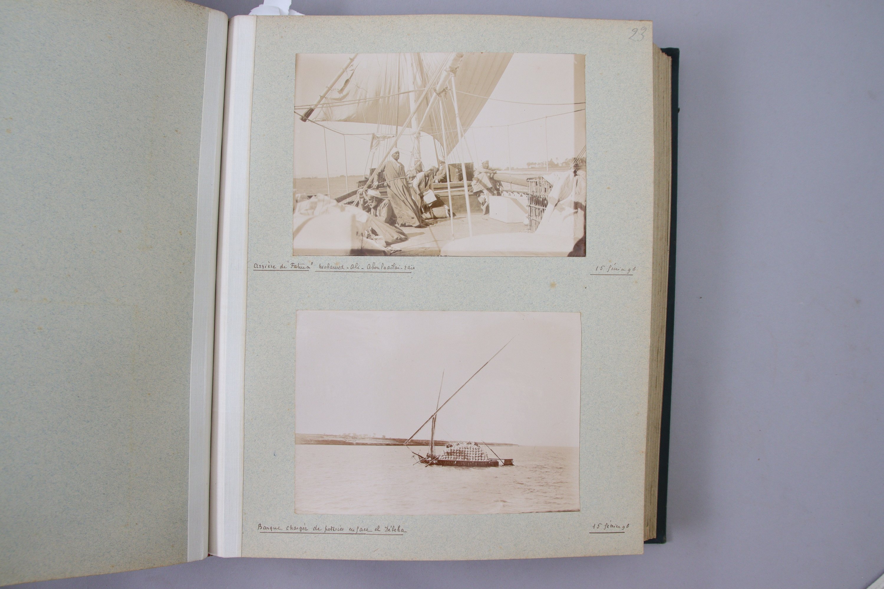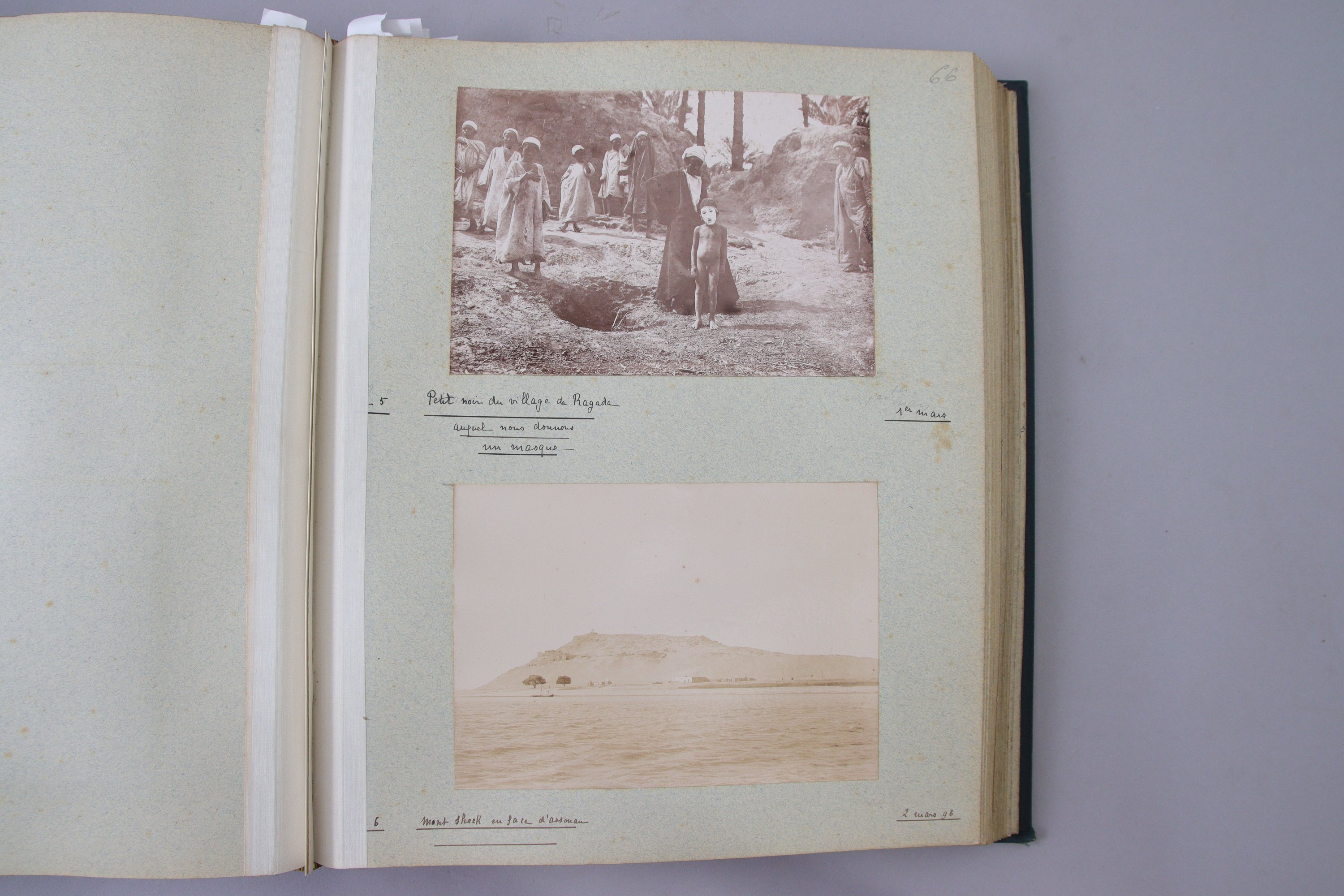 Quatre albums photographiques (32 x 26 cm), demi chagrin vert, d’un total d’environ 400 photographies montées sur carton fort, toutes avec légendes manuscrites figurant un voyage en HAUTE EGYPTE sur le Nil, ses rives, ses berges, entrepris entre le 21 janvier et le 10 avril 1896 par Albert et Louise MORIN de Montigny-Montfort (Côte d’Or).