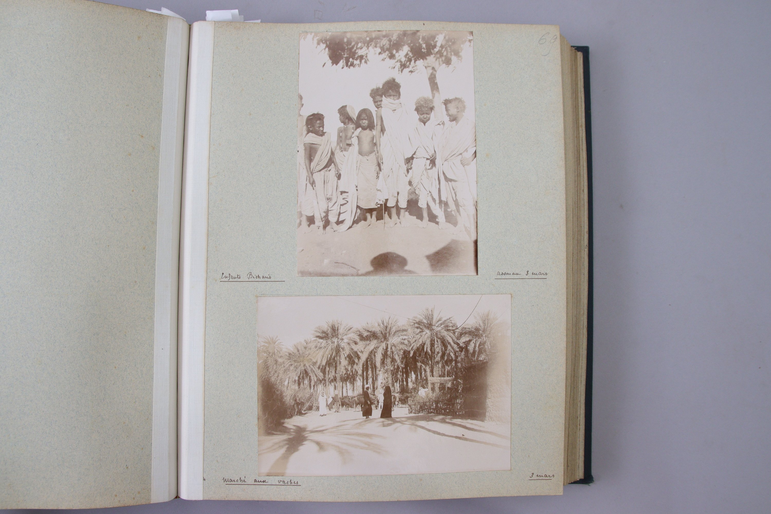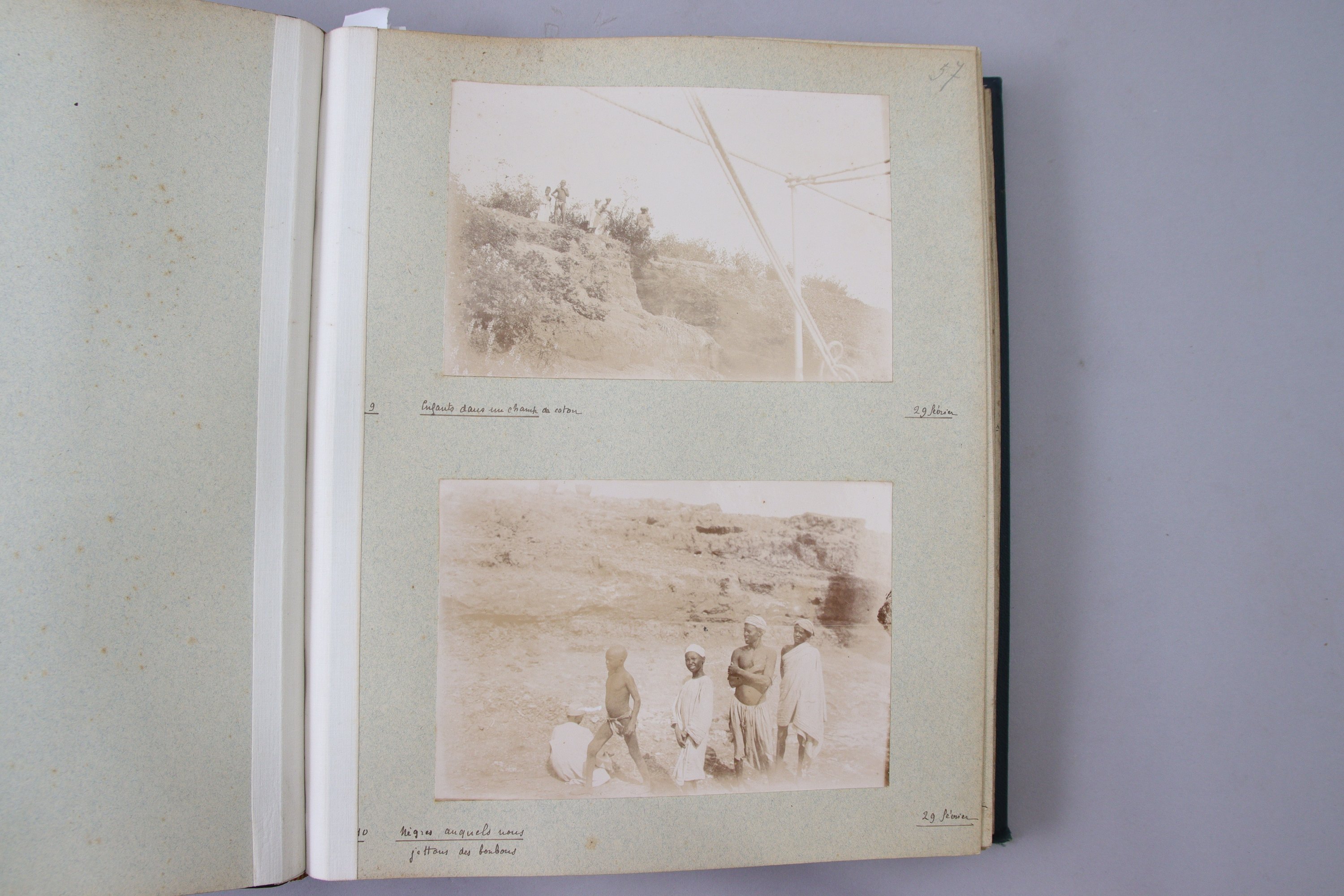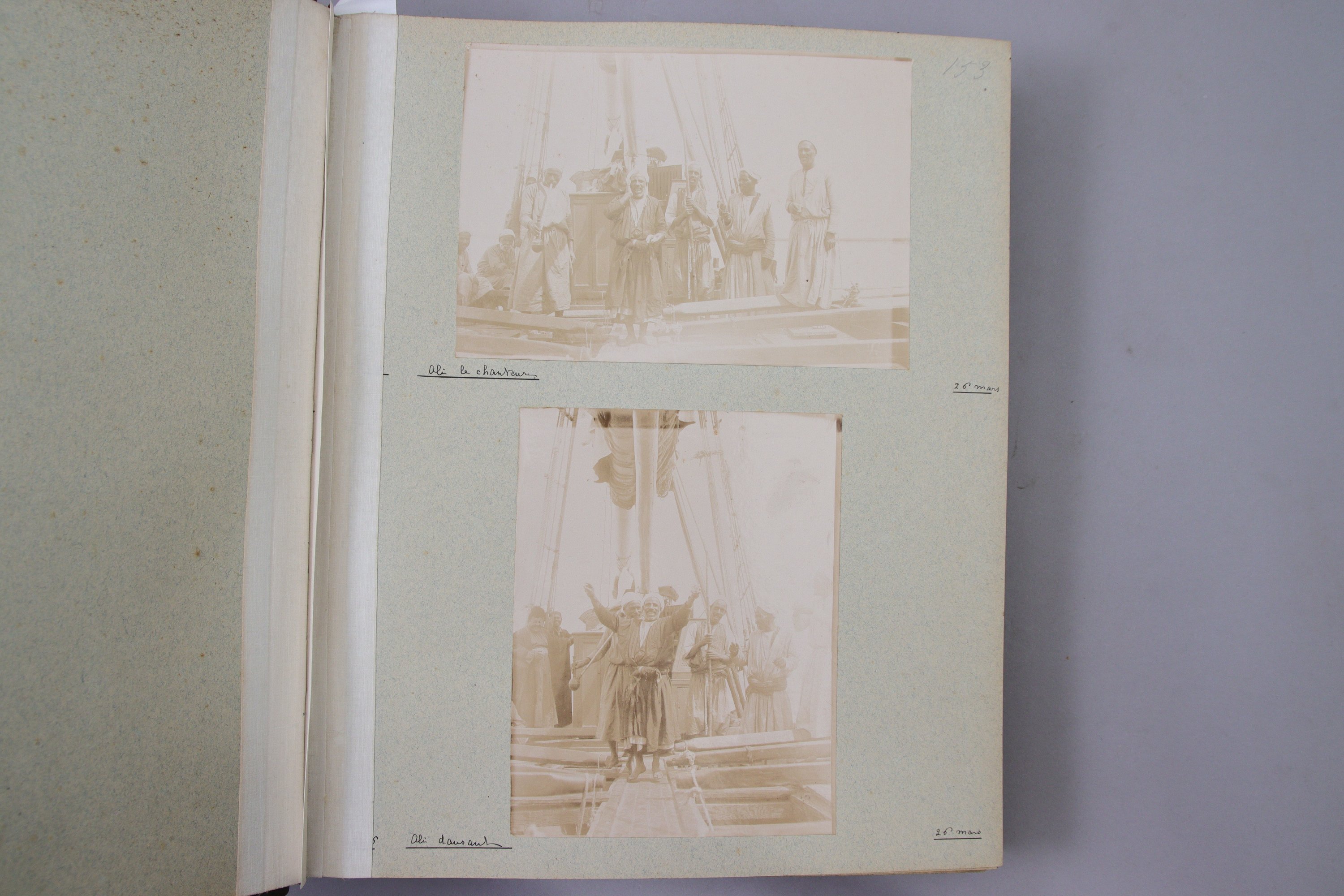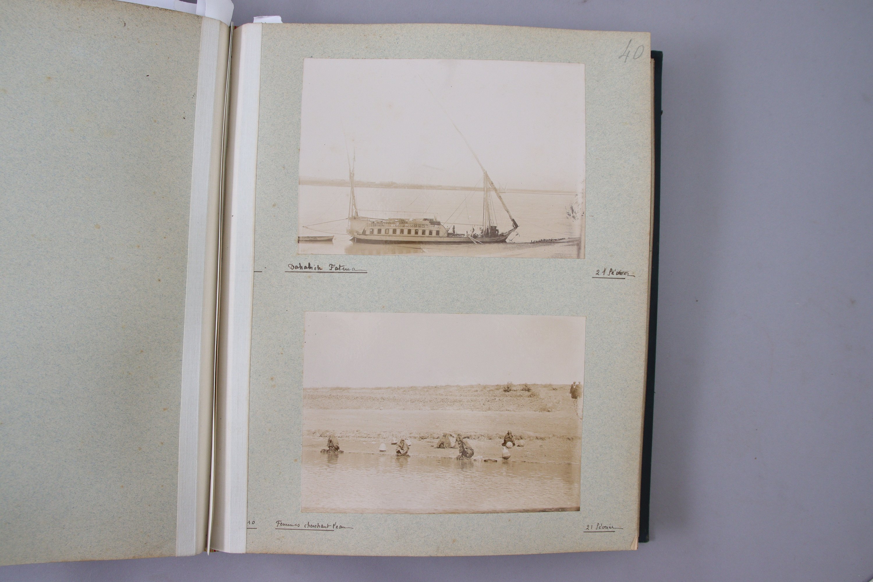 Quatre albums photographiques (32 x 26 cm), demi chagrin vert, d’un total d’environ 400 photographies montées sur carton fort, toutes avec légendes manuscrites figurant un voyage en HAUTE EGYPTE sur le Nil, ses rives, ses berges, entrepris entre le 21 janvier et le 10 avril 1896 par Albert et Louise MORIN de Montigny-Montfort (Côte d’Or).