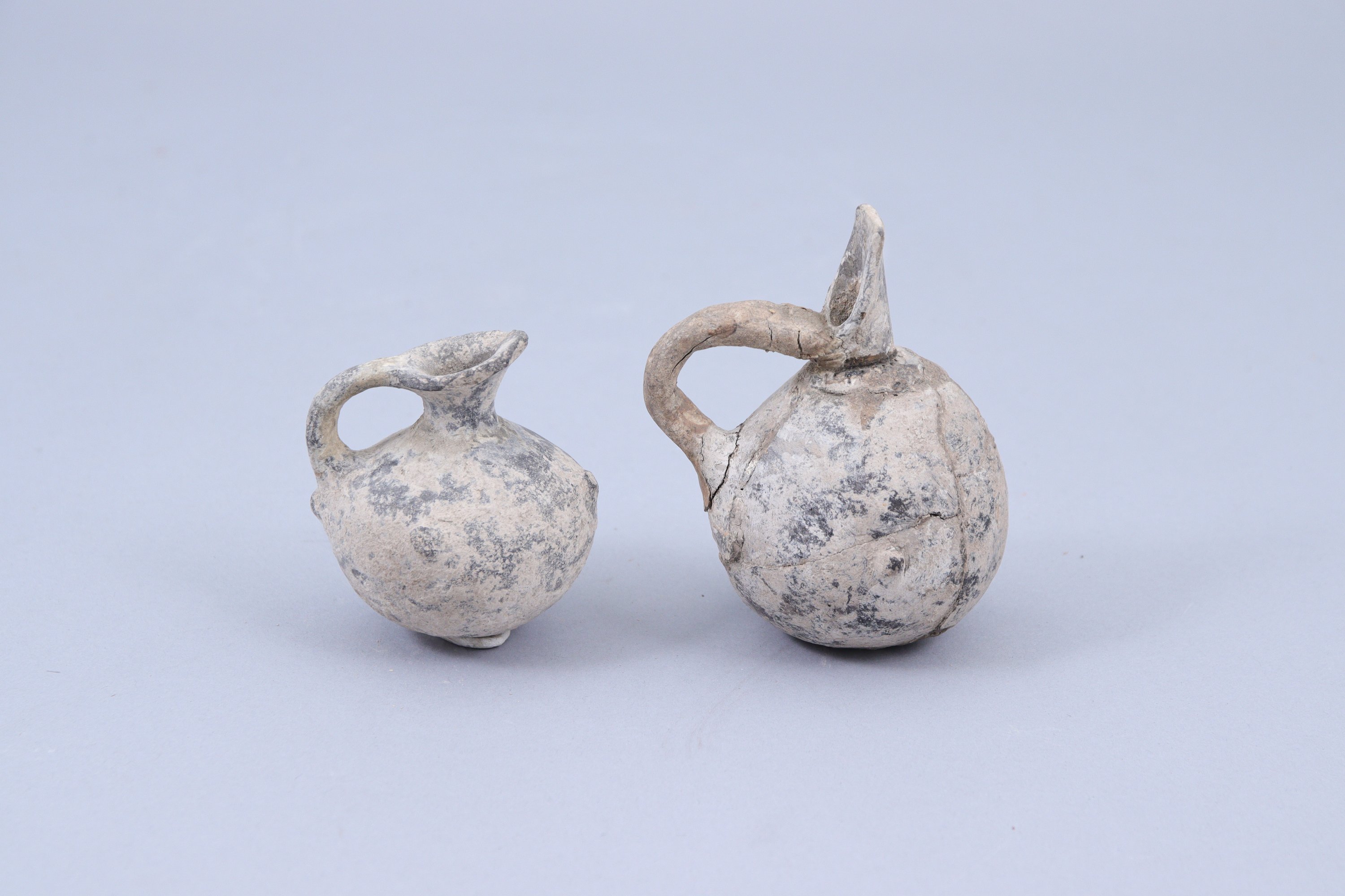 - Petit vase en céramique noire à une anse de type nochoé, à bec coupé et avec des boutons sur la panse. Haut. 10 cm. (accident et importantes restaurations)