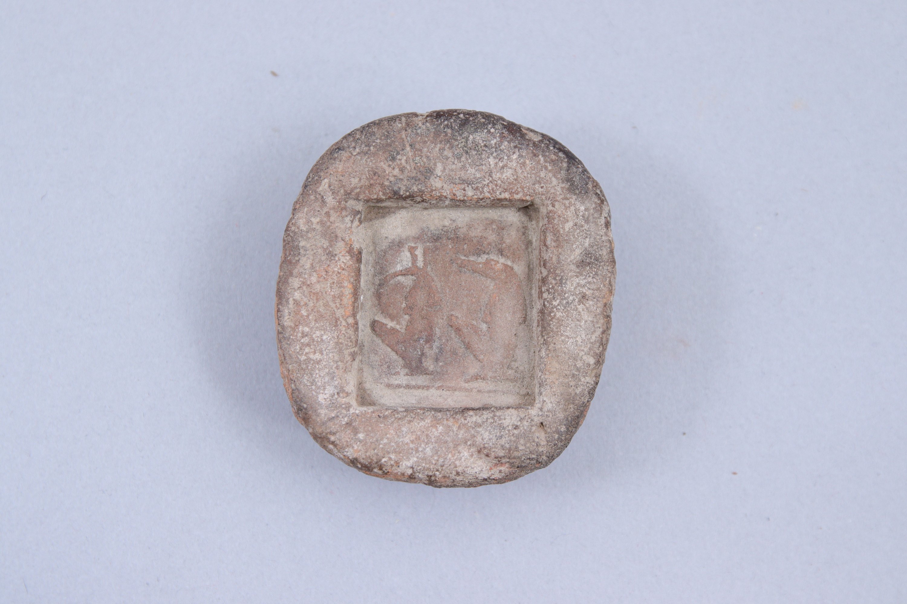 Joint: Egypte. XIXe/XXe dynastie (1292-1070 av. J.-C.). Moule damulette égyptienne en terre cuite figurant deux divinités dont Seth. Haut. 5 cm.