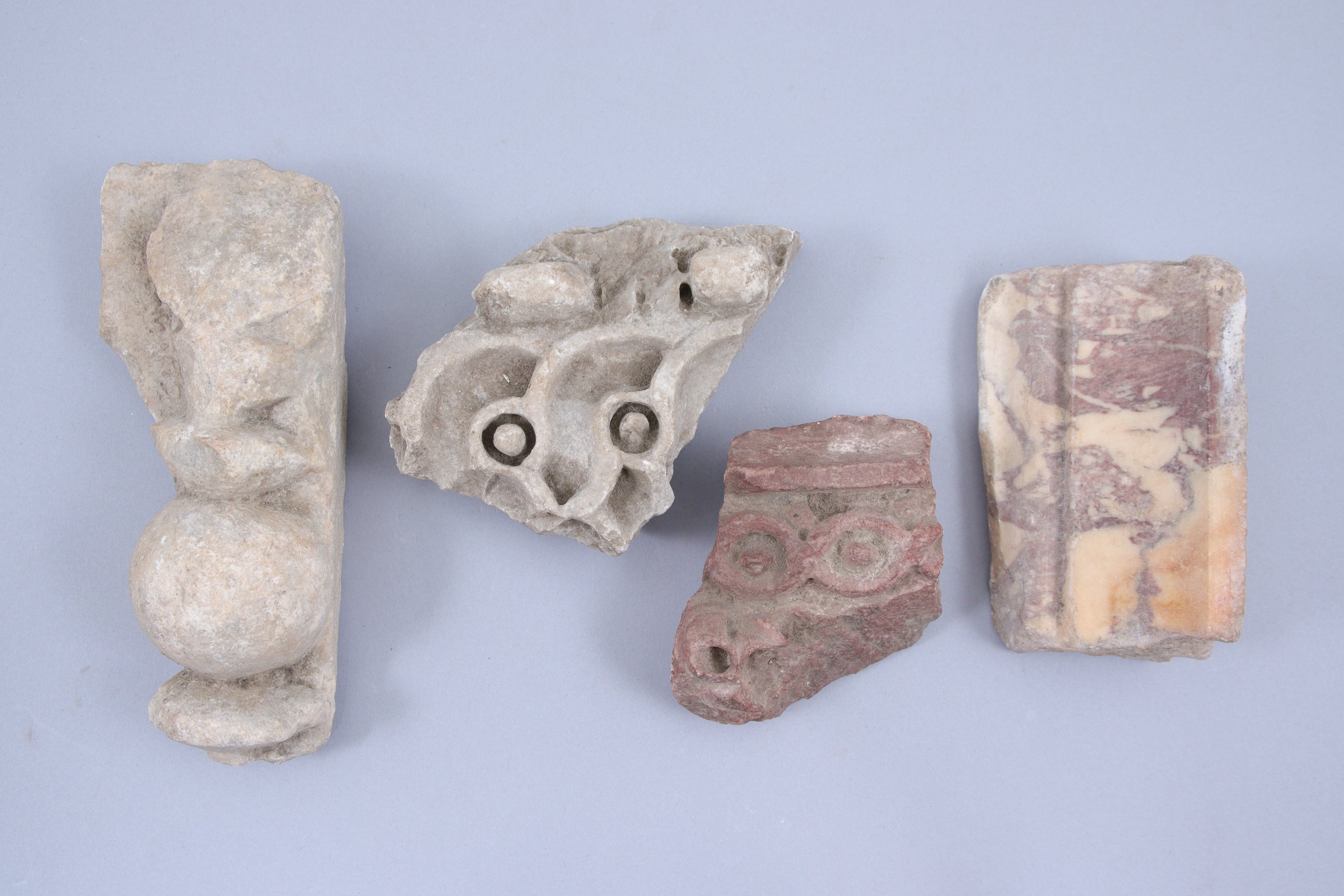 - Fragment de frise romaine en marbre sculpté portant une étiquette indiquant « Murla ». Long. max 15 cm.