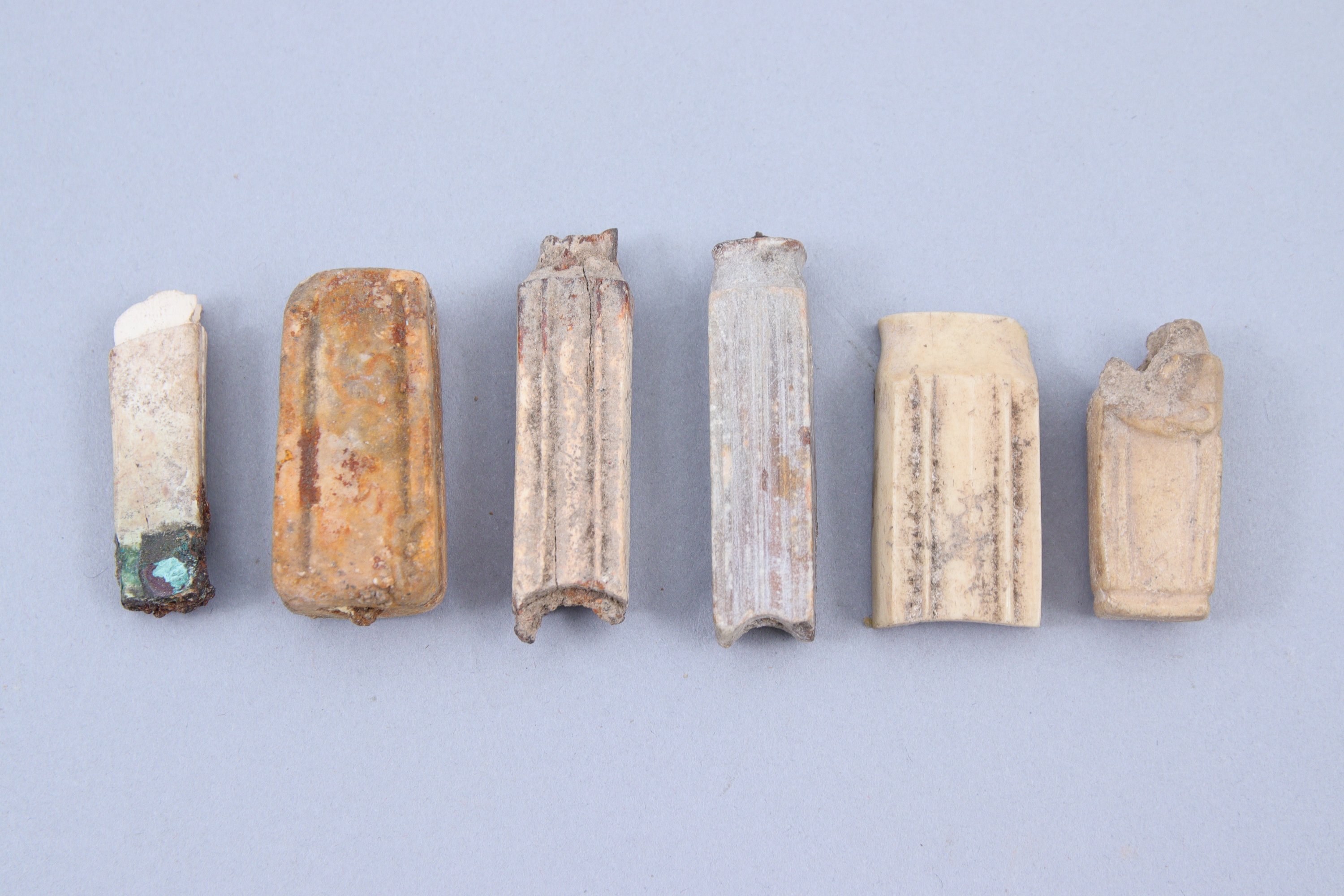 - 8 manches cylindriques dustensiles romains en os décoré de torsades, etc. On leur joint un tube à décor tourné (embouchure de narguilé ottoman?). Long. max. 9,5 cm.
