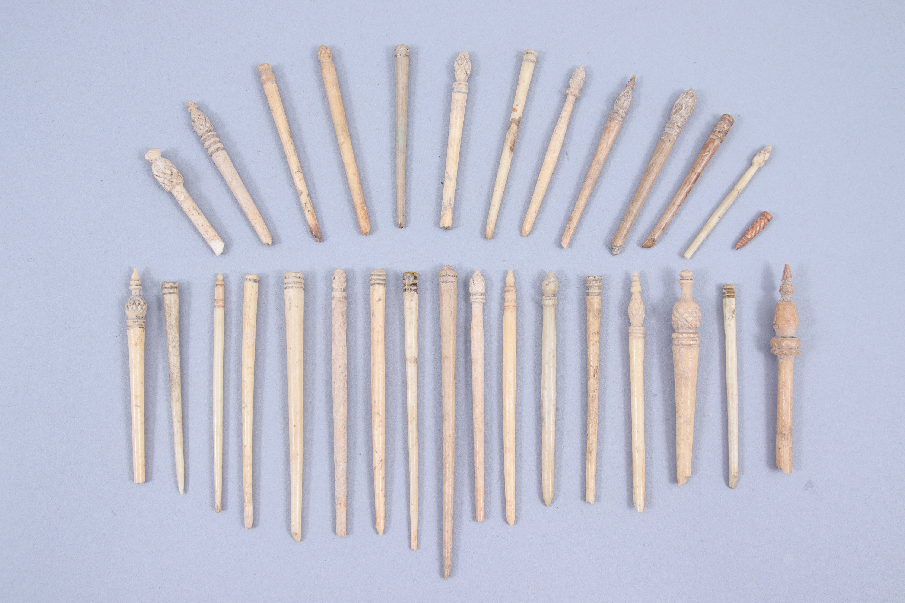 - 32 épingles (lune avec une main à son extrémité) et ustensiles allongés en os. Long. max. 14 cm. (accidents et manques).