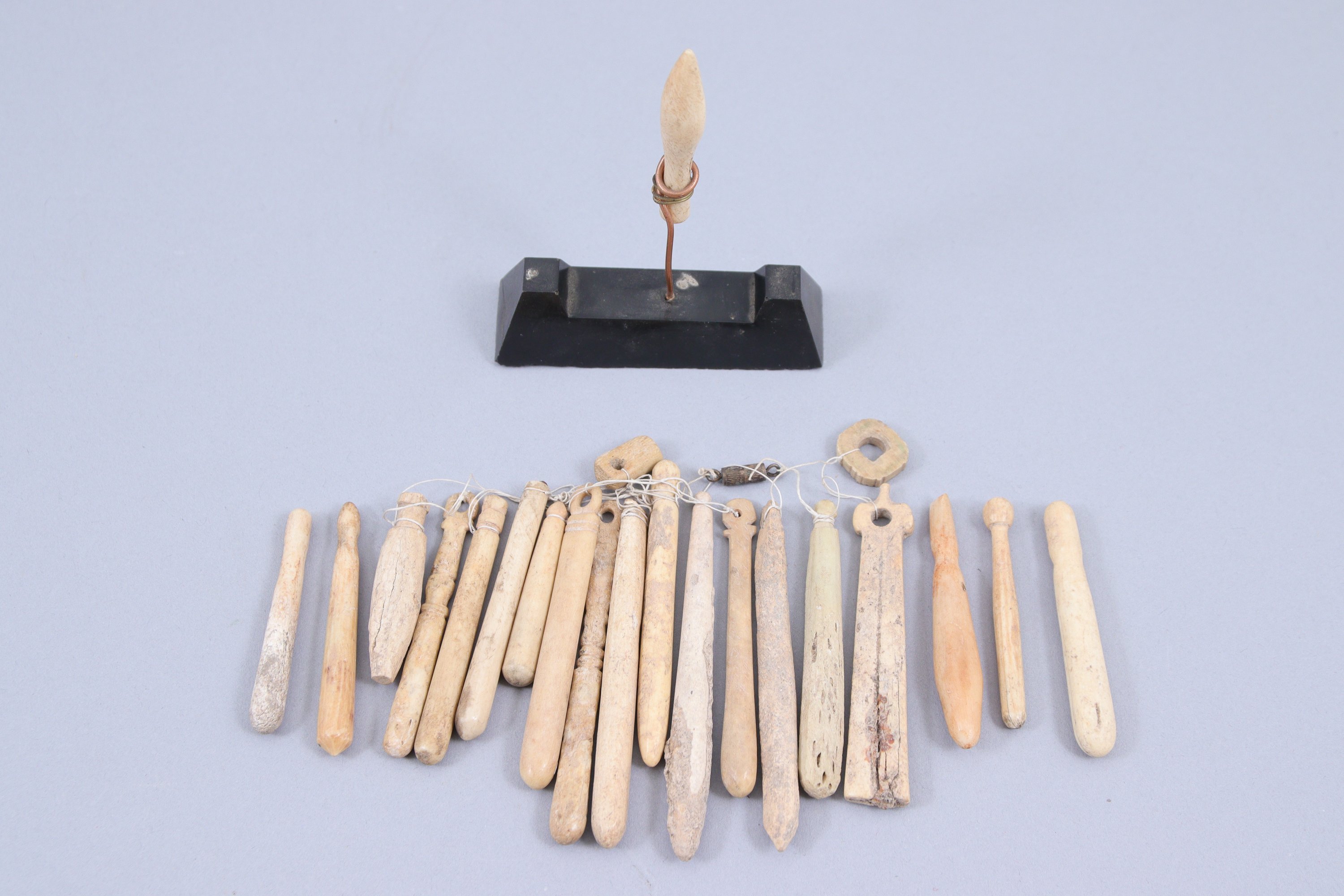Joints: Probablement Smyrne ou ses environs, période romaine. 17 fuseaux romains en os, deux se terminant par un crochet. Long. max. 13 cm. (manques)