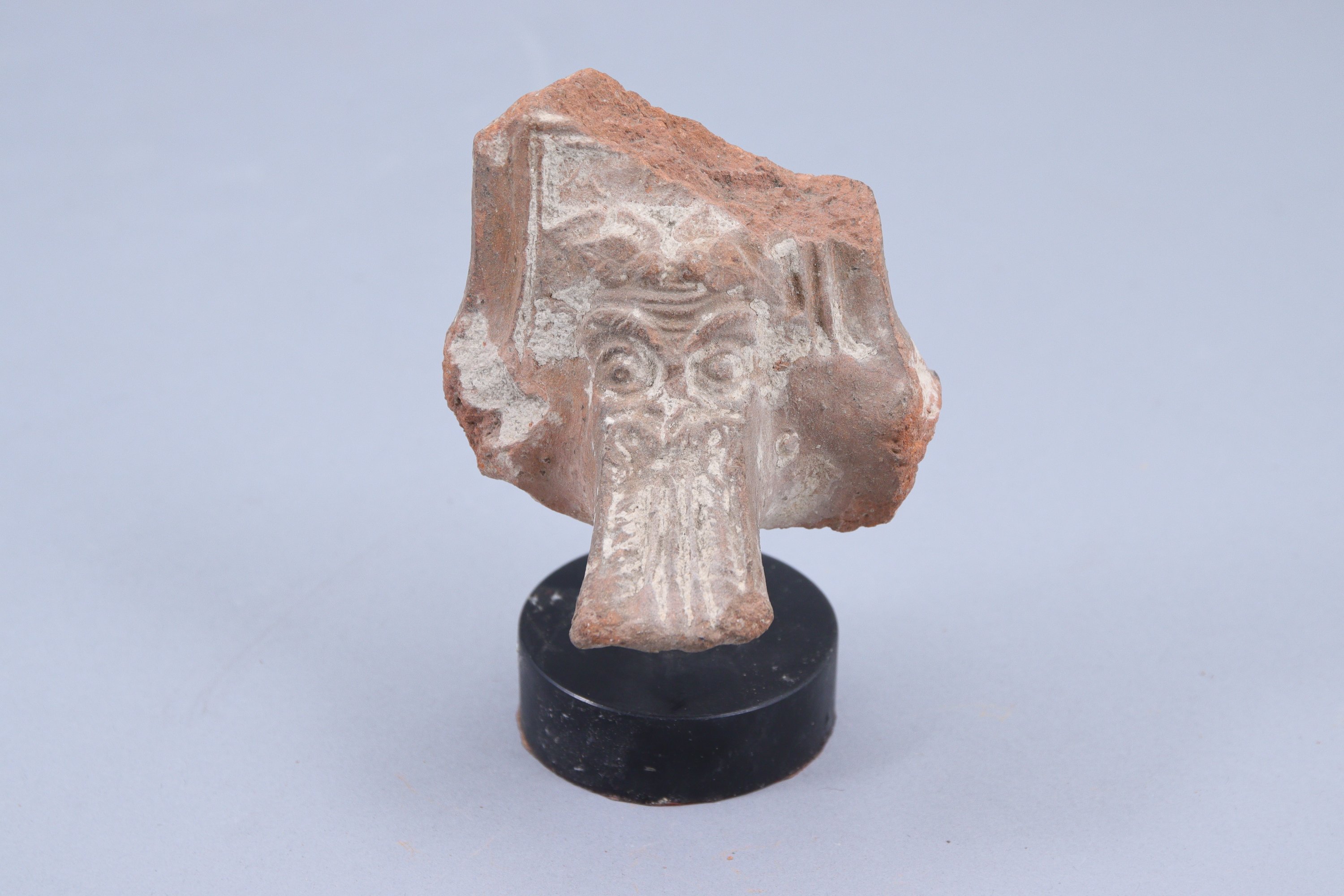 surmontée de lettres grecques (alpha et thêta), provenant dun brasero en terre cuite.