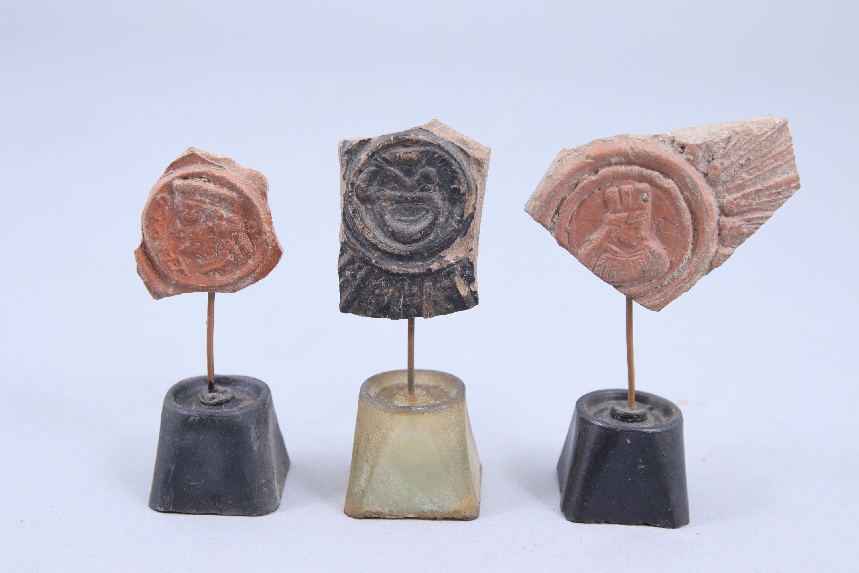 Joints: Probablement Smyrne ou ses environs. 3 médaillons décorés dun masque dacteur, dun buste de Tyché et dune tête accompagnée dune inscription grecque IHNODO (?), provenant de céramiques hellénistiques à relief. Long. max. 5 cm.