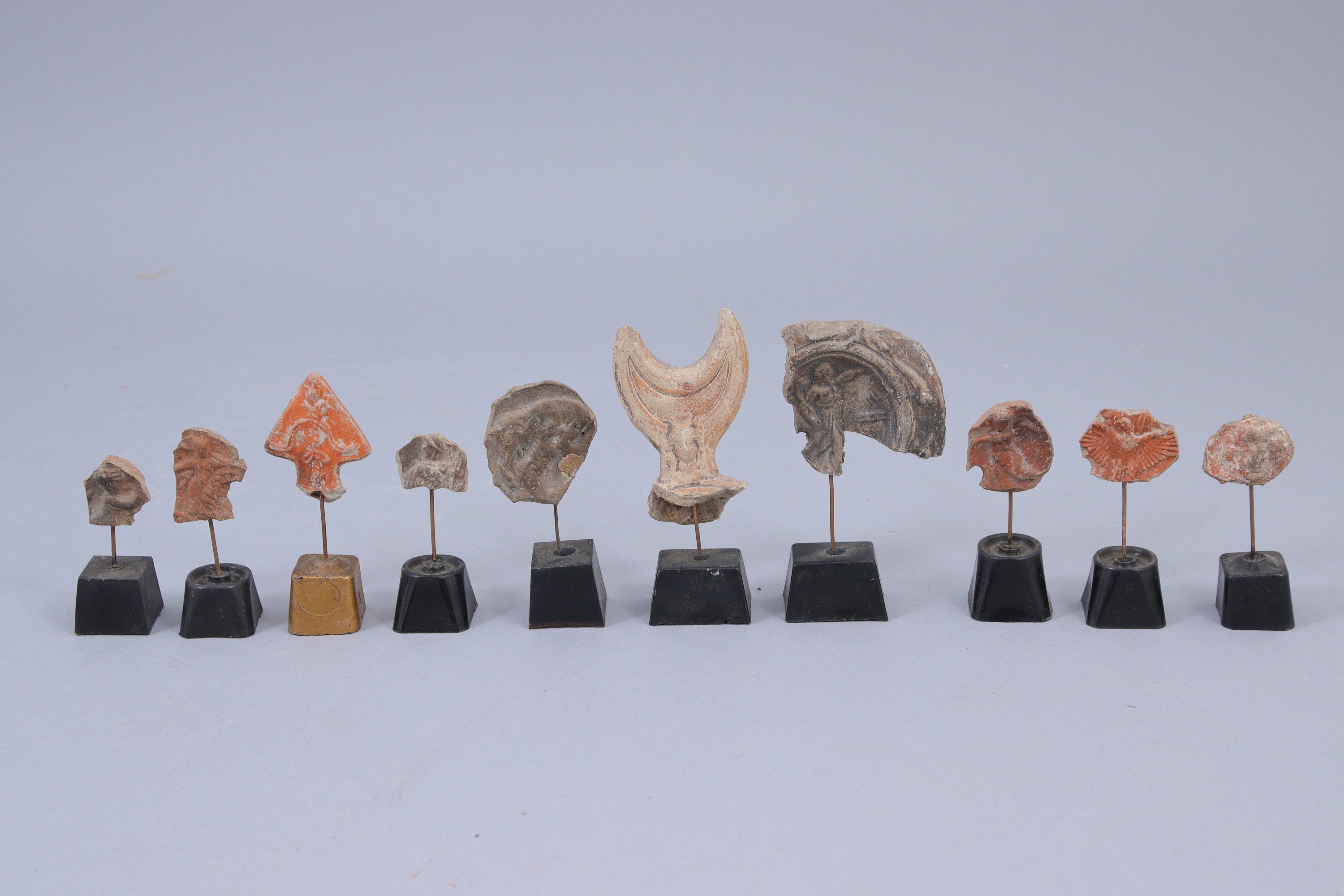 - 24 fragments de lampes romaines avec décor en relief. (lun marqué "Priène" au crayon). Long. max. 7 cm.