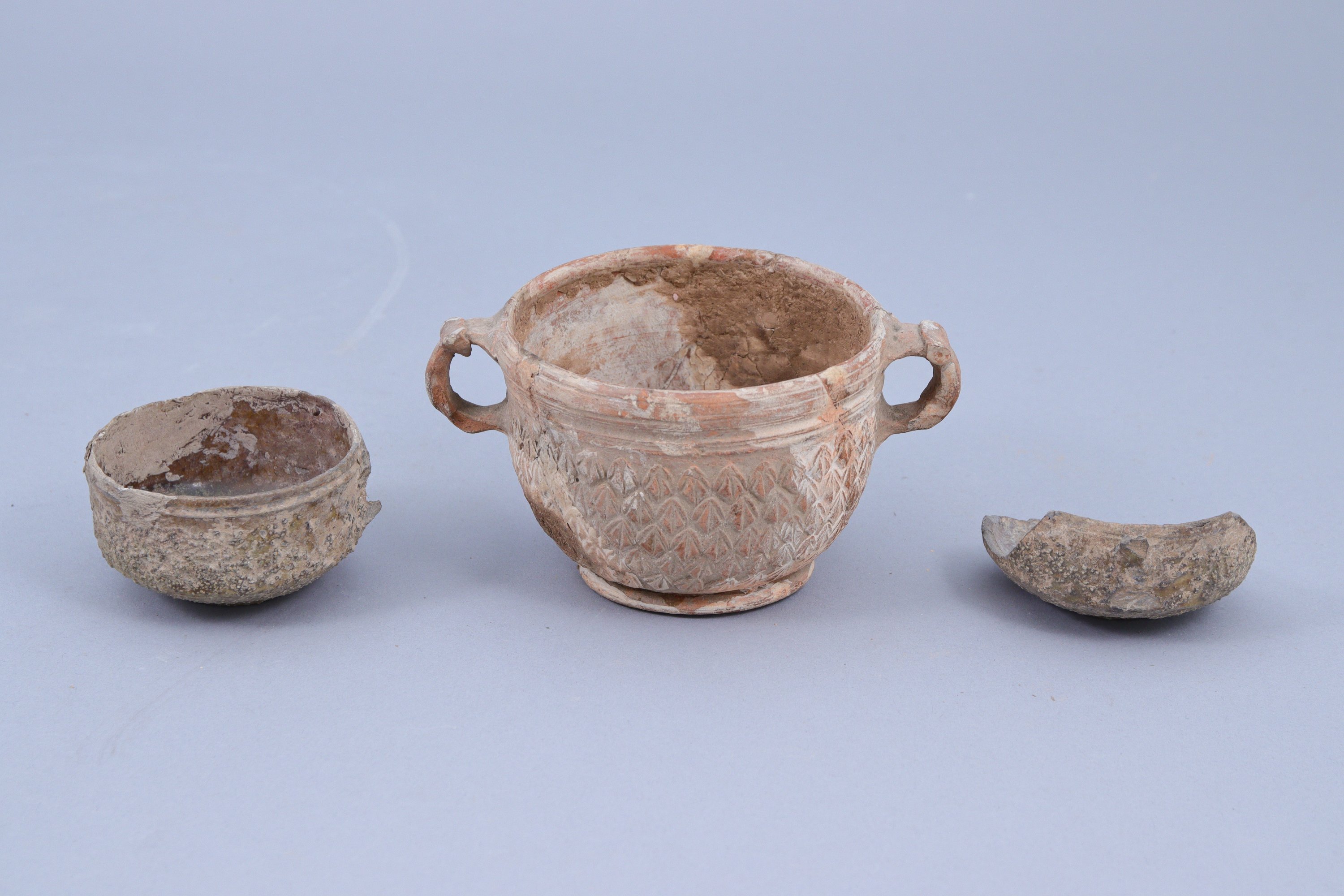 Joints: Période romaine. 3 skyphos, lun à décor décailles en relief, les deux autres à parois granulées et glaçurées. Diam. max. 9,5 cm. (accidents, manques et restaurations).