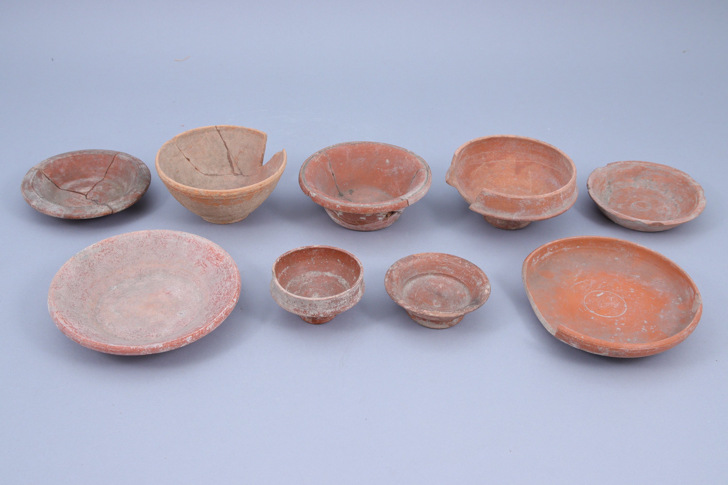 - Neuf céramiques sigillées antiques, lune avec inscription en grec au crayon « clazo », probablement le site de Clazomènes. Diam. max. 15 cm. (accidents, manques et restaurations)