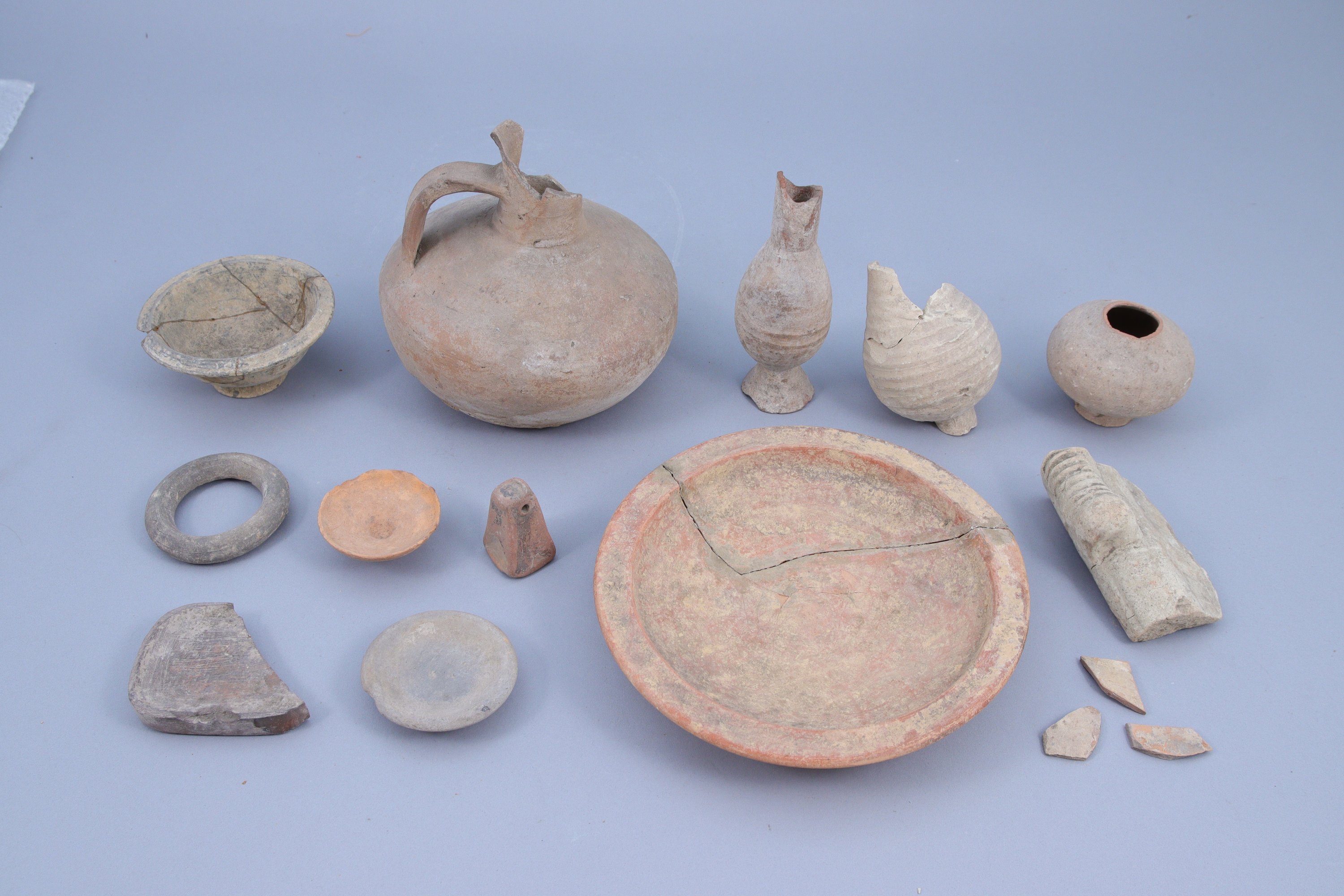 - Lot de céramiques antiques et postérieures (lampe, jatte avec trous circulaire, pilon (?), tessons roulés) et de pierres aux formes singulières. Diam. max. 25 cm. (accidents)