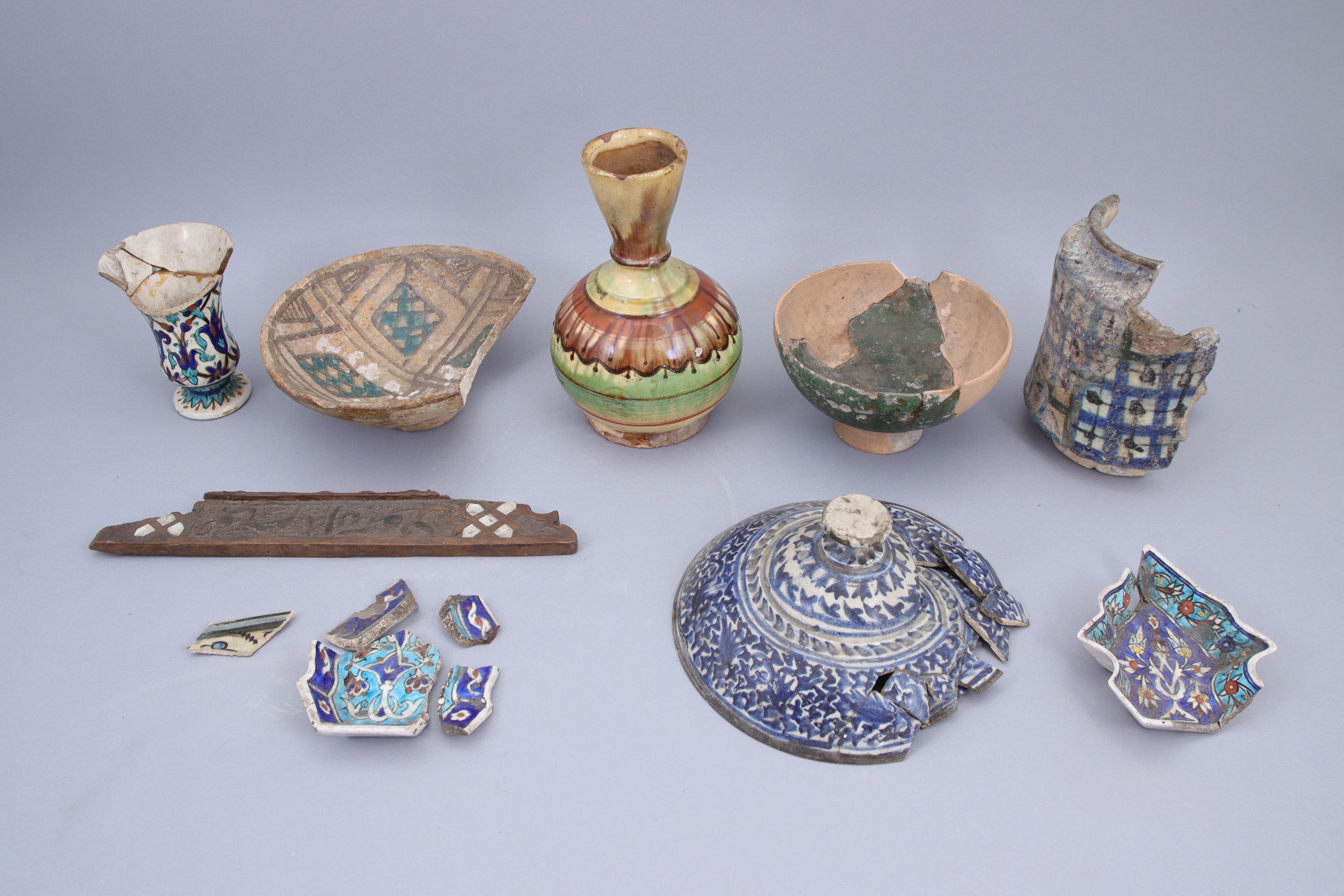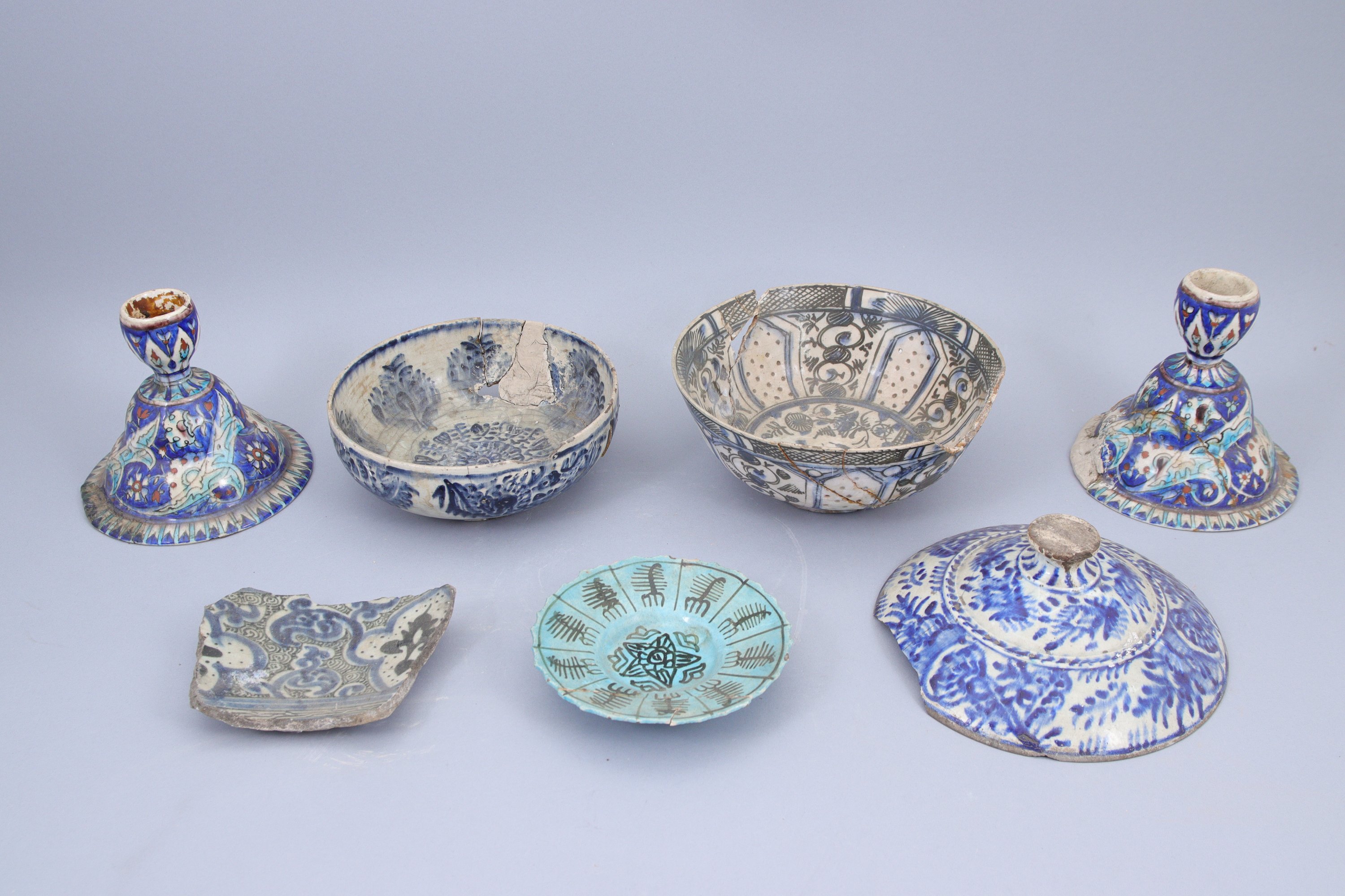 - Époque ottomane. Lot de céramiques ottomanes à décor polychrome (4 jattes, 3 vases, 1 paire de chandeliers, 3 coupelles, 2 couvercles). Diam. max. 21,5 cm. (importantes restaurations, accidents et manques)