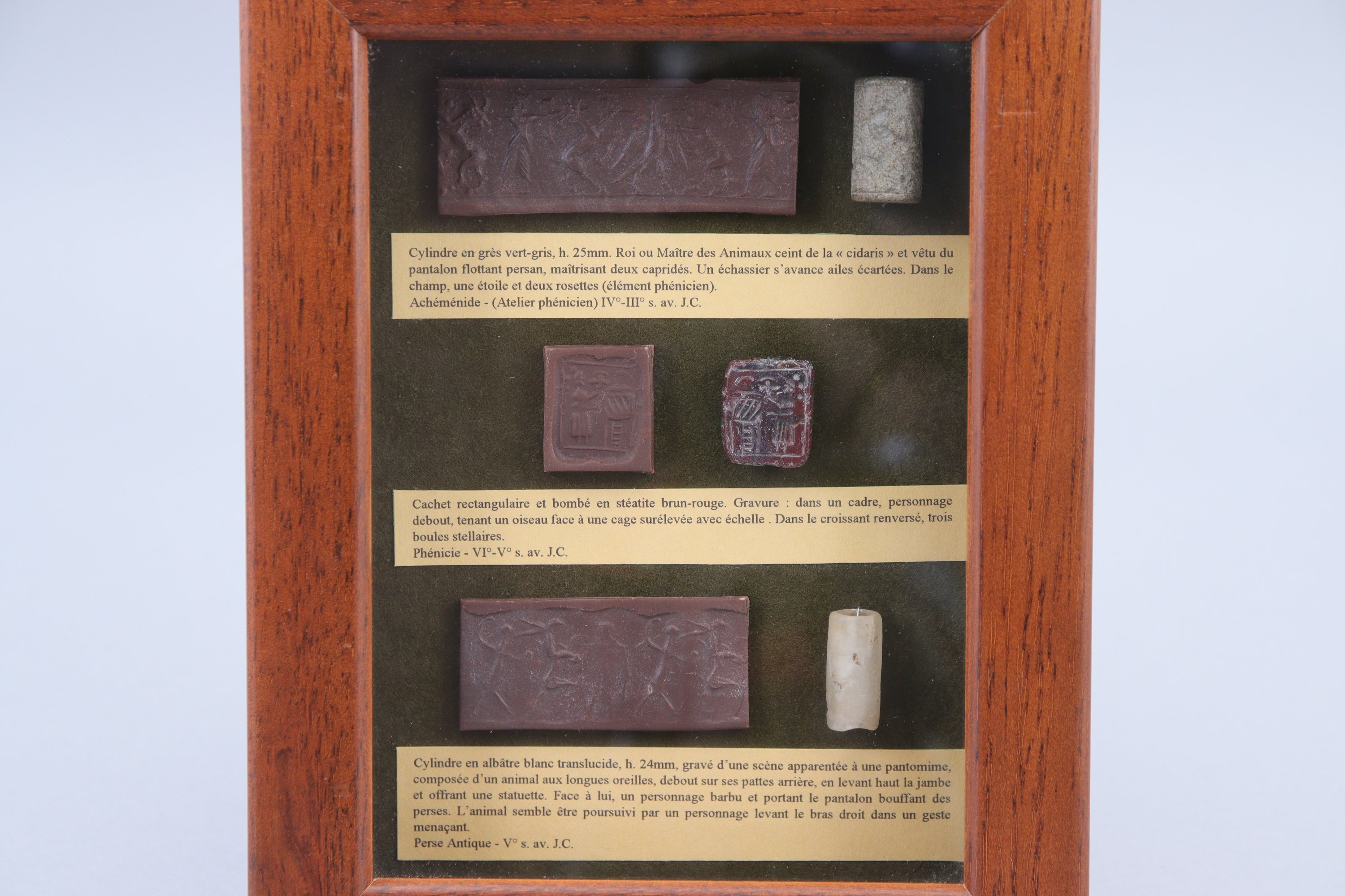 en pierre, avec leurs empreintes et descriptions, disposés dans un cadre en bois.