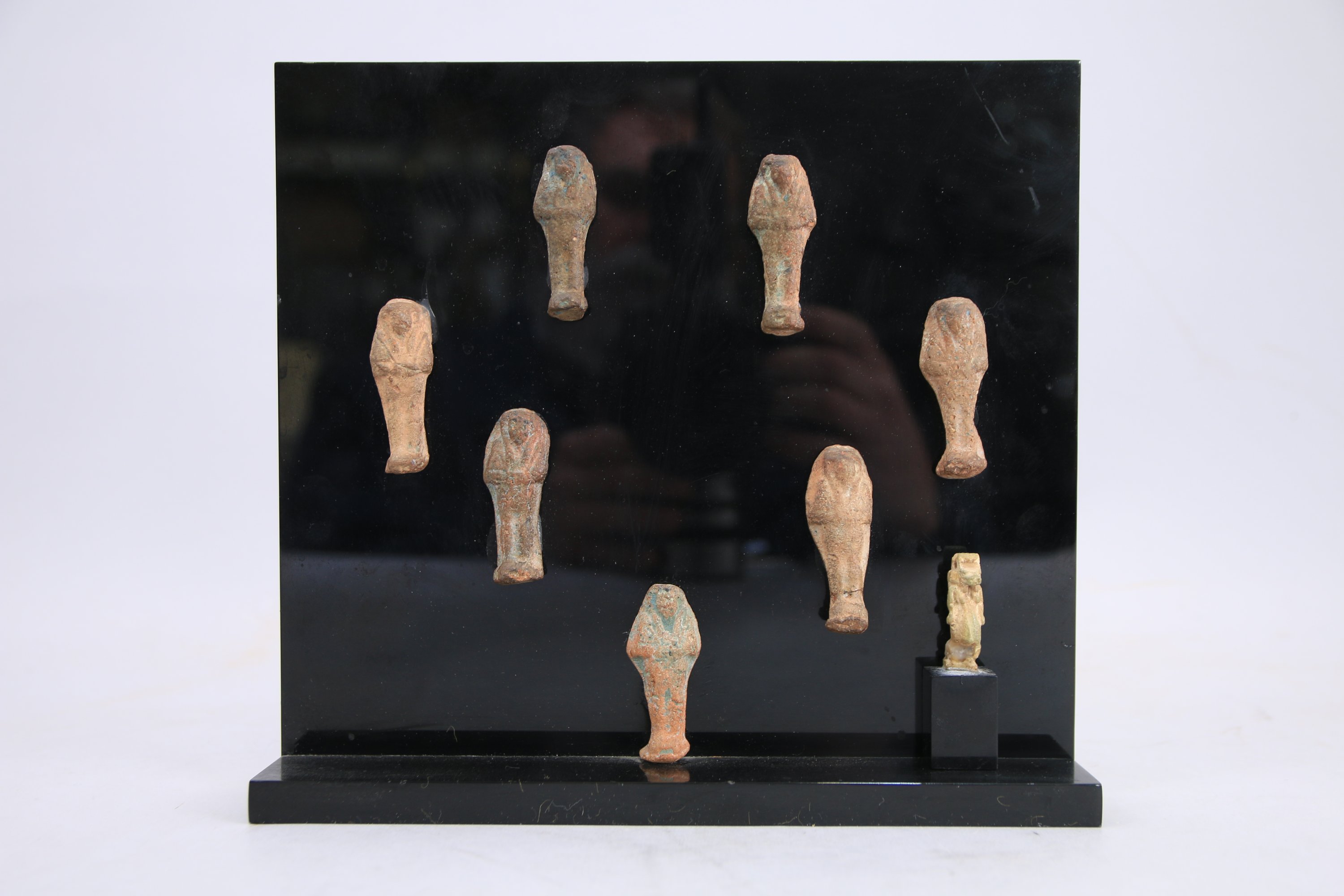 en terre cuite, avec des traces de pigments verts, disposées sur un présentoir vertical.