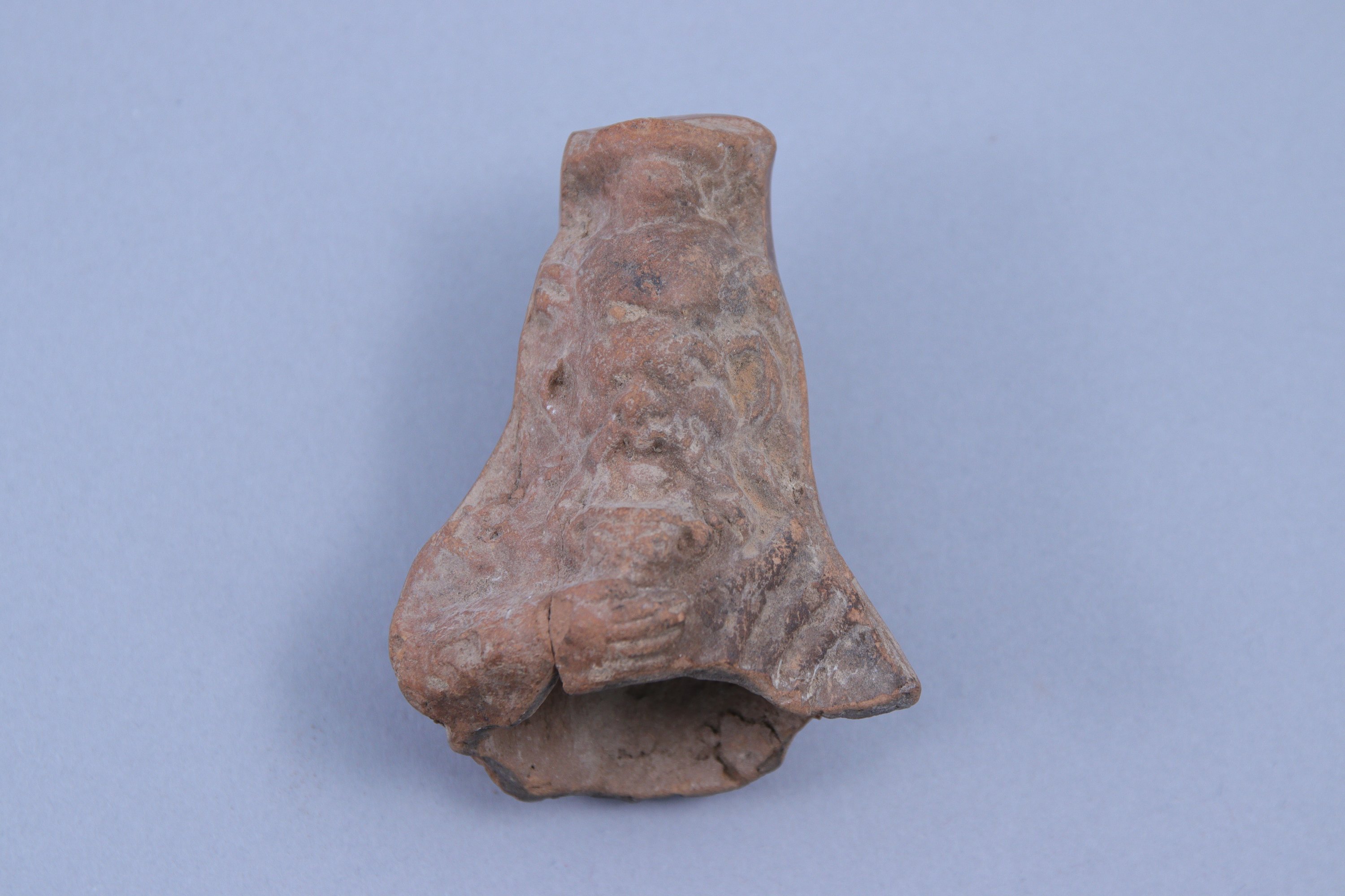en terre cuite. Une tête dIsis avec sa coiffe caractéristique et un silène barbu portant un canthare à ses lèvres.