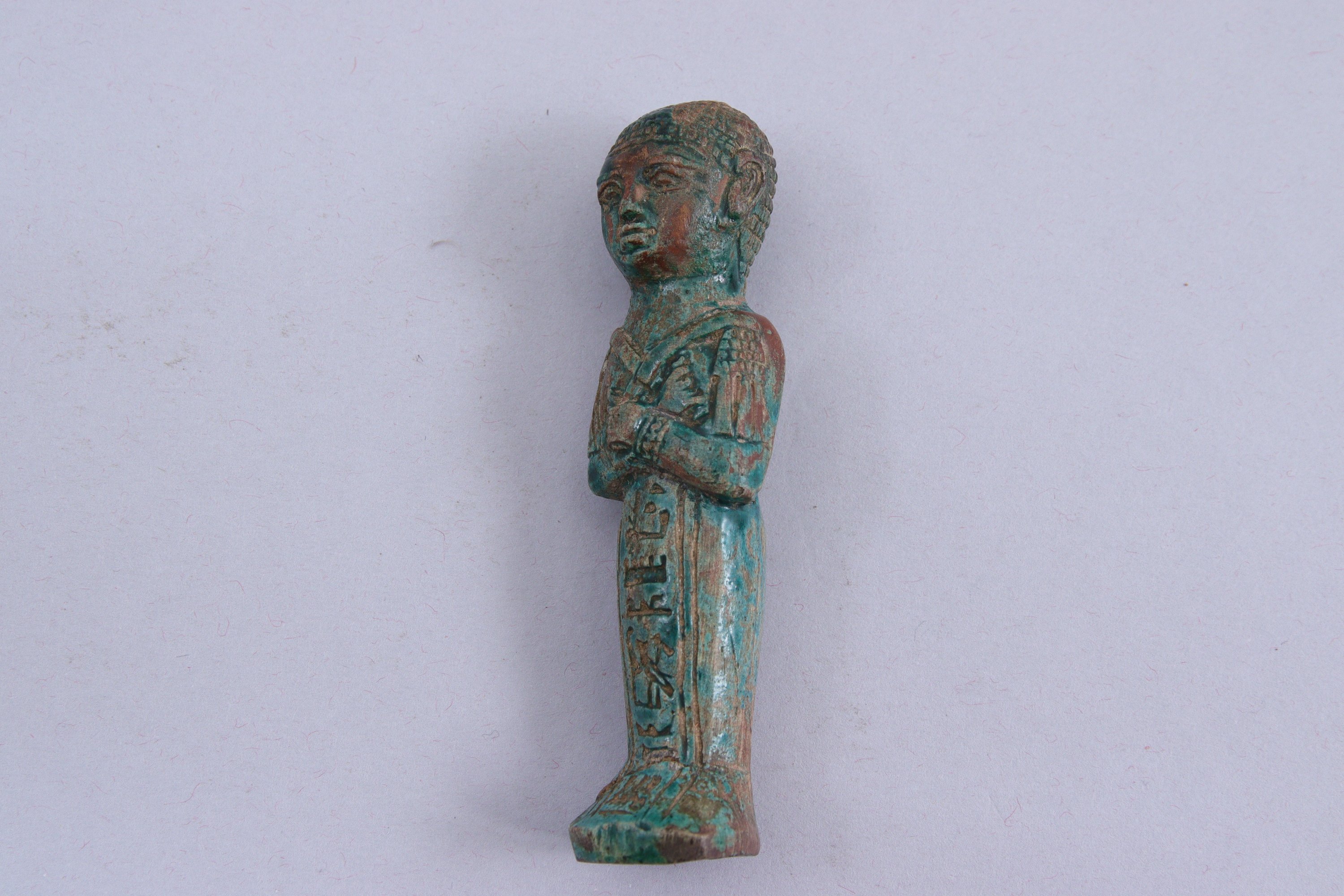 en terre cuite émaillée verte, représentant un personnage muni d'instruments aratoires et gravé de hiéroglyphes.