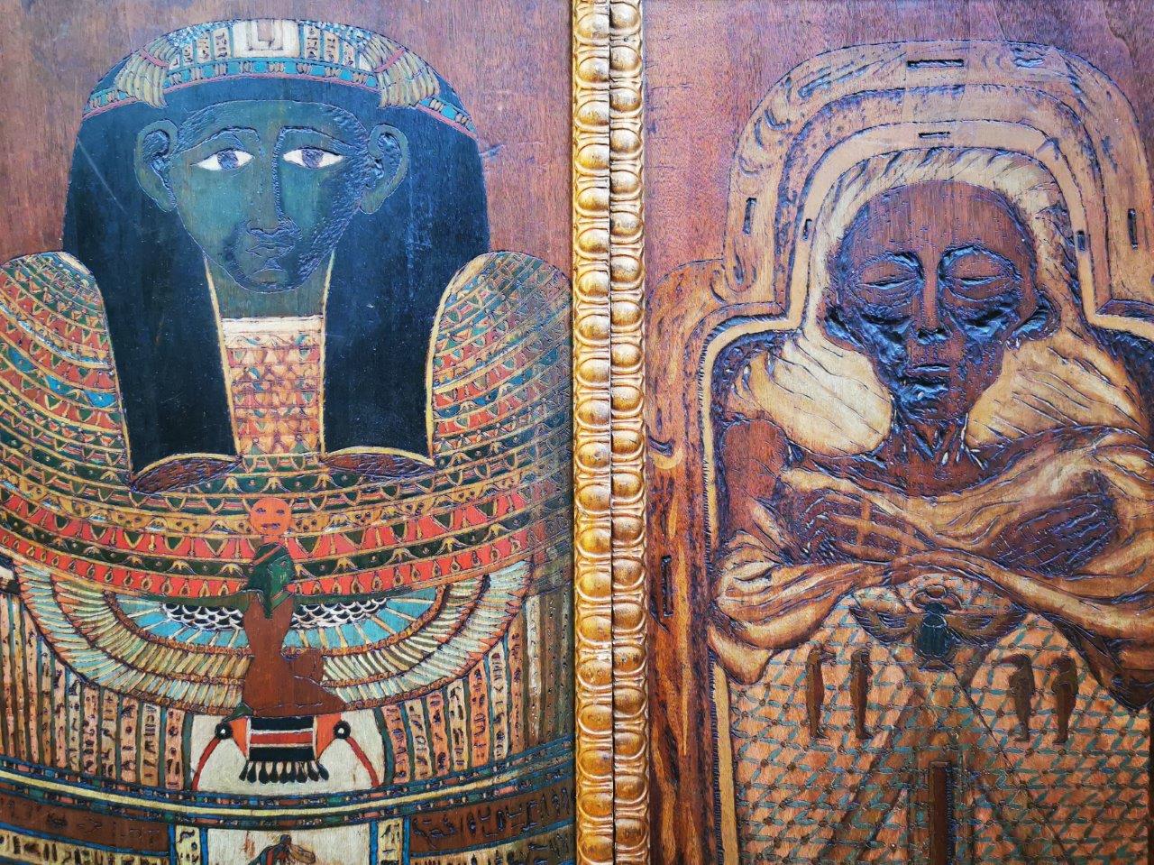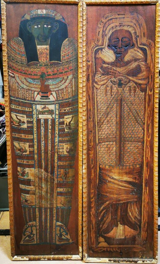 Paire de panneaux en bois pyrogravé et décor polychrome figurant le couvercle d'un sarcophage et le sarcophage ouvert avec sa momie.