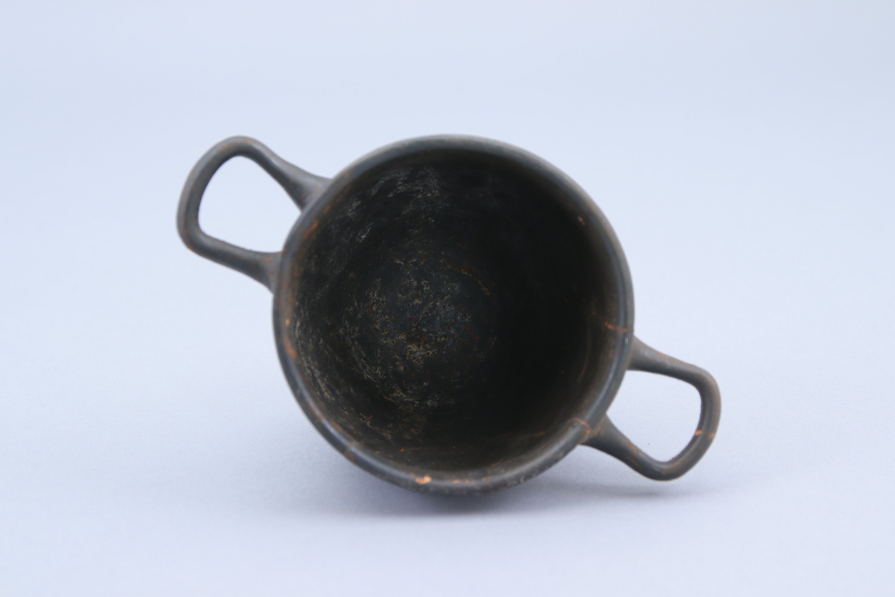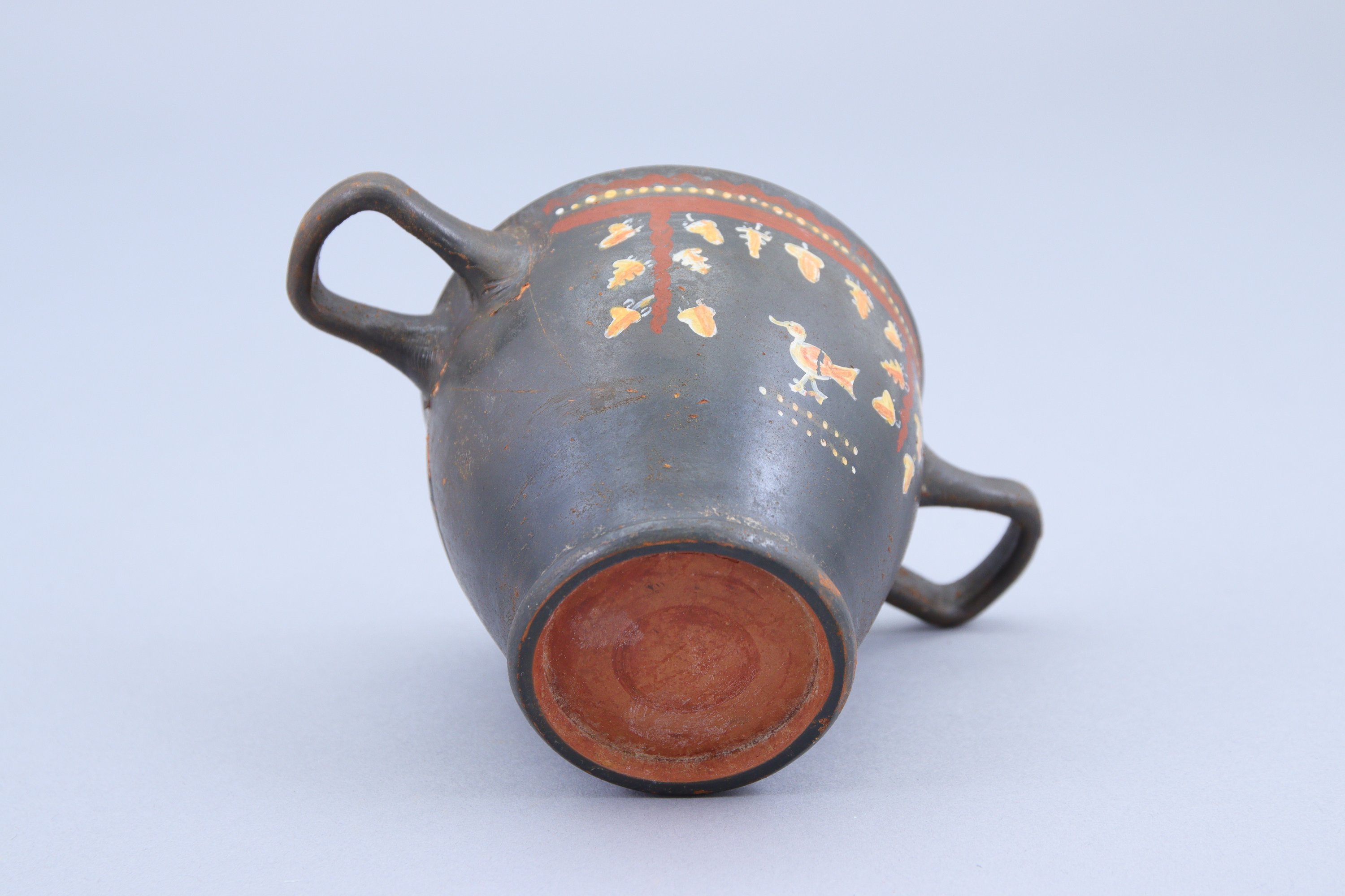 en céramique à vernis noir surpeinte dans le style de Gnathia, figurant un oiseau sous une treille de vigne, en rehauts blanc, jaune et rouge.