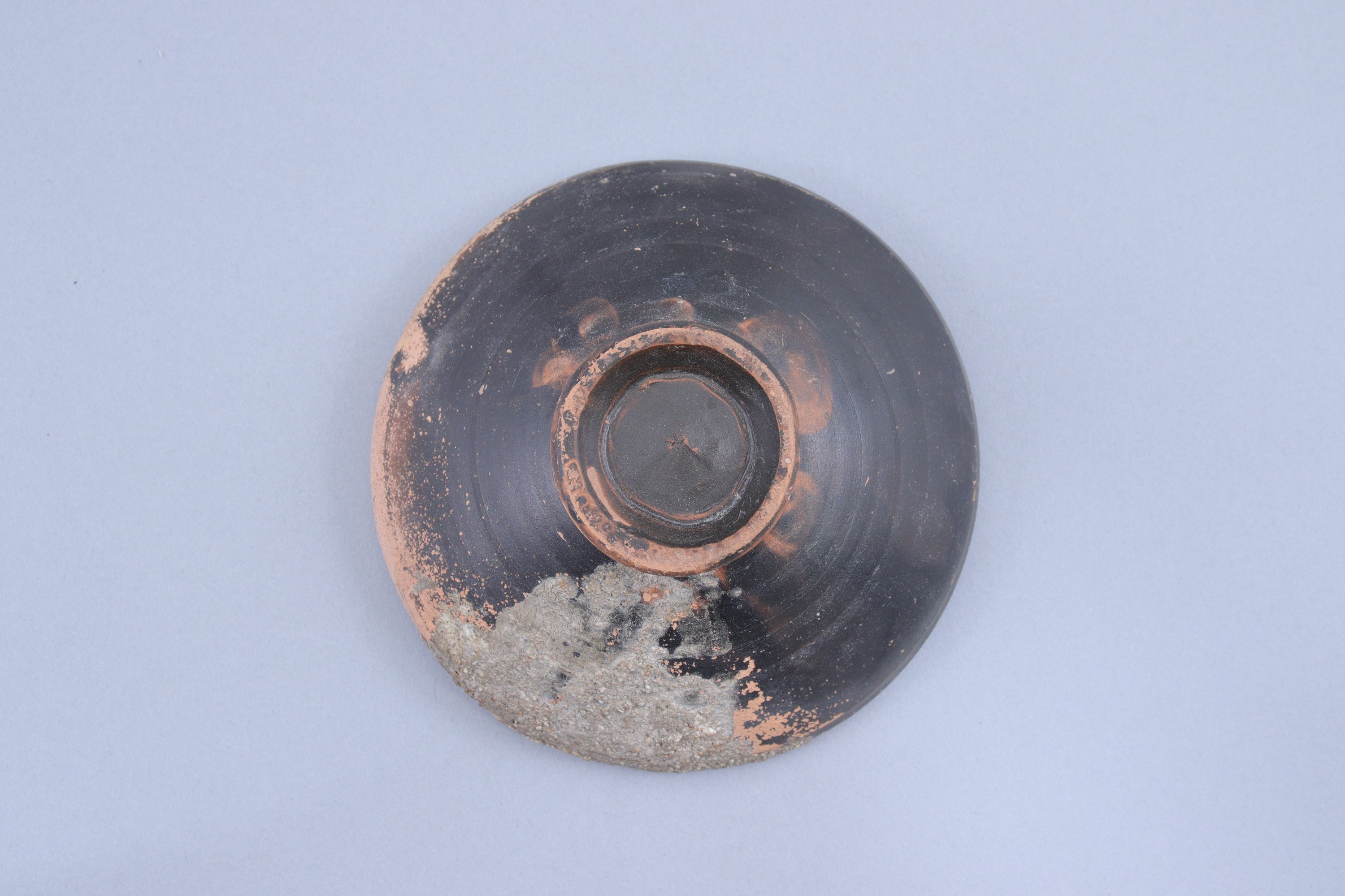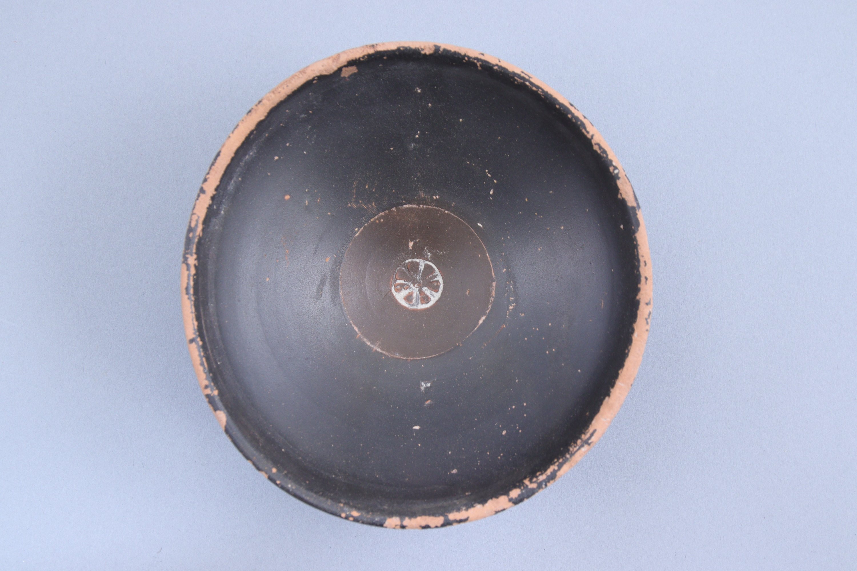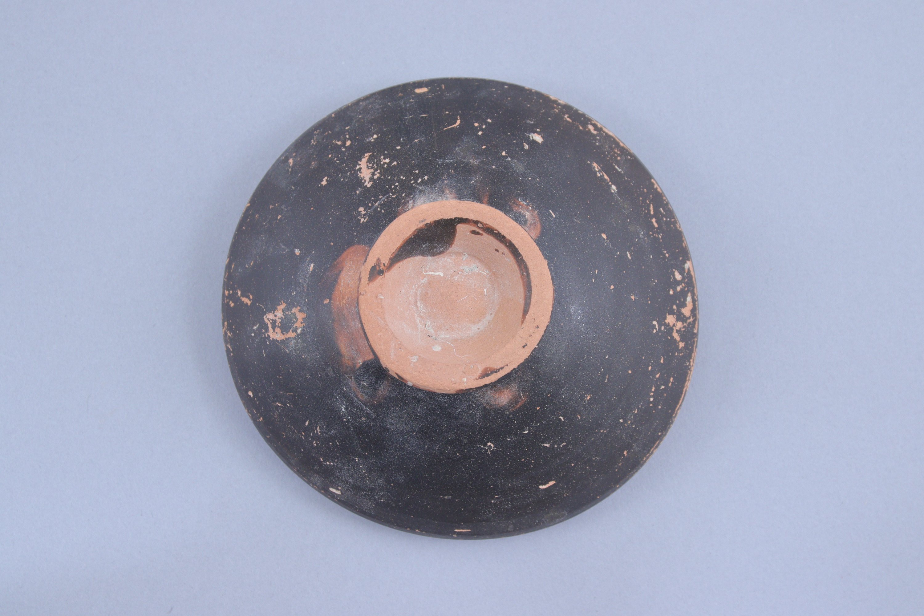 en céramique campanienne à vernis noir et fond brun, ornées dune rosette.