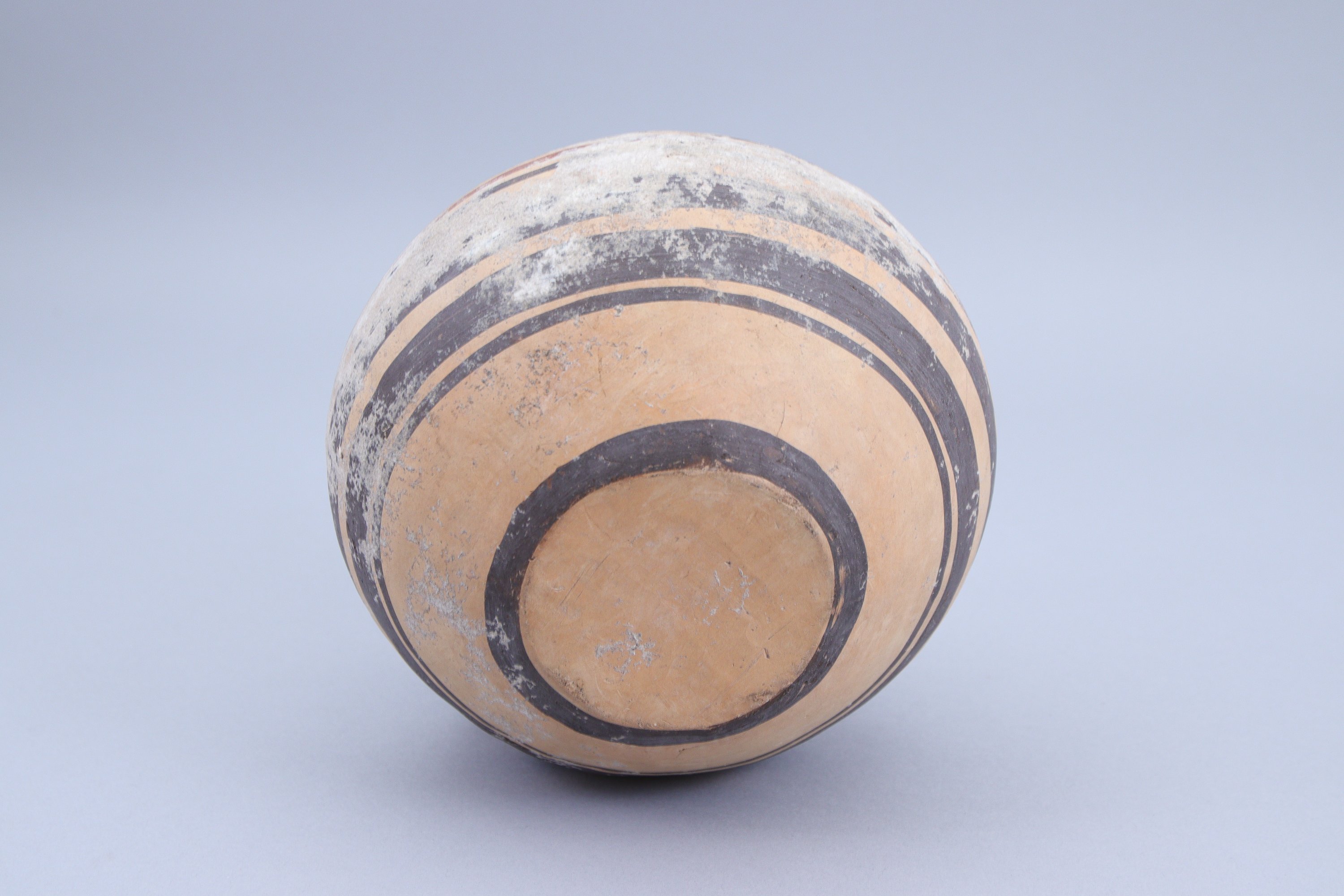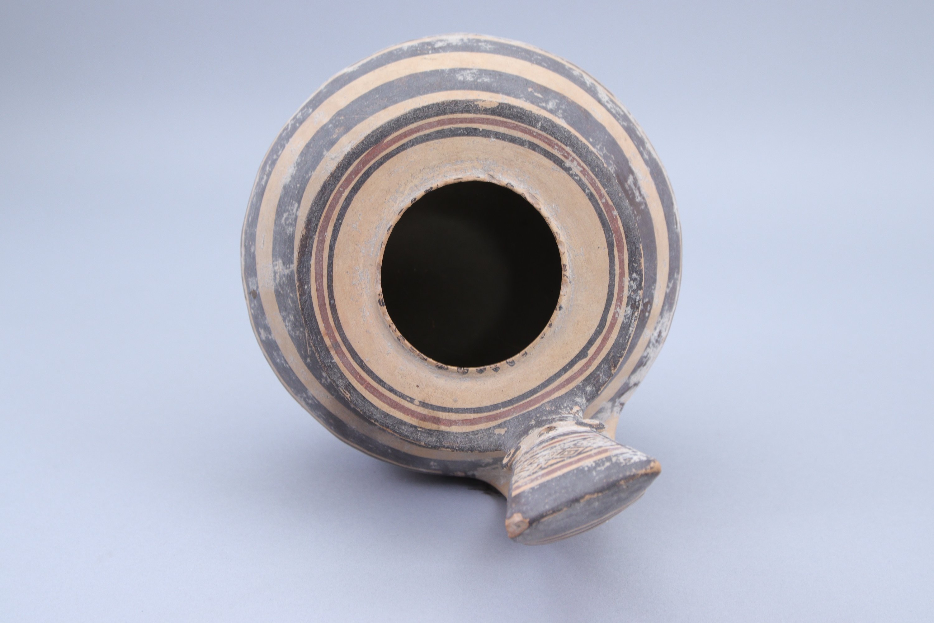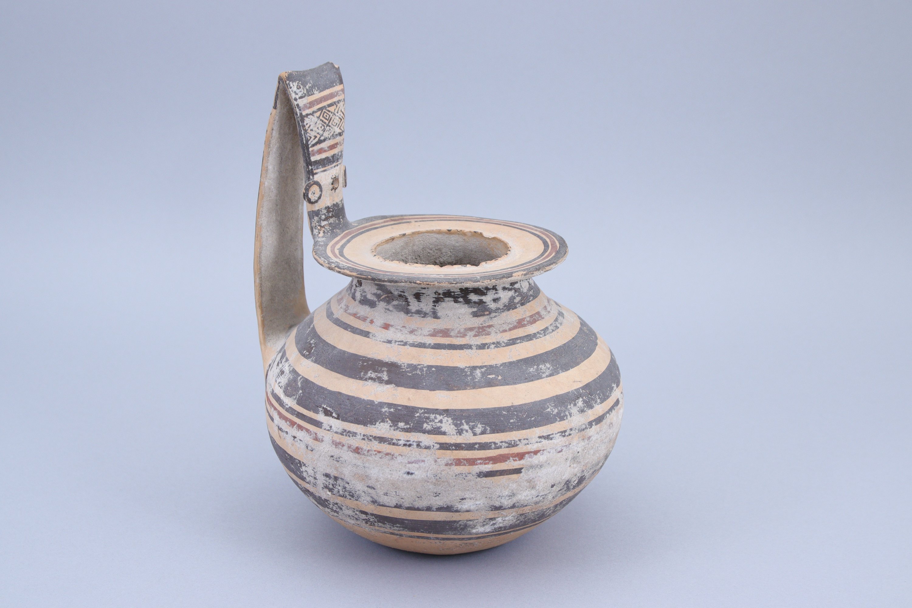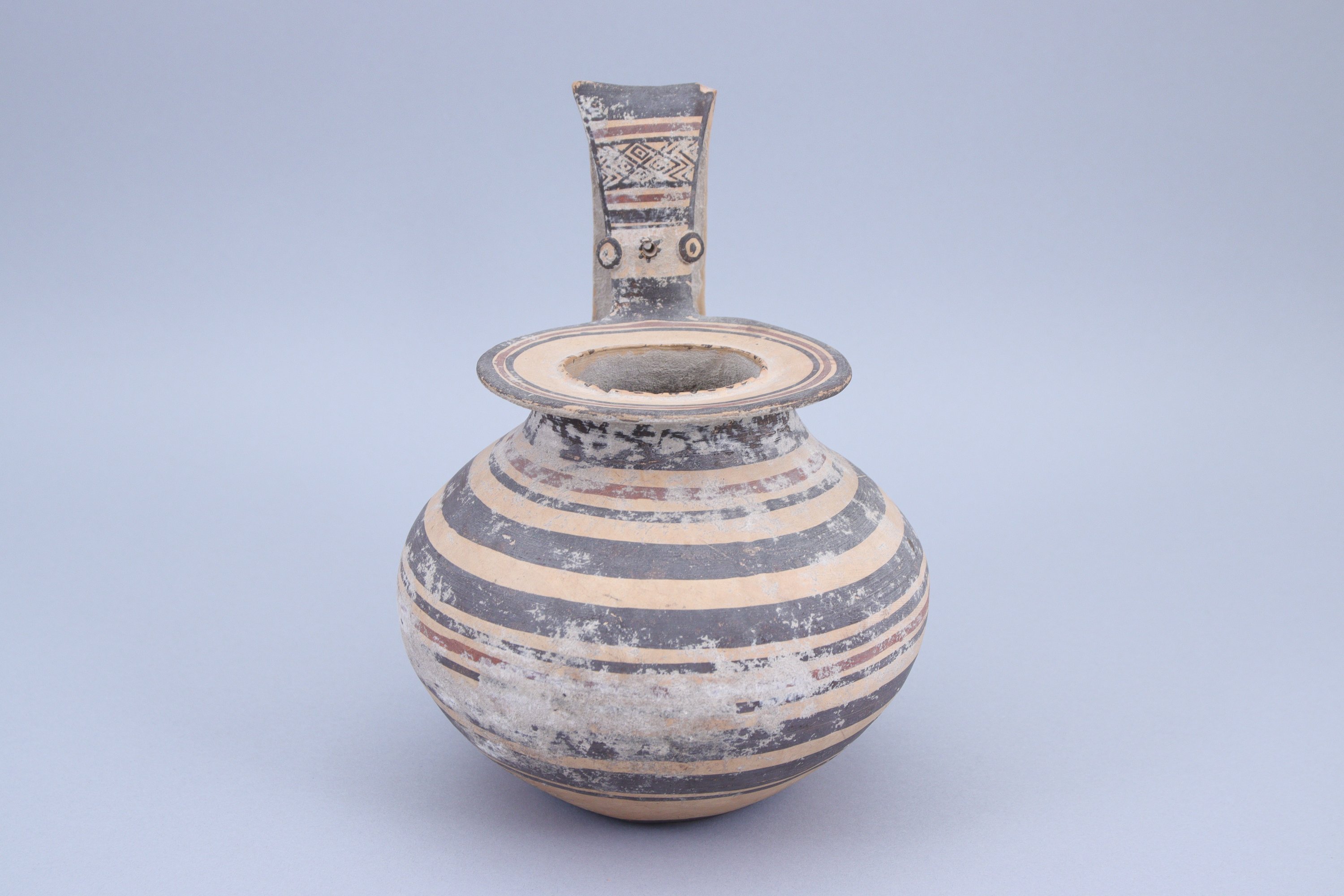 à panse globulaire décorée de cercles noirs et rouges. Elle est pourvue dune haute anse verticale percée dun petit trou, décorée de deux pastilles en applique et peinte dun décor géométrique.