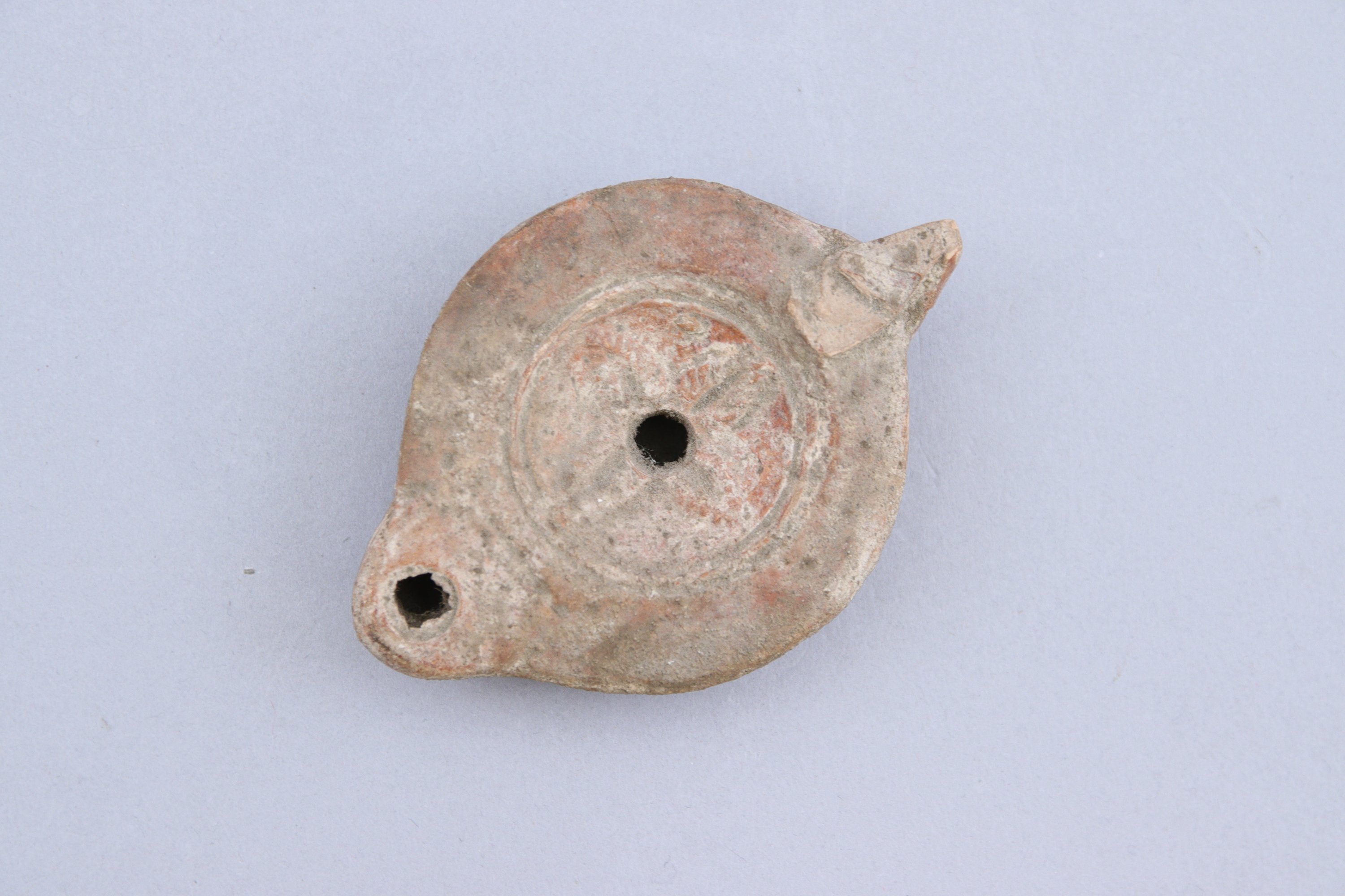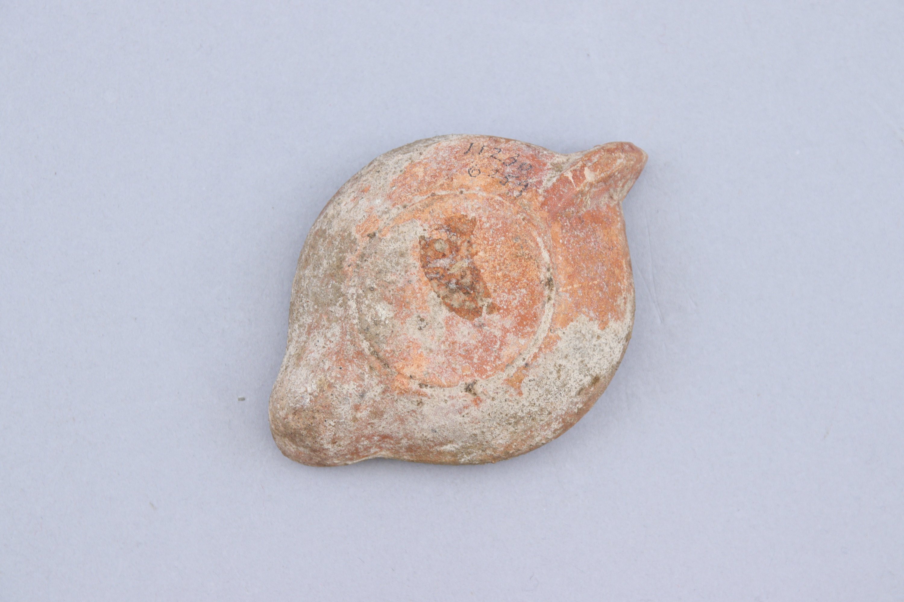 - Une lampe islamique avec un décor de traits incisés. Long. 8 cm.