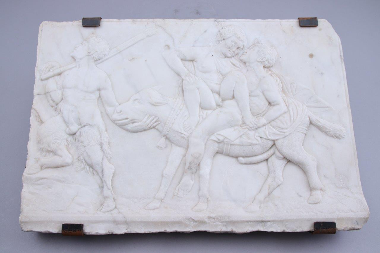 en marbre, à la manière d’un cortège dionysiaque: un satyre muni d’une torche conduit un âne sur lequel un homme et une femme s’accouplent.