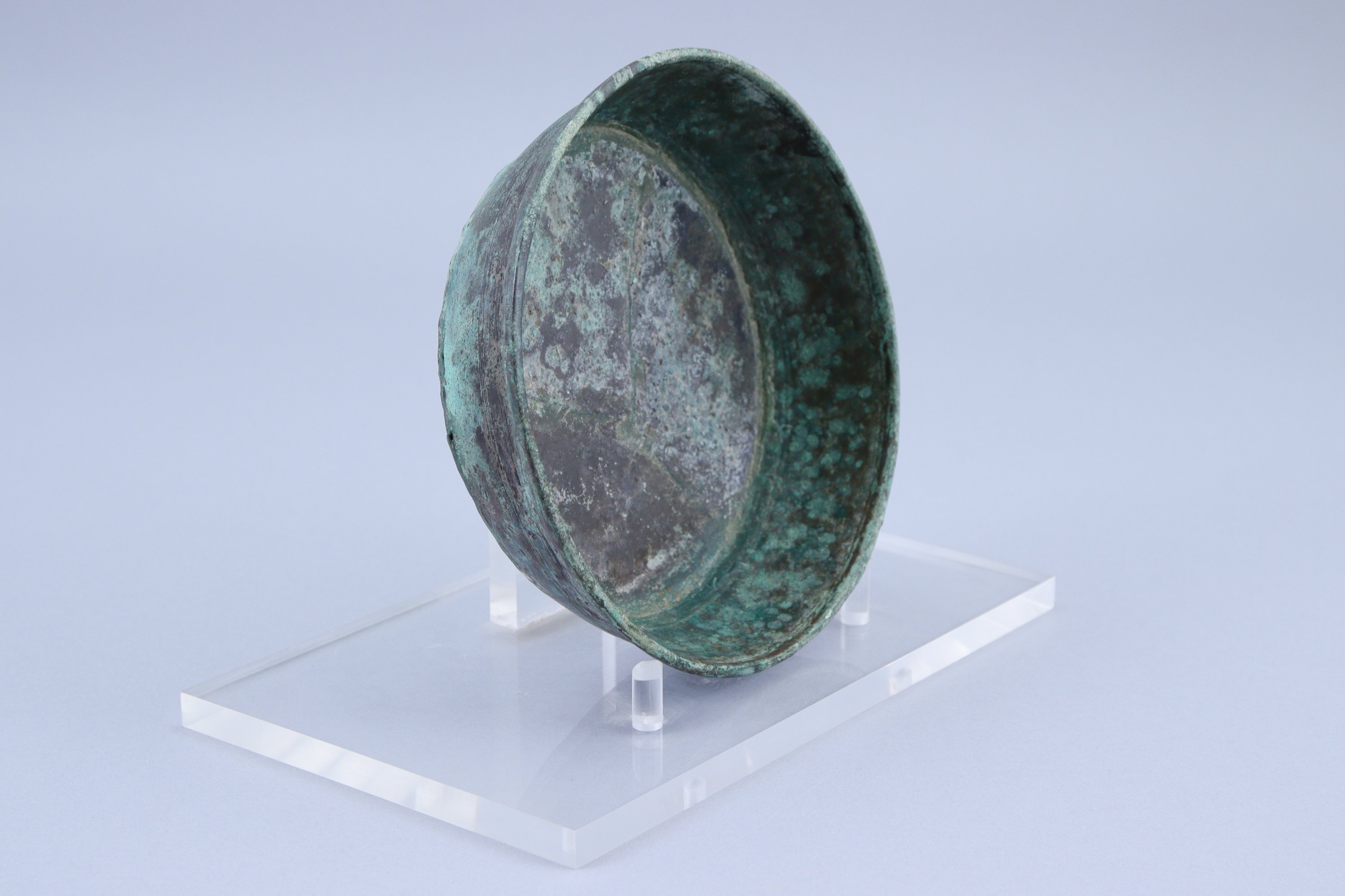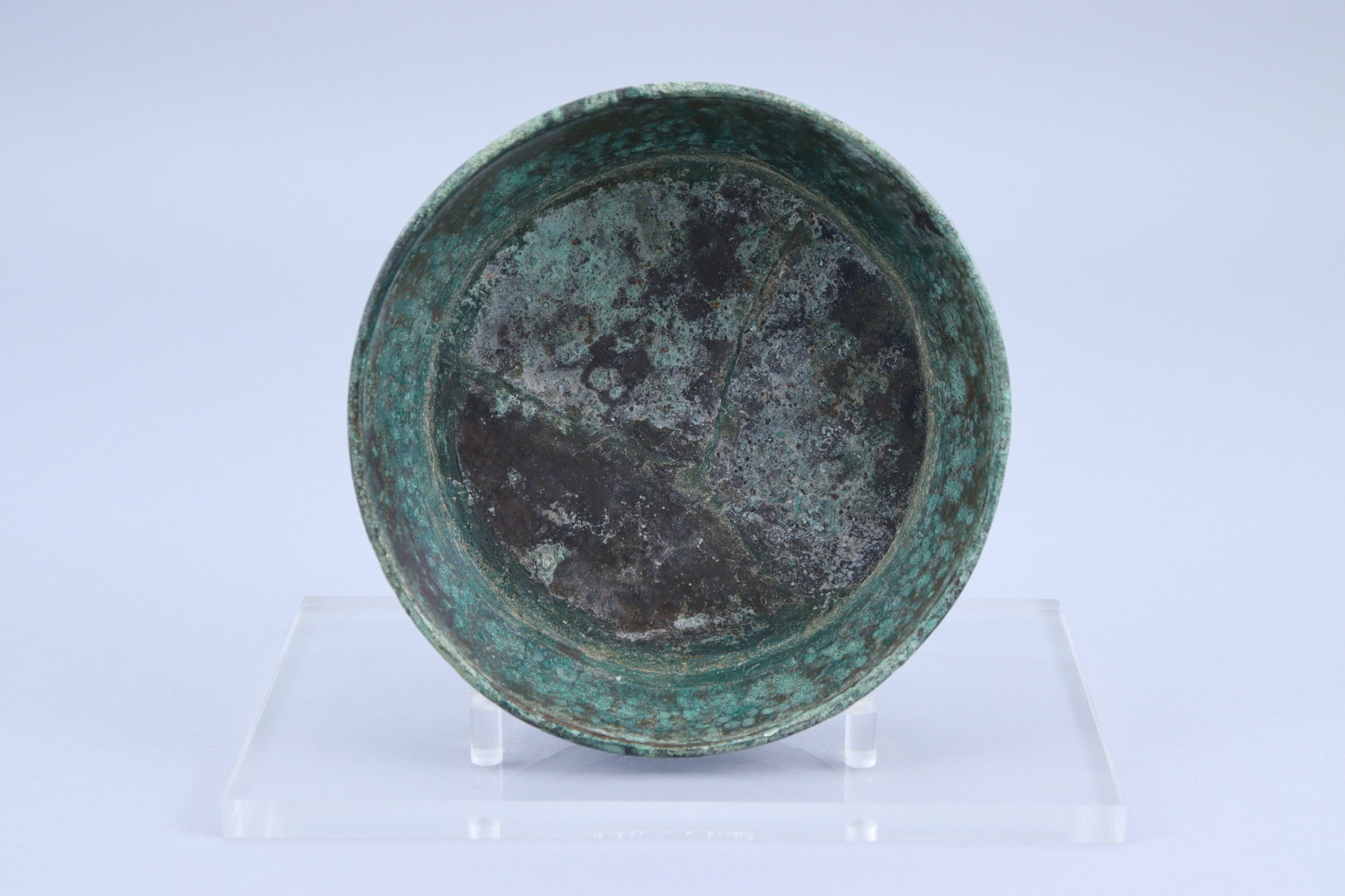 en bronze à patine verte, l’extérieur décoré de bandes en creux.