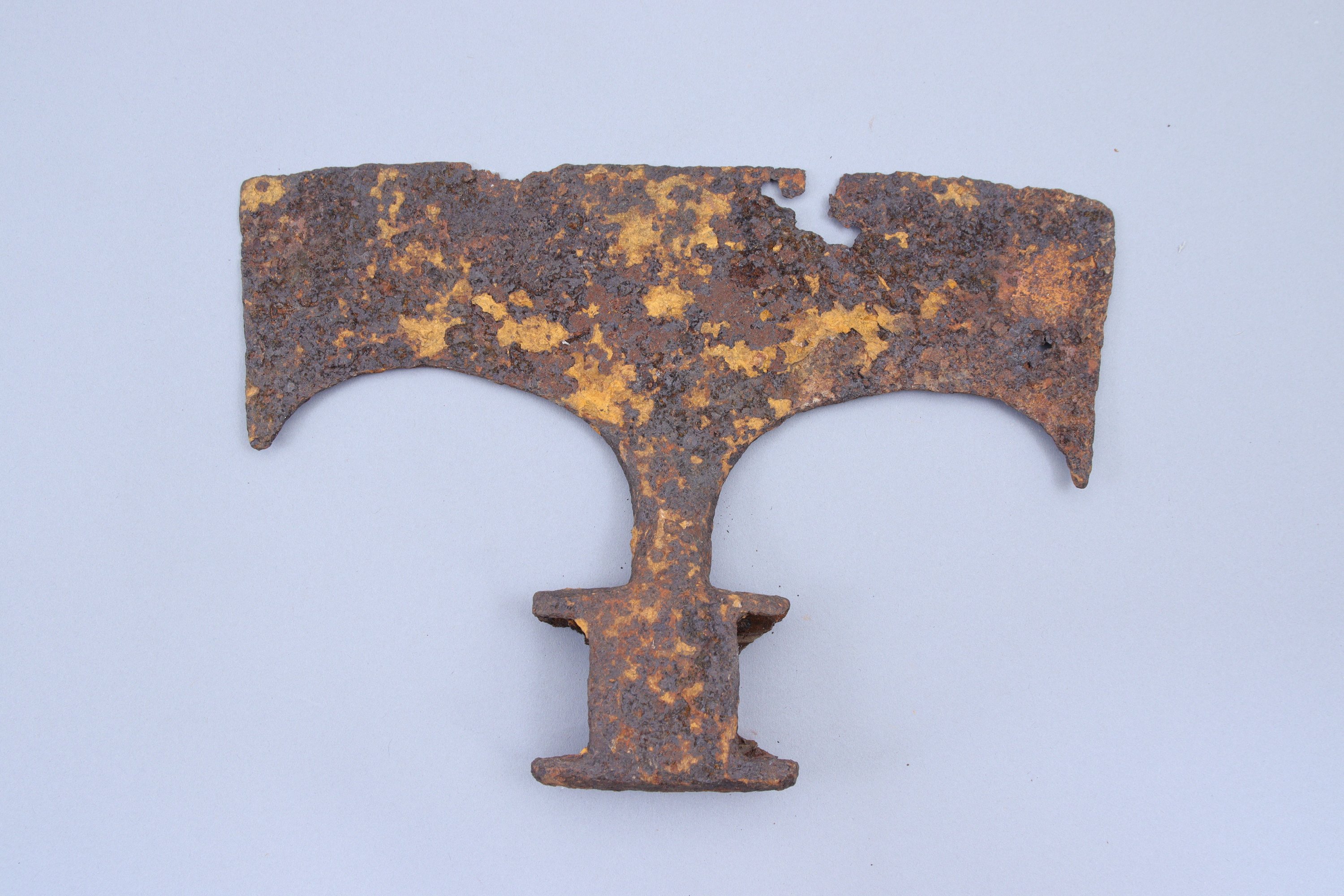 en fer, à large tranchant et à dos plat découpé sur douille en « H ».