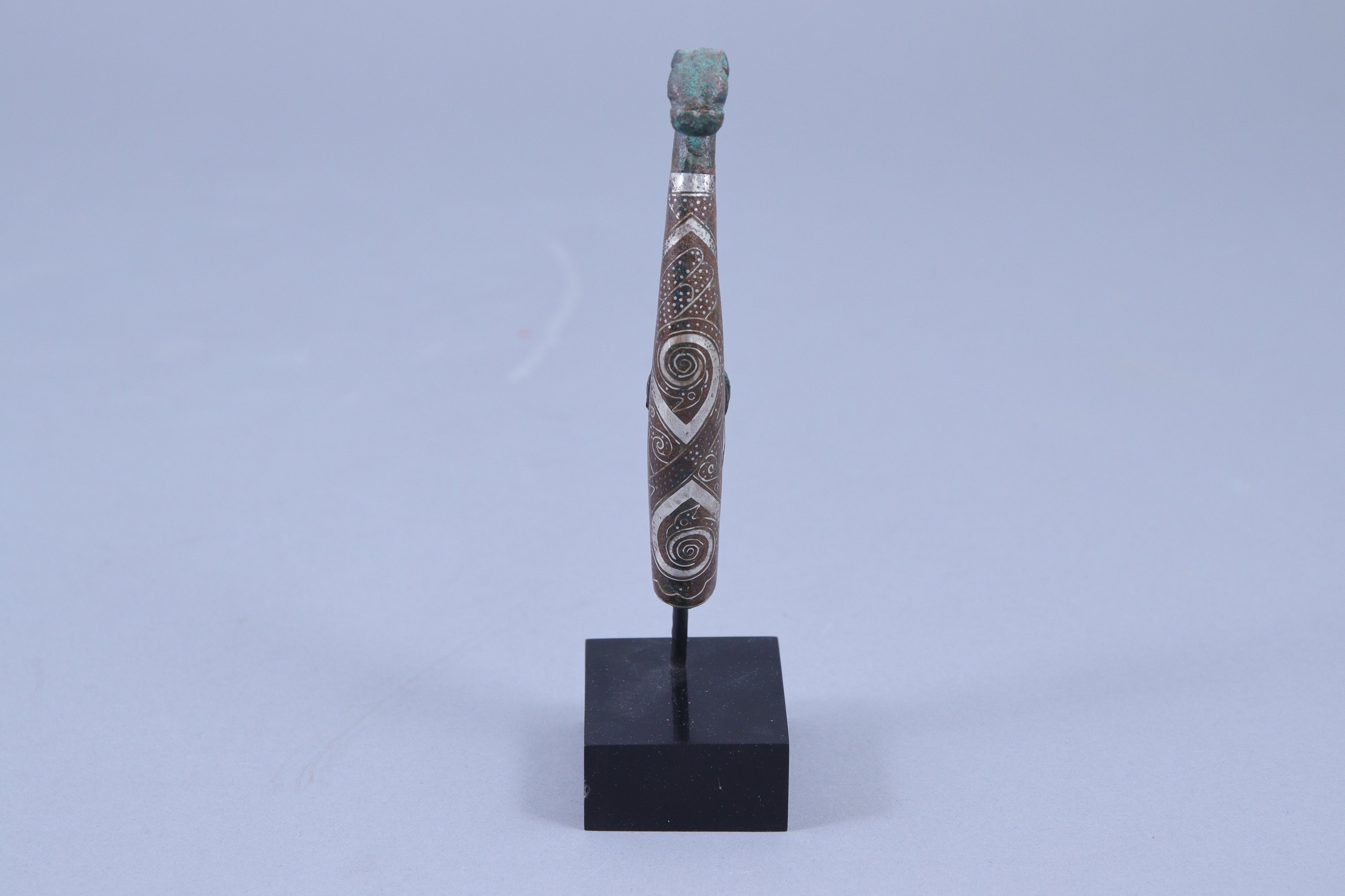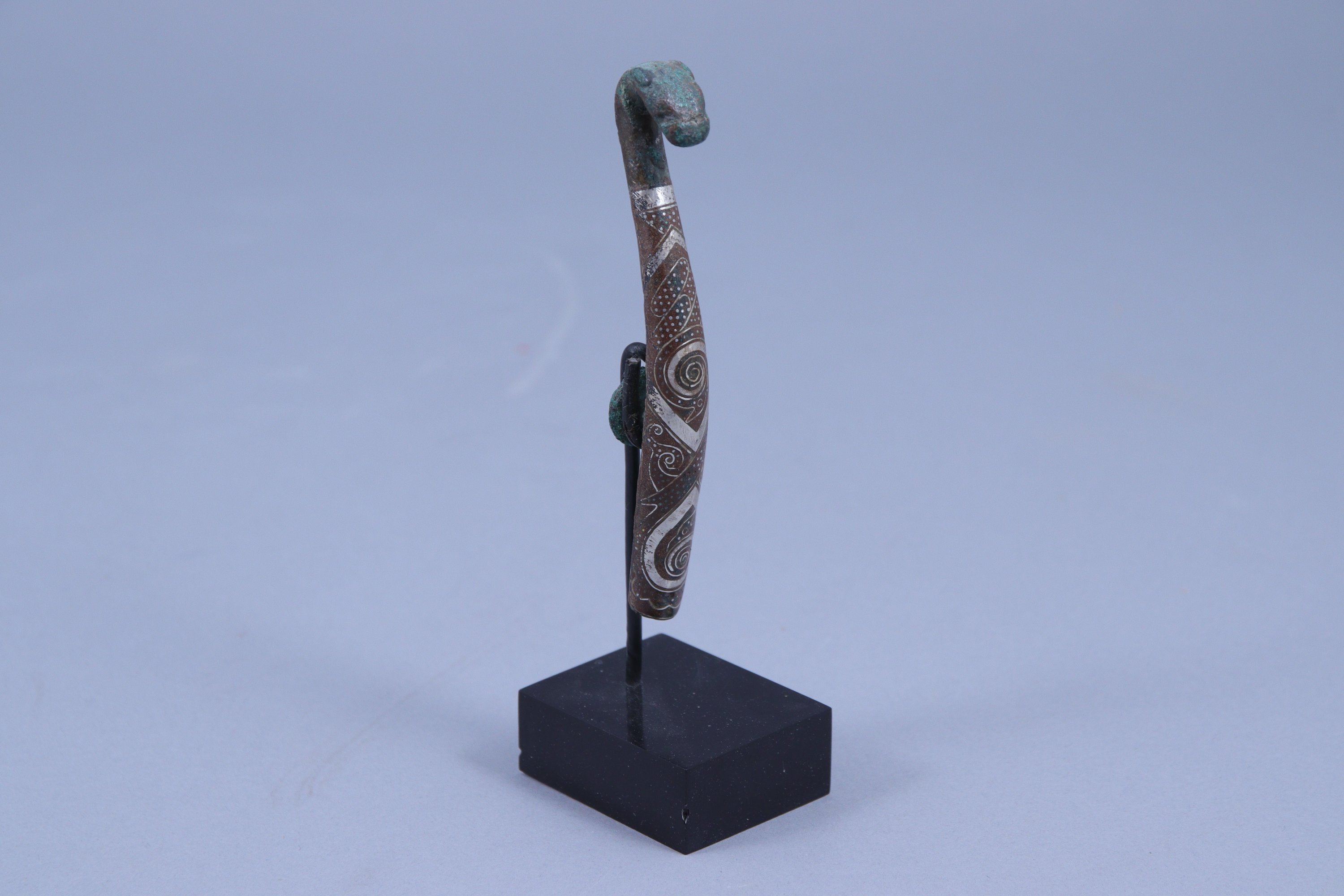 en bronze et fibule en bronze incrusté de fils d'argent, à décor de serpents lovés.