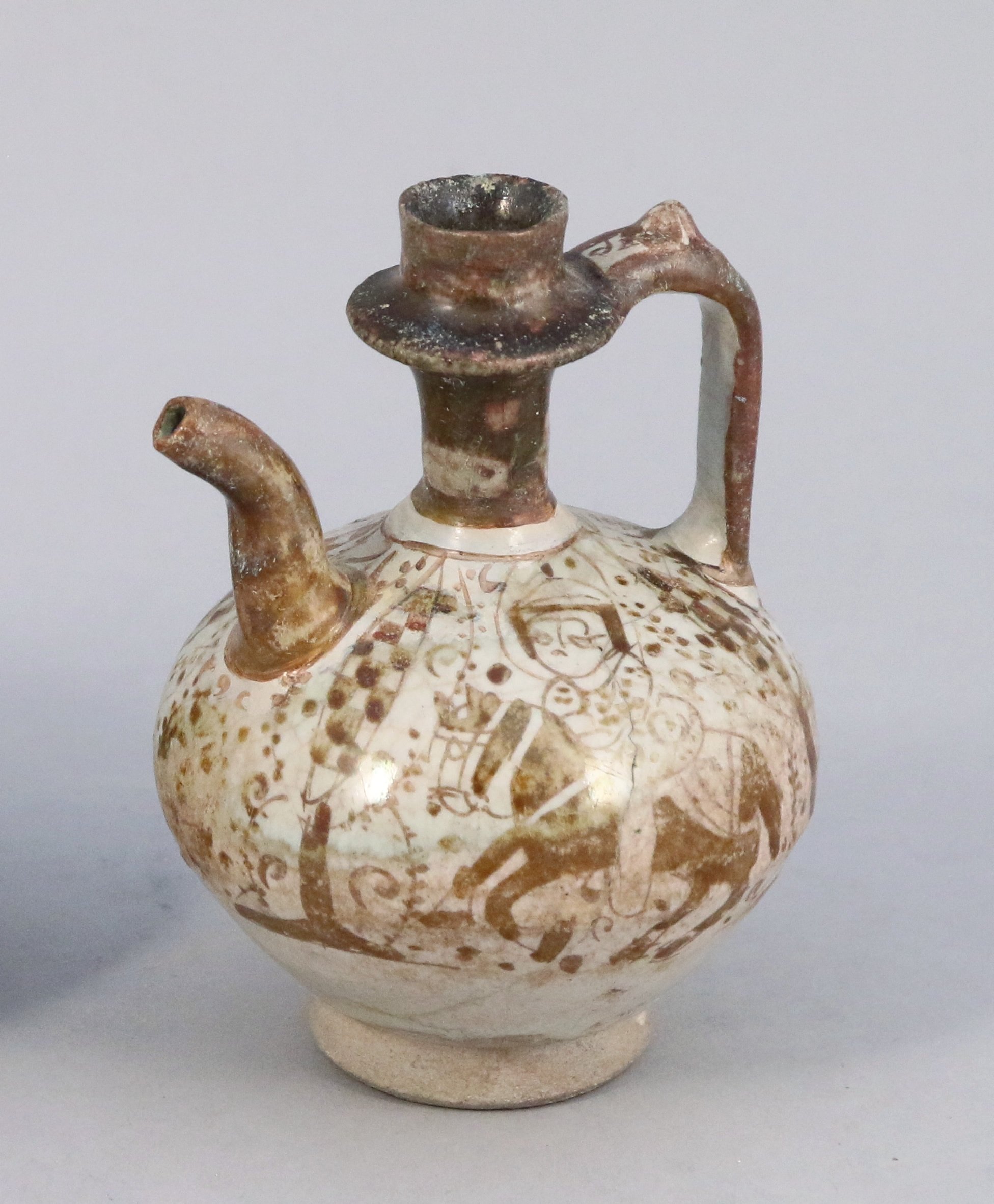 en céramique siliceuse, à décor de lustre métallique, panse globulaire sur petit pied cylindrique, reliée par une anse droite à un col cylindrique à anneau et dotée dun bec cylindrique coudé. Décor peint sur la panse de cavaliers dans un paysage.