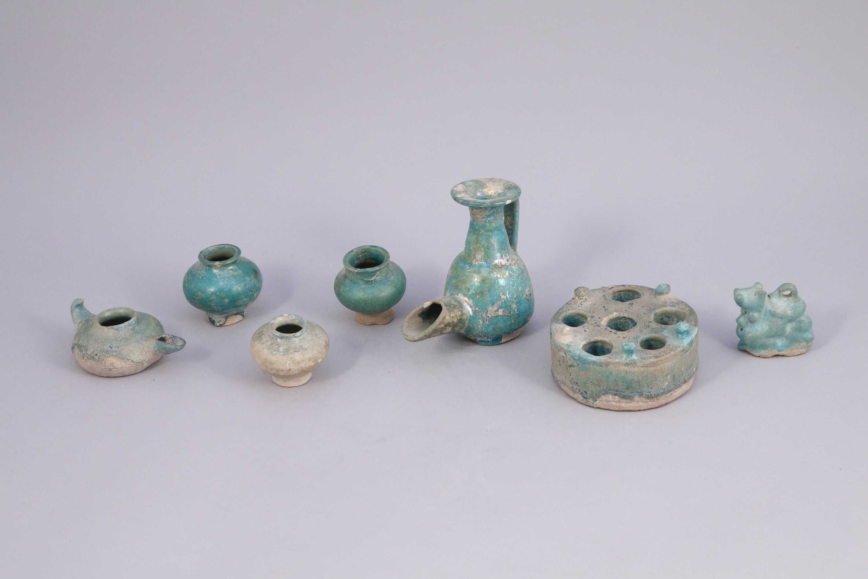 Joint: Iran ou Syrie, XIIe-XIIIe siècle. Ensemble de sept céramiques à glaçure turquoise en céramique siliceuse à glaçure turquoise, deux lampes à huile, trois petits pots globulaires, une ronde-bosse animalière avec anneau de suspension, un support cylindrique à 6 réceptacles circulaires. Haut. vases: 5 à 5,5 cm. Long. lampe à huile:11 cm. Haut. biberon à bec verseur: 11,5 cm. Diam. récipient à six trous: 10,5 cm. (accidents et restaurations)