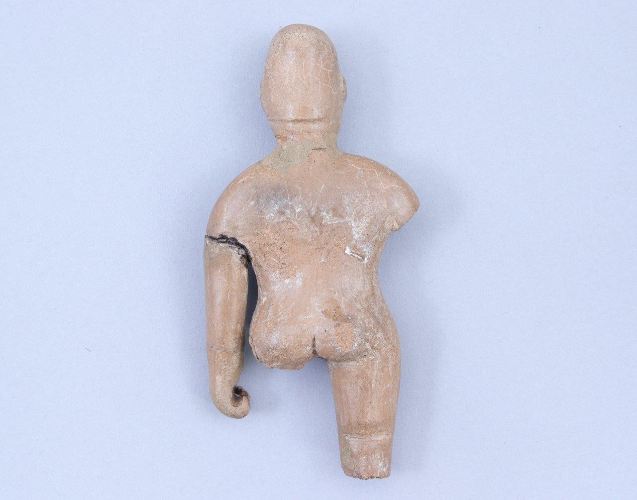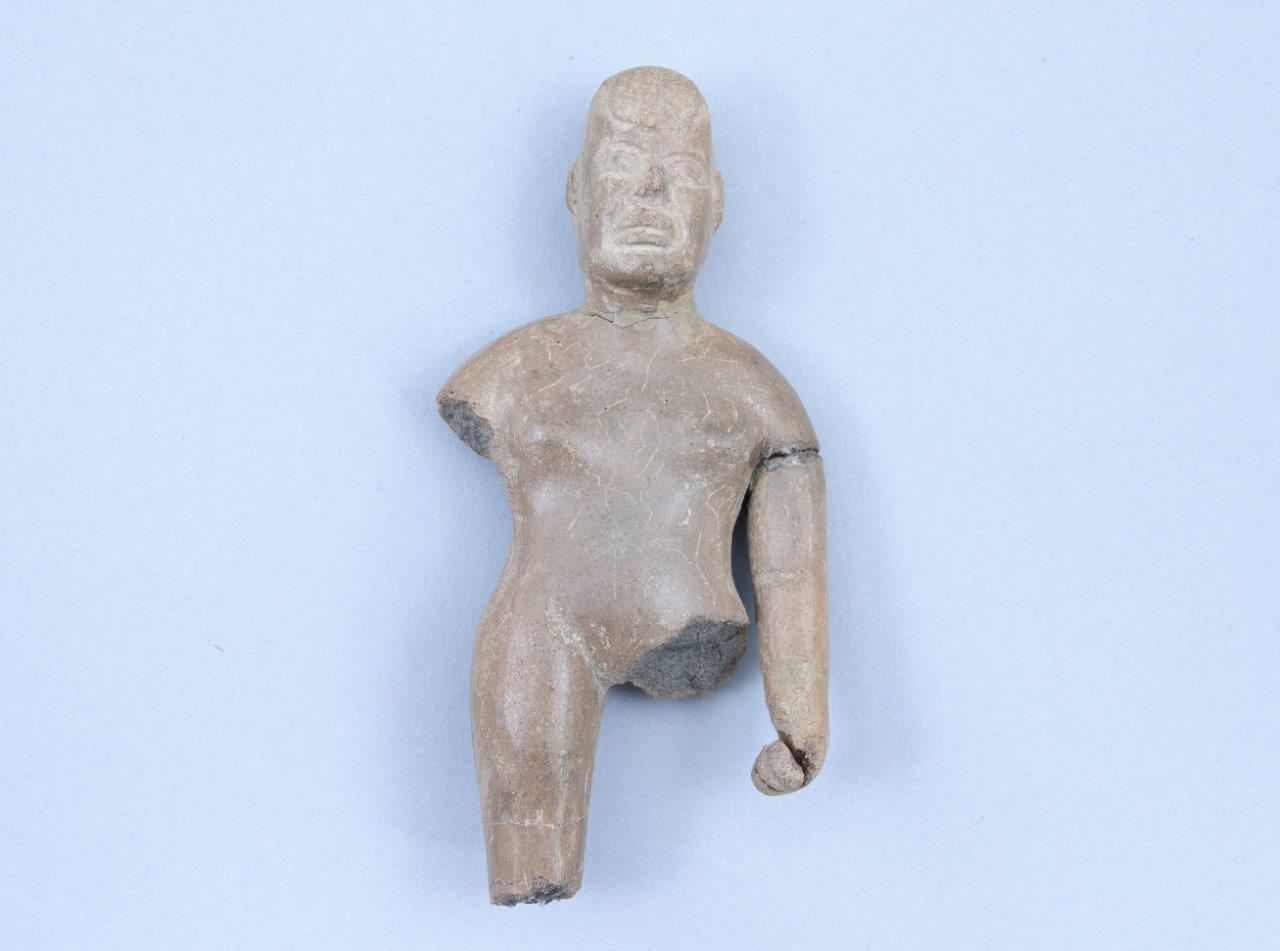 - La figurine en céramique dun homme debout avec un sourire dans la tradition olmèque, Haut. 13,5 cm (collages et manques)
