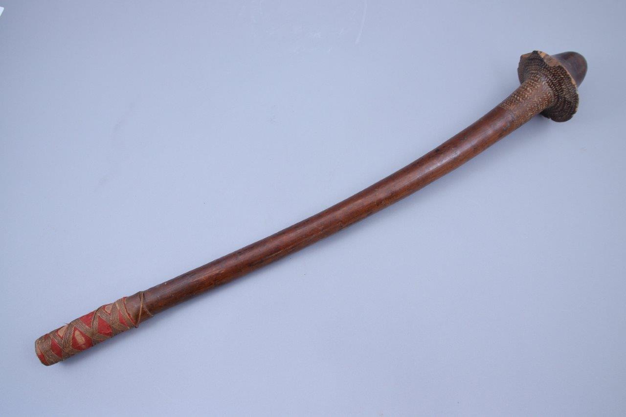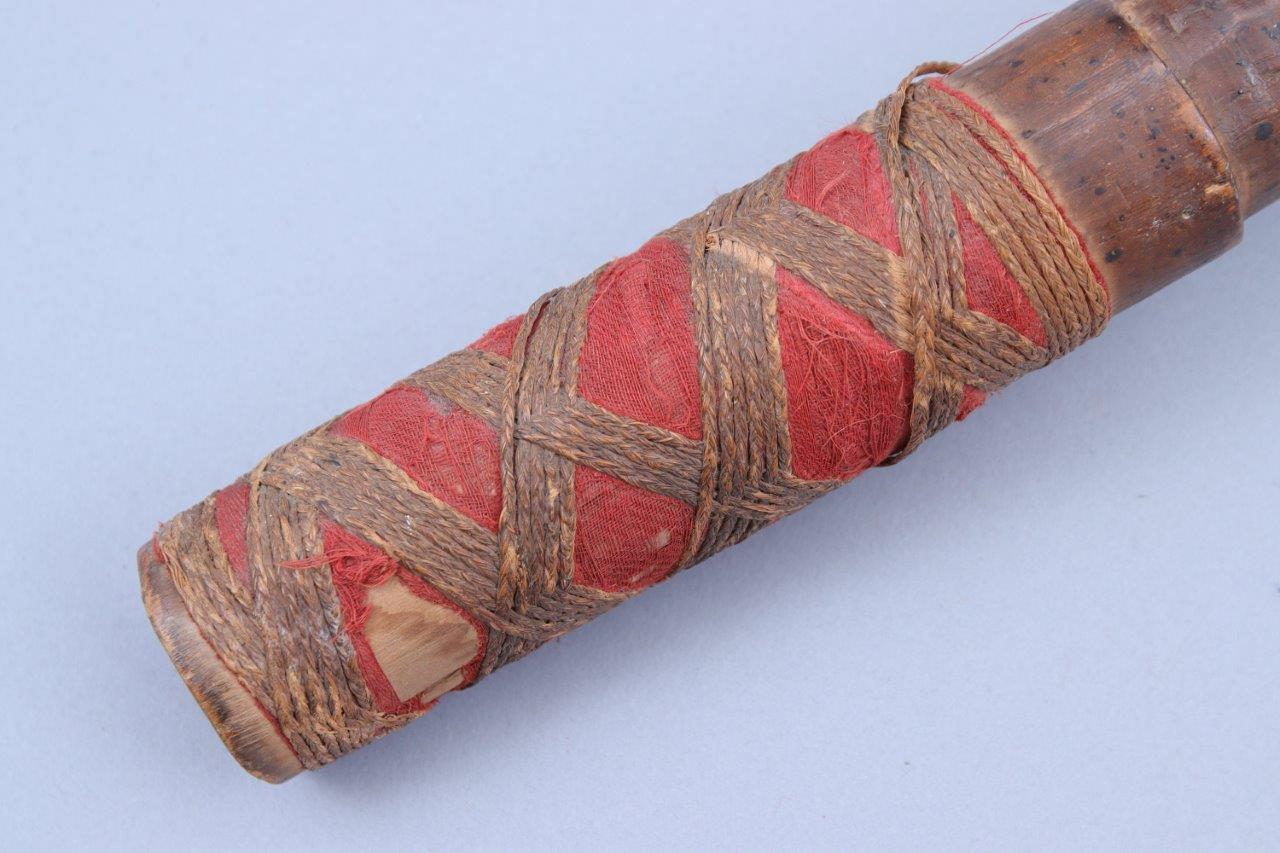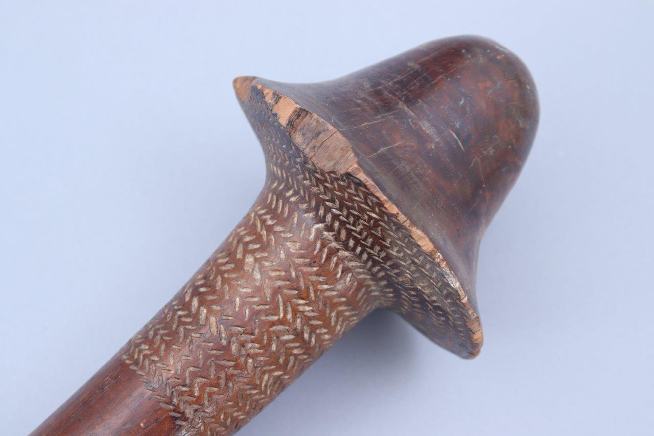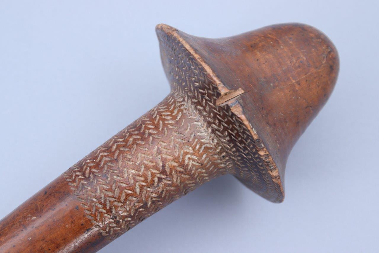 en bois dur à belle patine d'usage brune brillante. Phallomorphe, il est orné de fins décors gravés en pointillés sur la collerette. La prise est gainée de tissus et cordelettes de fibres végétales tressées.
