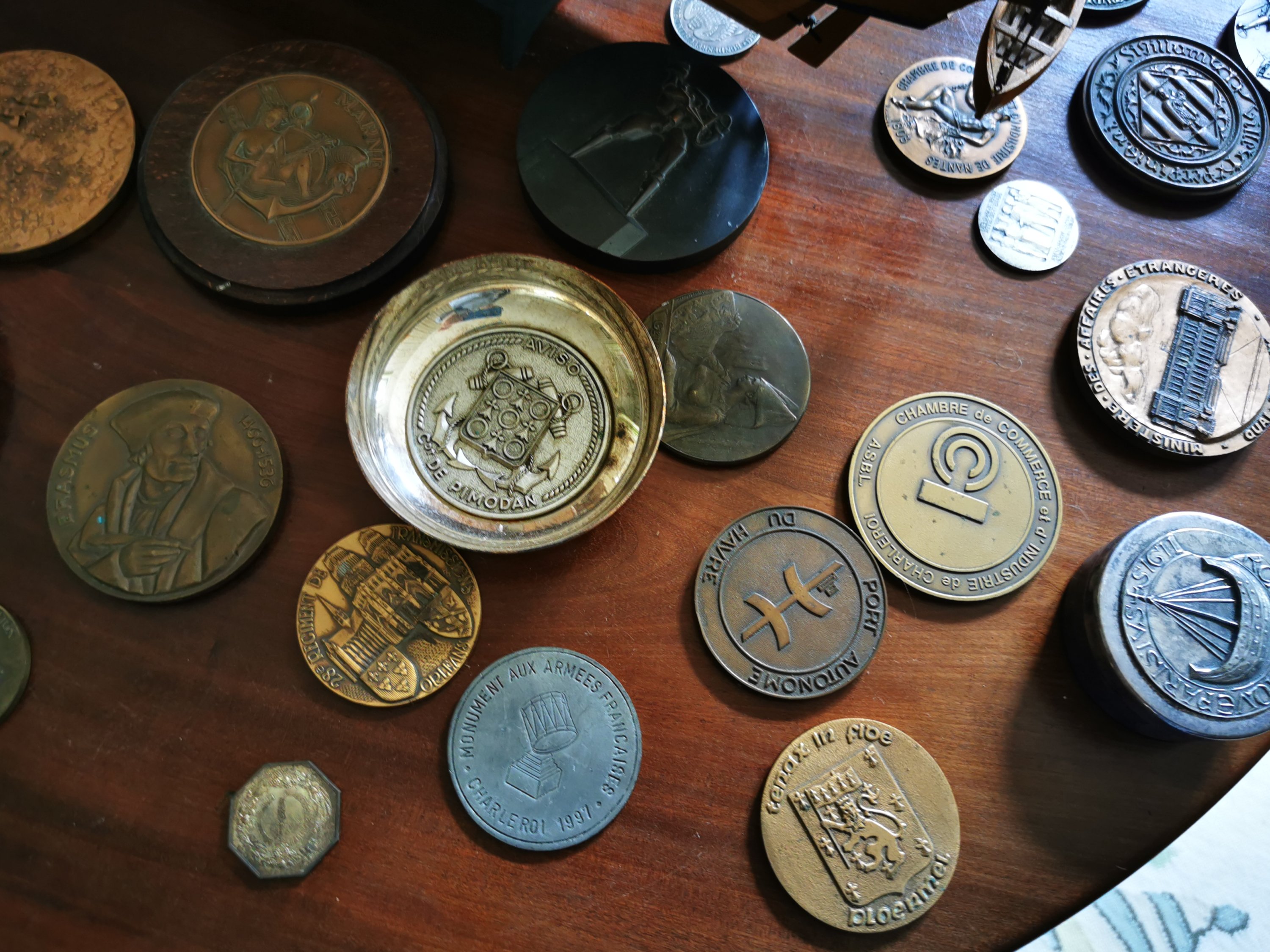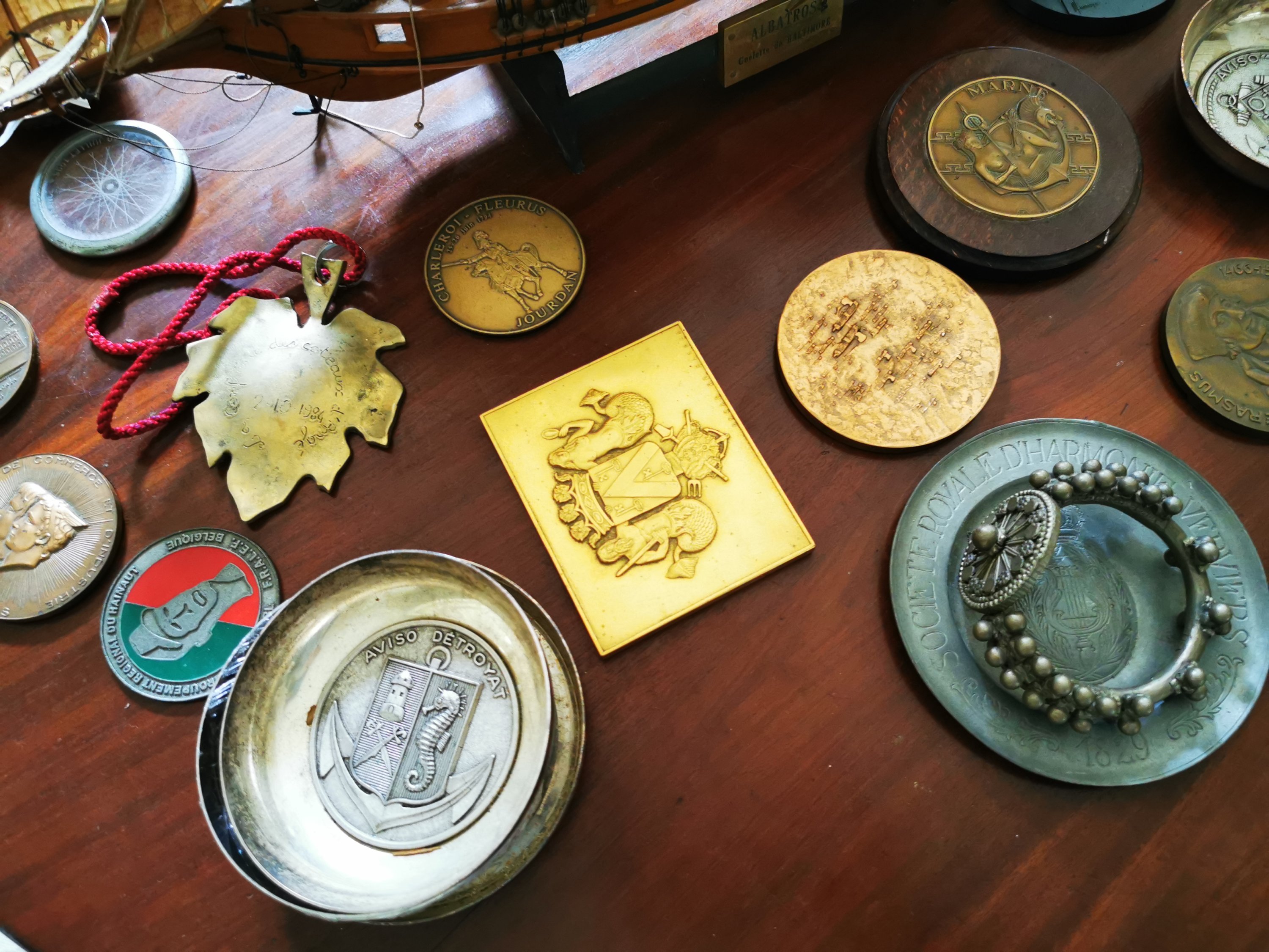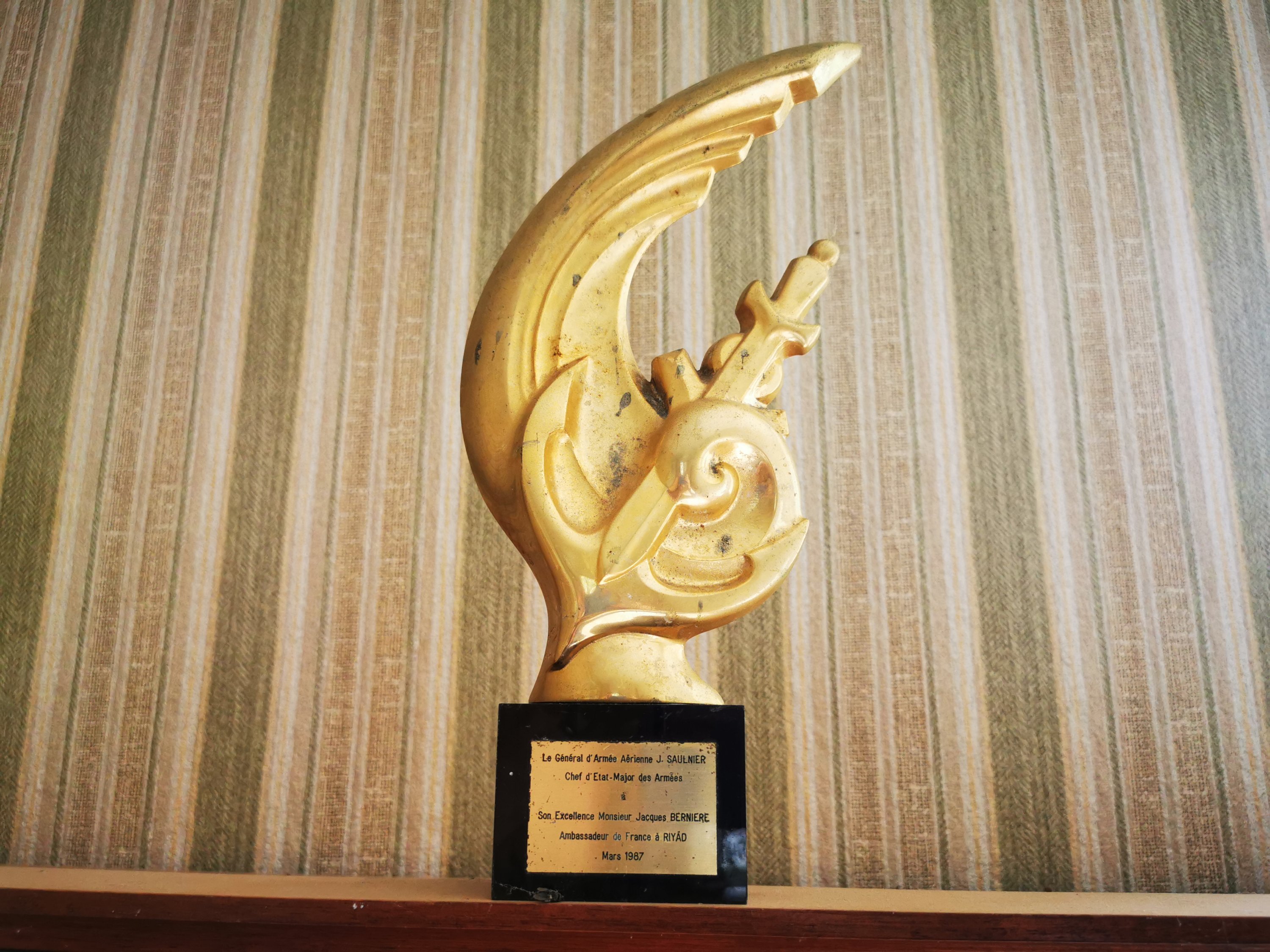 Joint: trophée en métal doré représentant une ancre e un glaive enchassés dans une vague, offert à Jacques Bernière par le Général J. Saulnier.
