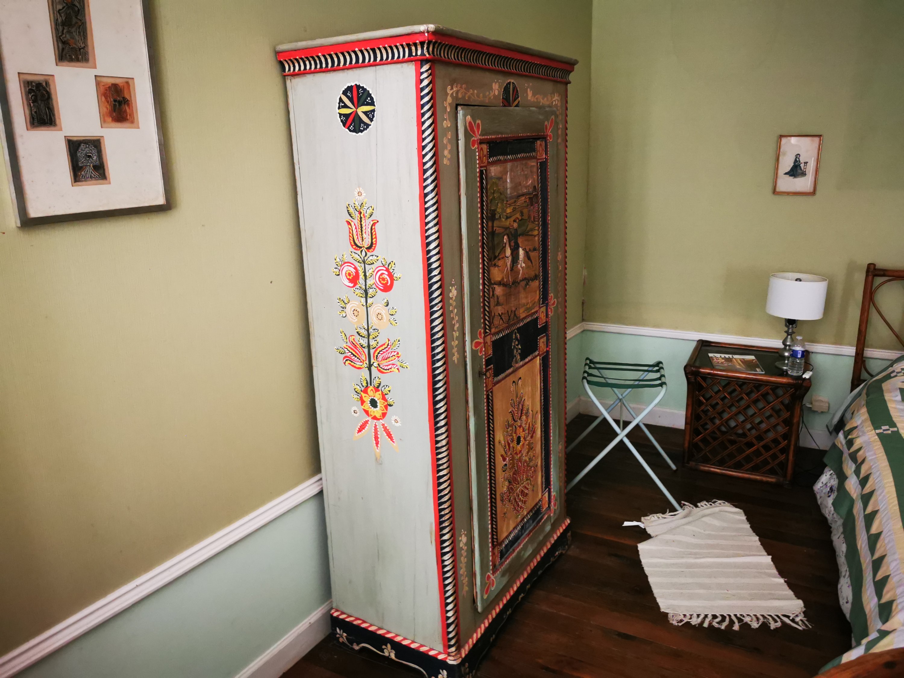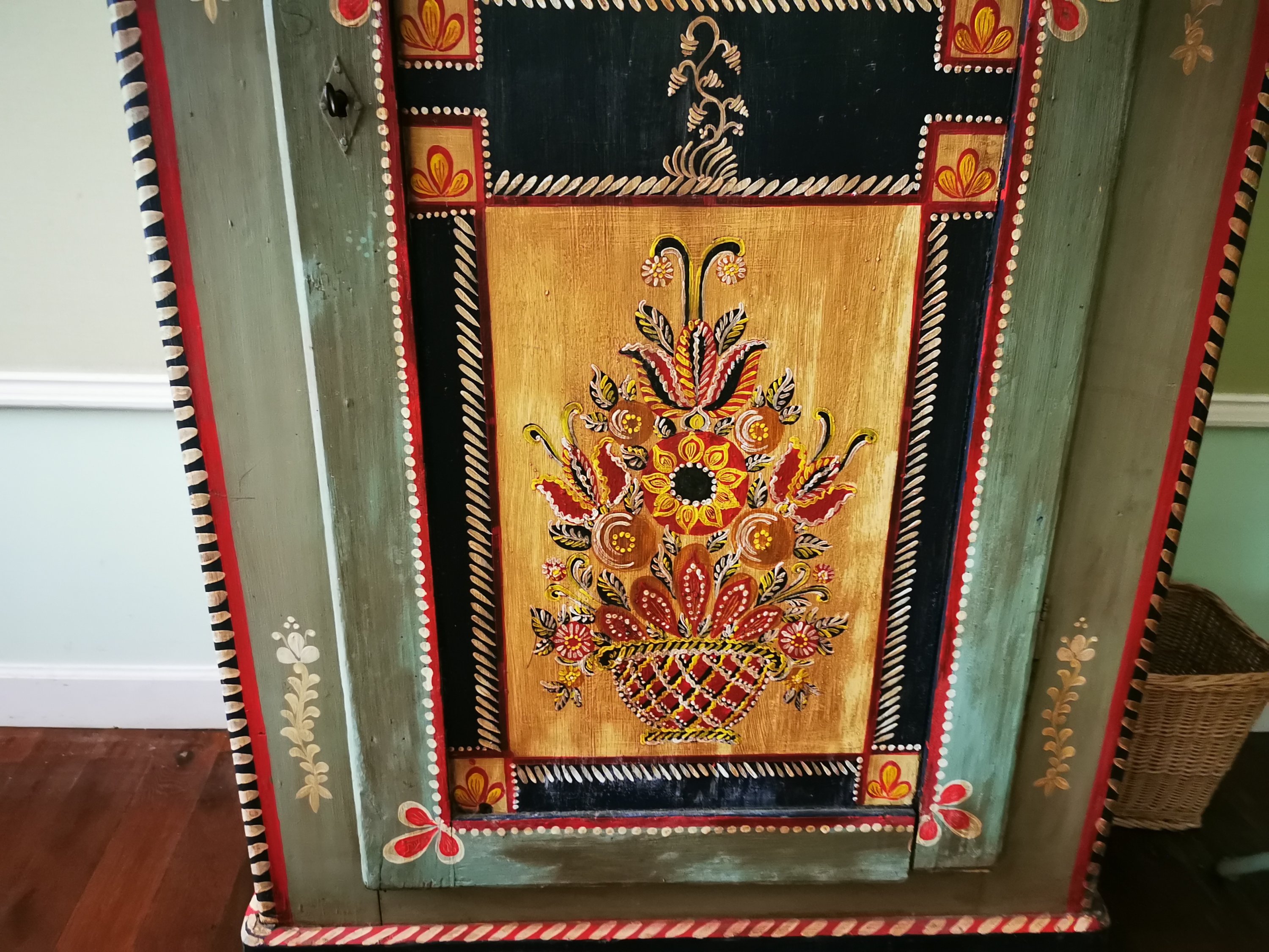 en bois peint, à décor polychrome de scène cavalière et de motifs floraux.