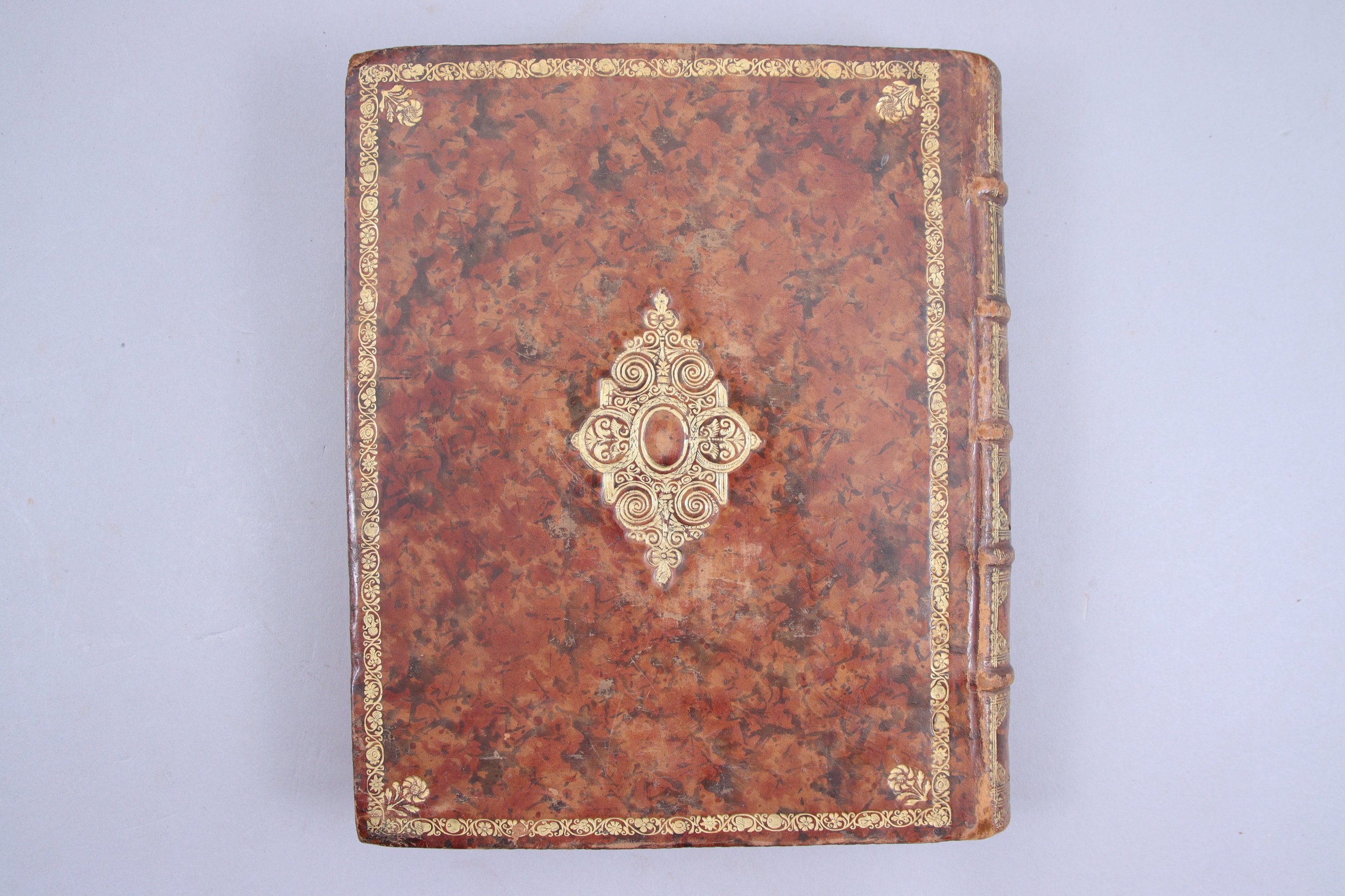 In-4°, plein veau raciné, large roulette d'encadrement, grand fer aux arabesques au centre des plats, dos très orné, toutes tranches dorées. Reliure hollandaise du temps. (Quelques cahiers roussis).