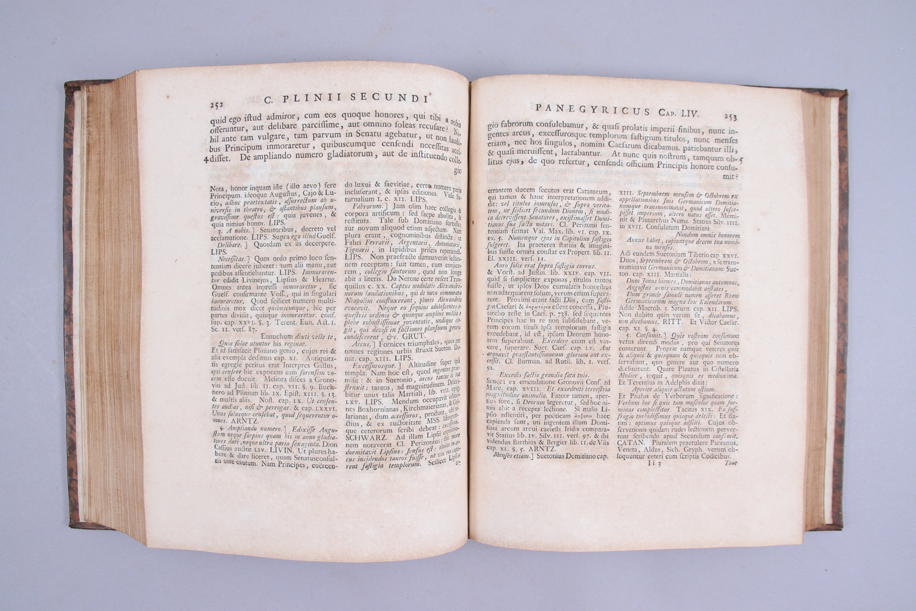 Frontispice gravé par W. Jongman. Savante édition du Panégyrique de Trajan par Pline le Jeune, donnée par Jan Arntzenius (1702-1759), professeur à Nimègue, puis à Franeker, avec les notes de Juste-Lipse, J. Gruter, etc...