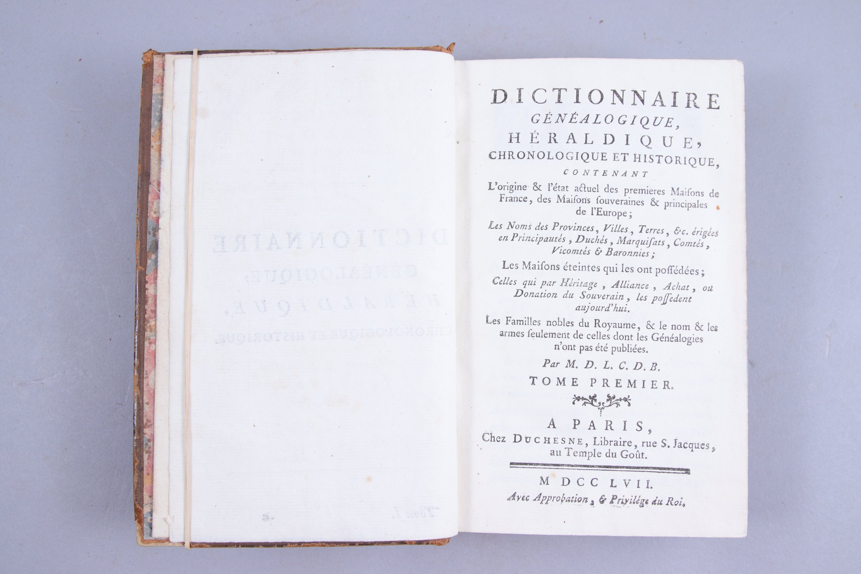 Dictionnaire généalogique, héraldique, chronologique et historique contenant l'origine et l'état actuel des premières Maisons de France, des Maisons souveranes et principales de l'Europe ...les familles nobles du Royaume... Par M.D.L.C.D.B.
