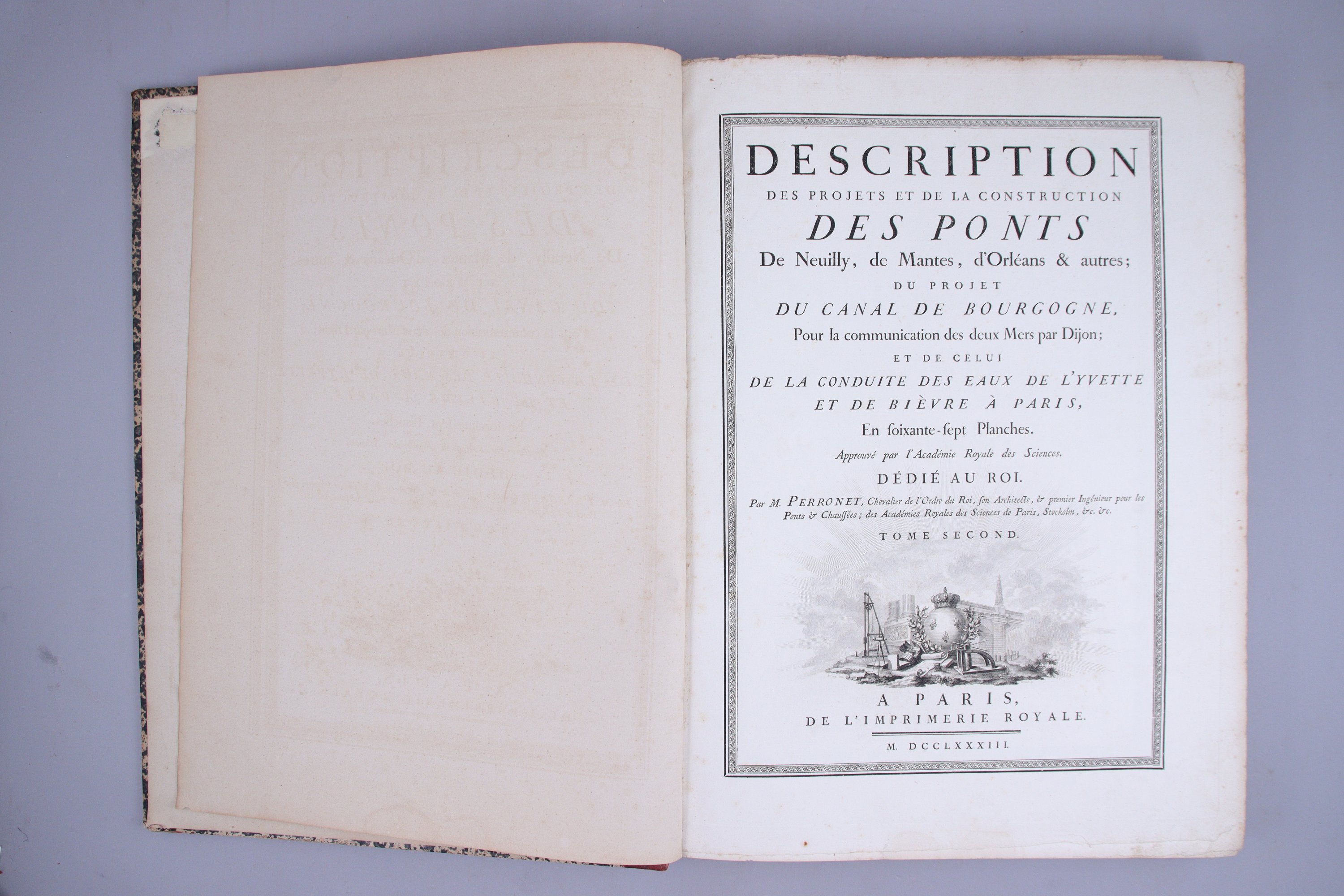 2 volumes grand in-folio (590 X 420 mm). (6 ff) et 112 pages ; (2 ff) et 154 pages. 67 superbes planches hors-texte gravées sur cuivre, la plupart doubles et dépliantes, d'après Eustache de Saint-Far, numérotée 1 à 66 (il y a une planche 39 bis). Bien complet de la page d'Avis au relieur. 1/2 veau maroquiné cerise établi vers 1830. (Le portrait de Perronet manque. Quelques légères rousseurs. Coiffes et coins frottés. Quelques épidermures).