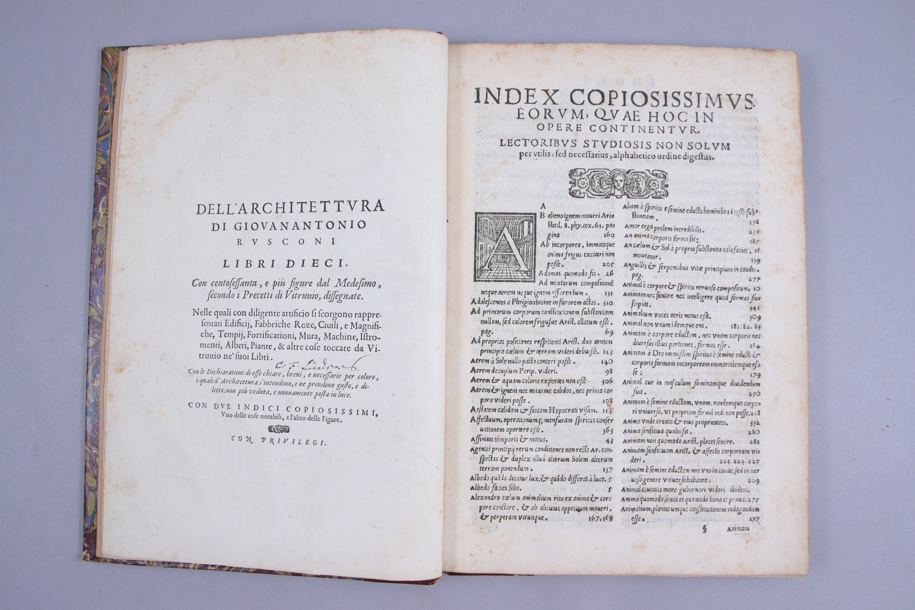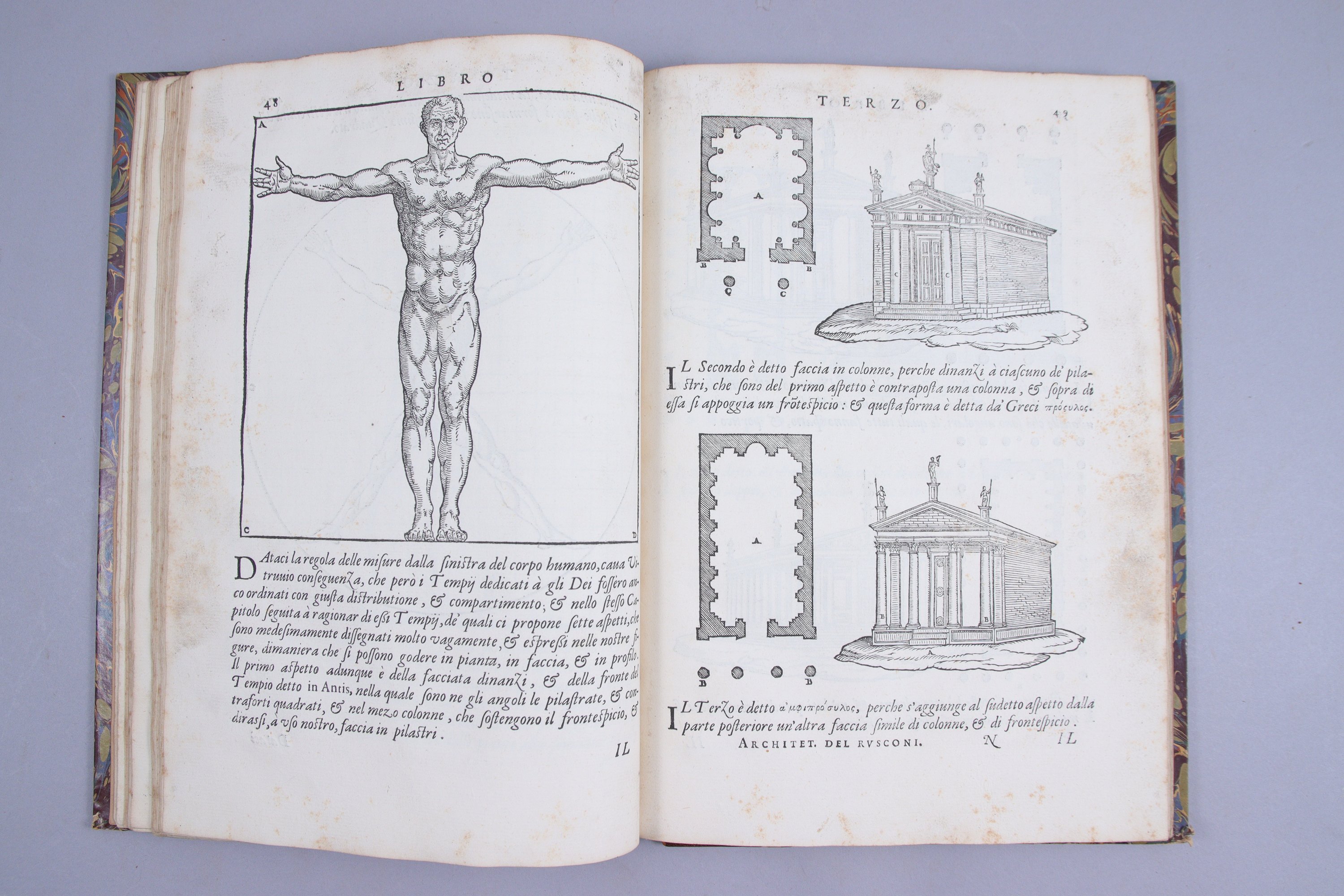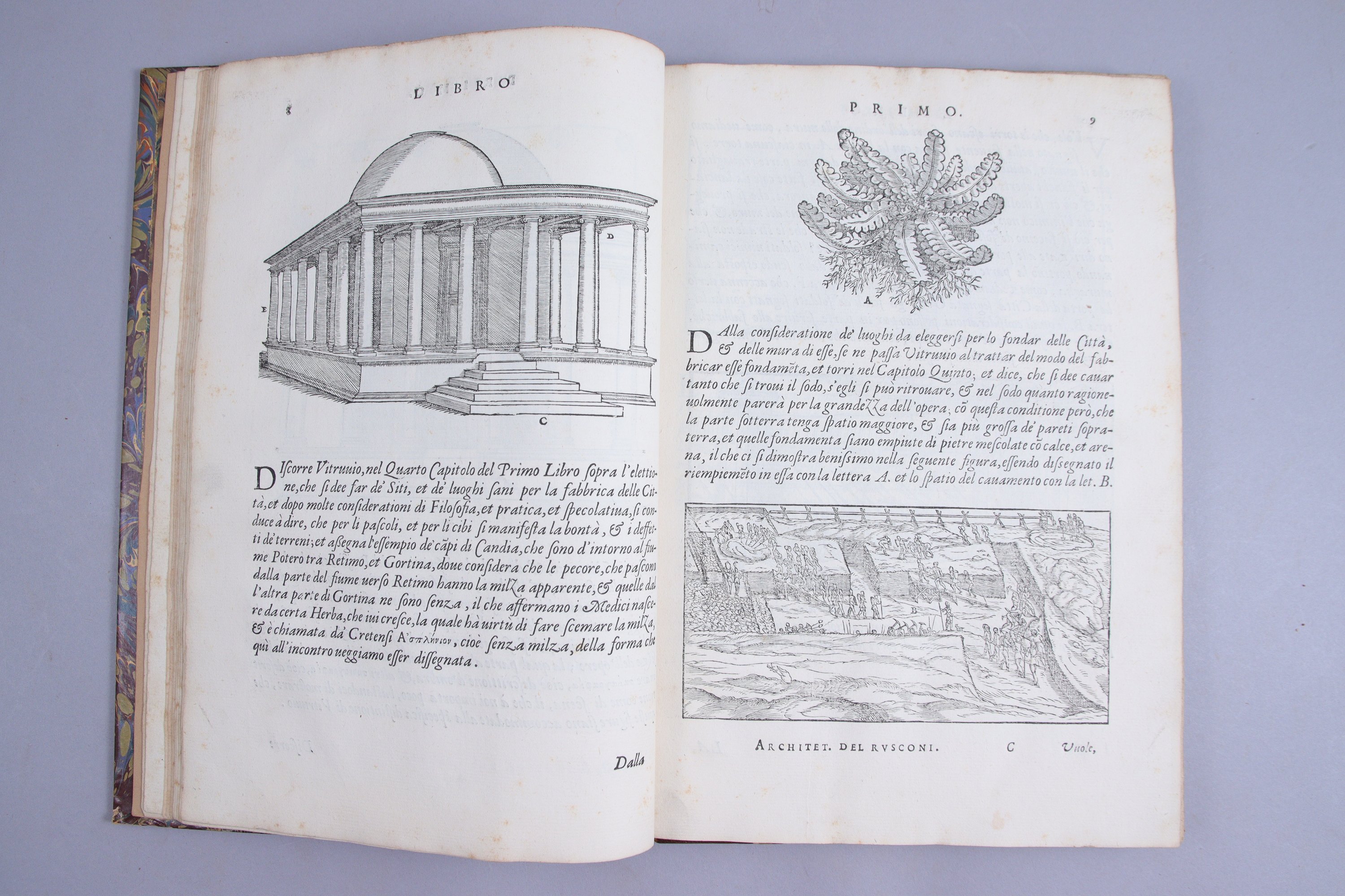Édition originale de cette traduction italienne du De re architectura de Vitruve. Elle est remarquablement illustrée d'un encadrement de titre et de 160 bois gravés, certains à pleine page, d’après les dessins de Rusconi. Une partie de ces bois est inspirée de l’iconographie traditionnelle vitruvienne, une autre relève de l’invention de l’auteur.