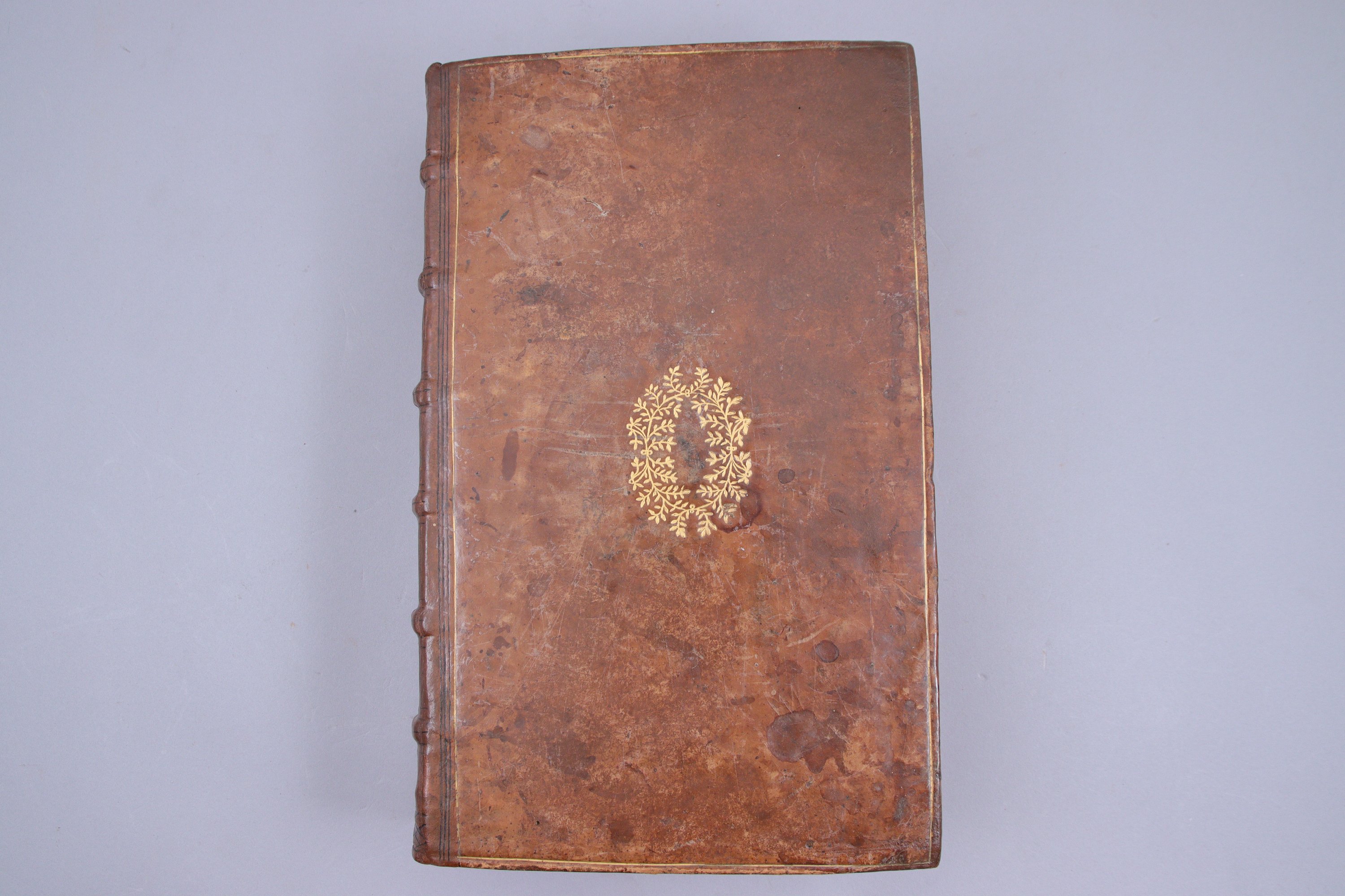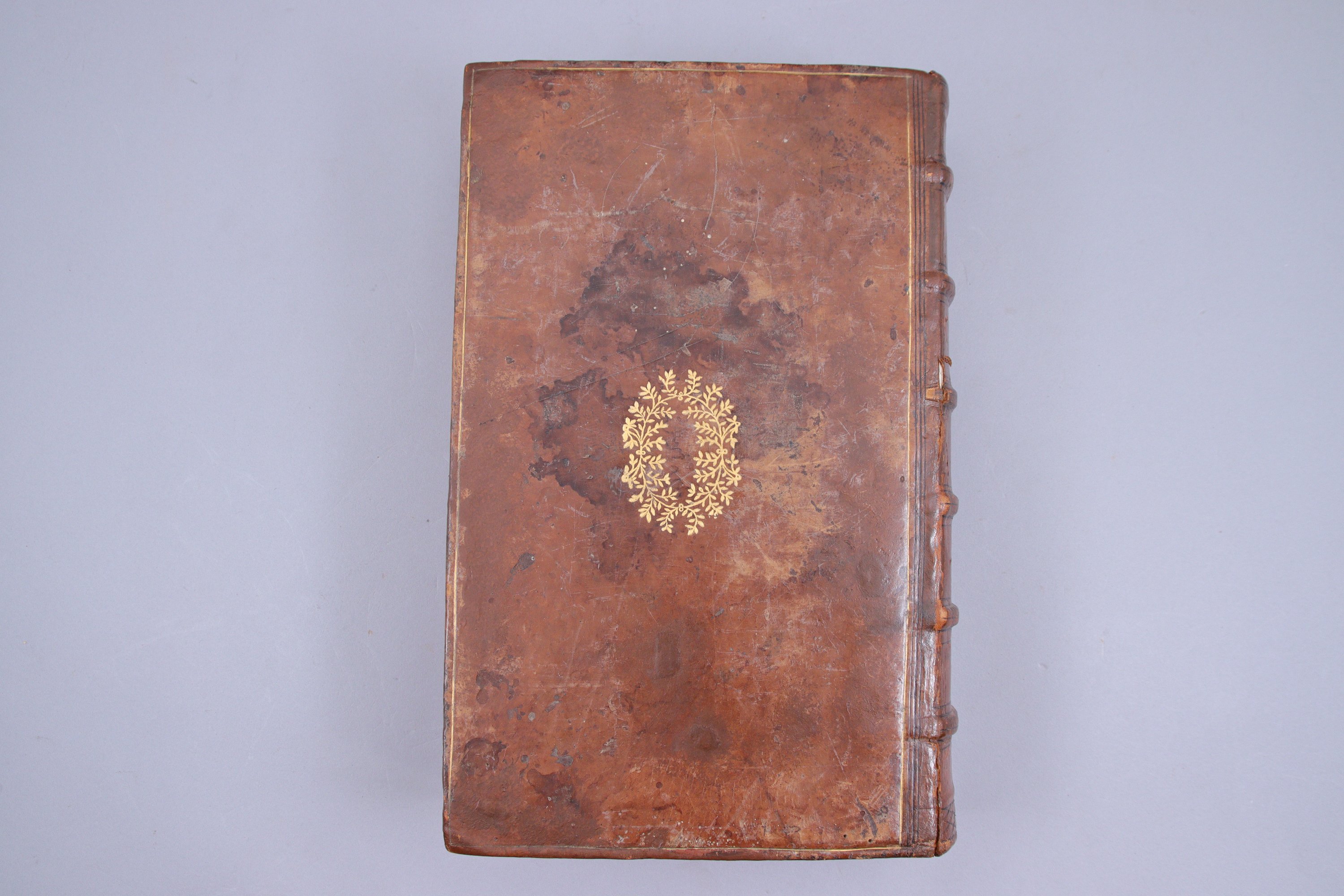 In-folio, (6 feuillets), 1856 colonnes, (80 feuillets) d'index ; 188 colonnes pour l'Appendix, (1 feuillet) pour le colophon et la marque d'imprimeur. Plein veau fauve, couronne de rameaux d'olivier au centre des plats. Reliure du temps. (Papier légèrement roussi. Galeries de vers dans l'Index, affectant quelque peu le texte sur une vingtaine de feuillets).