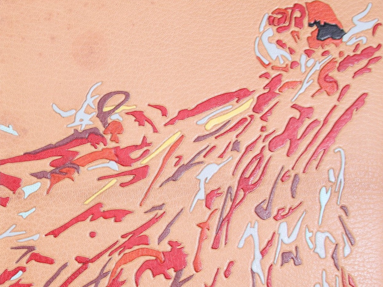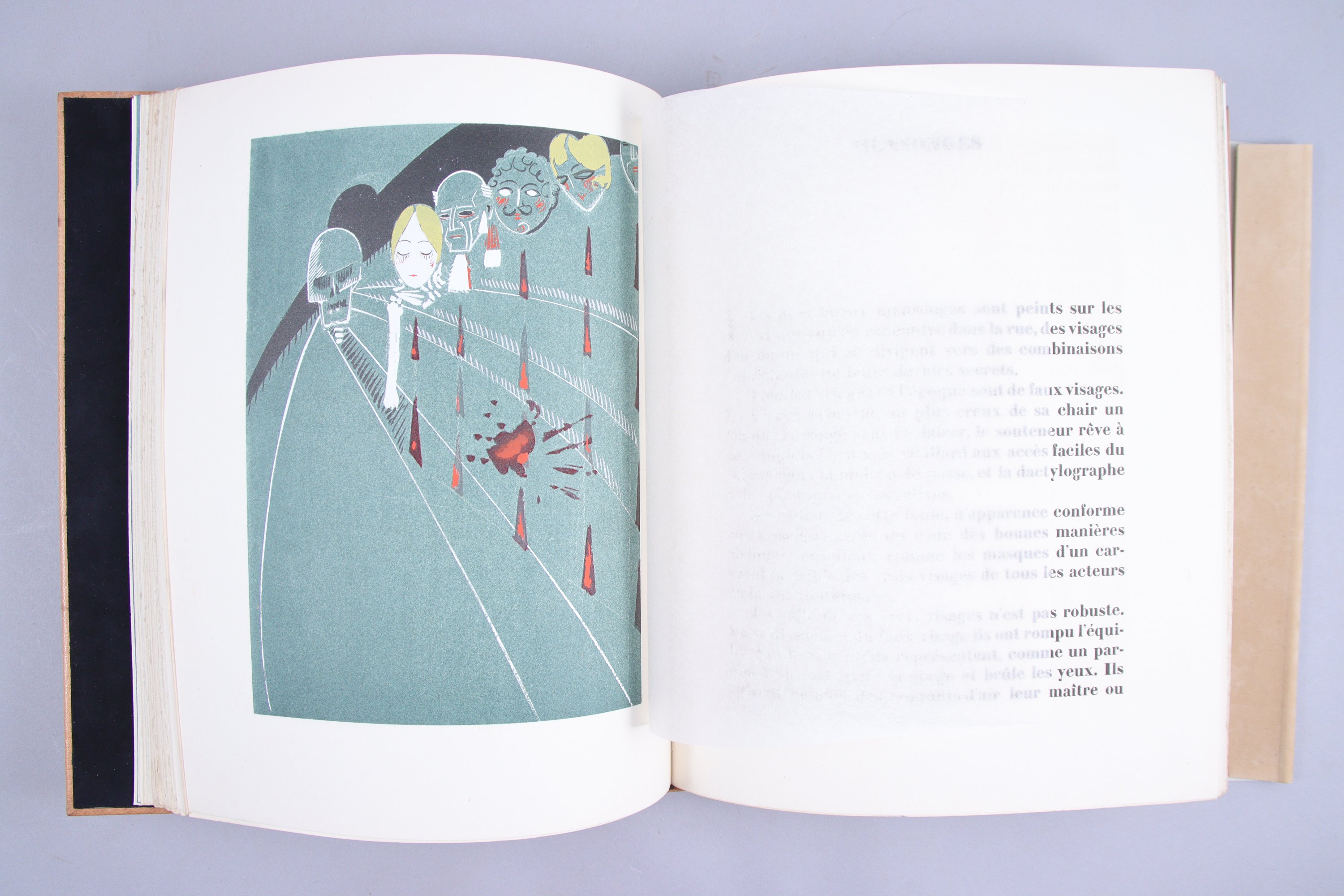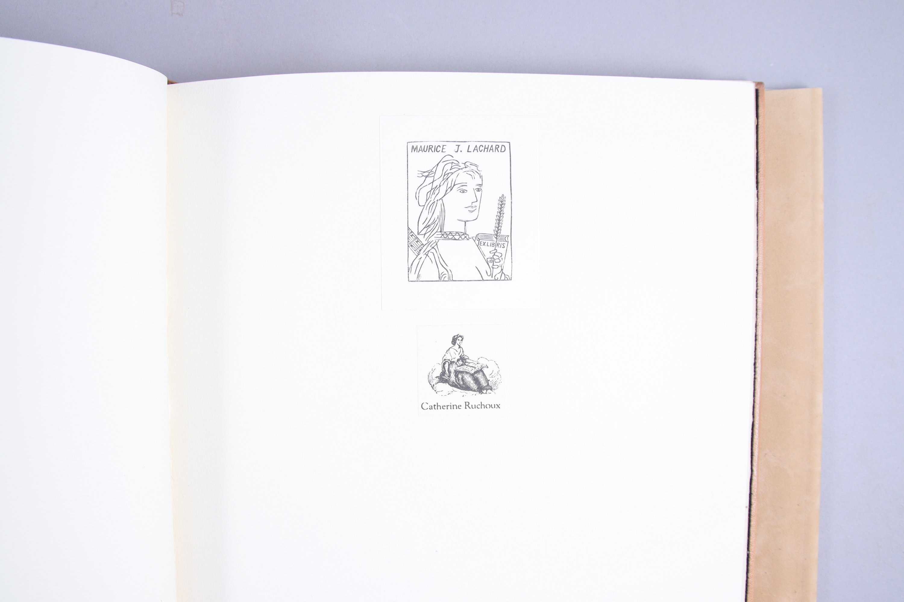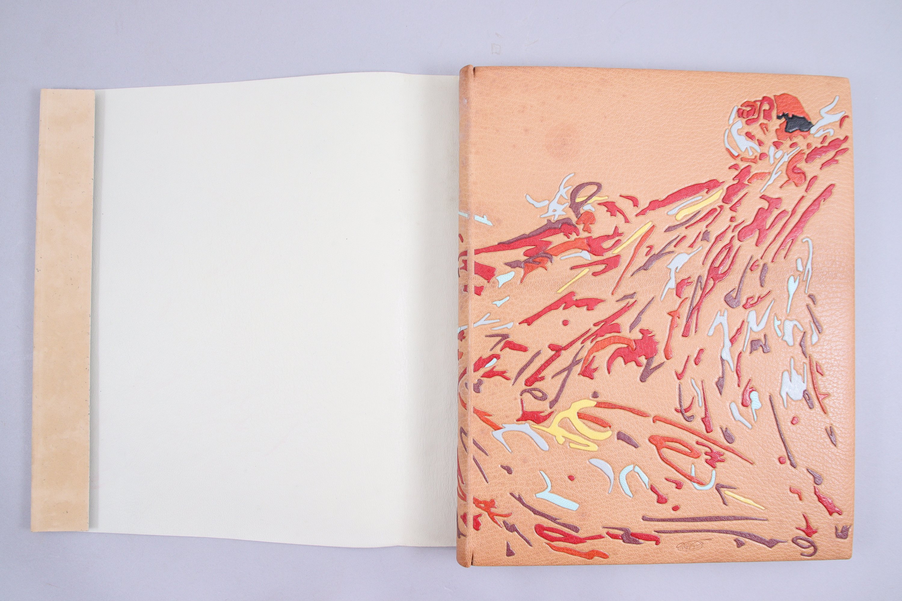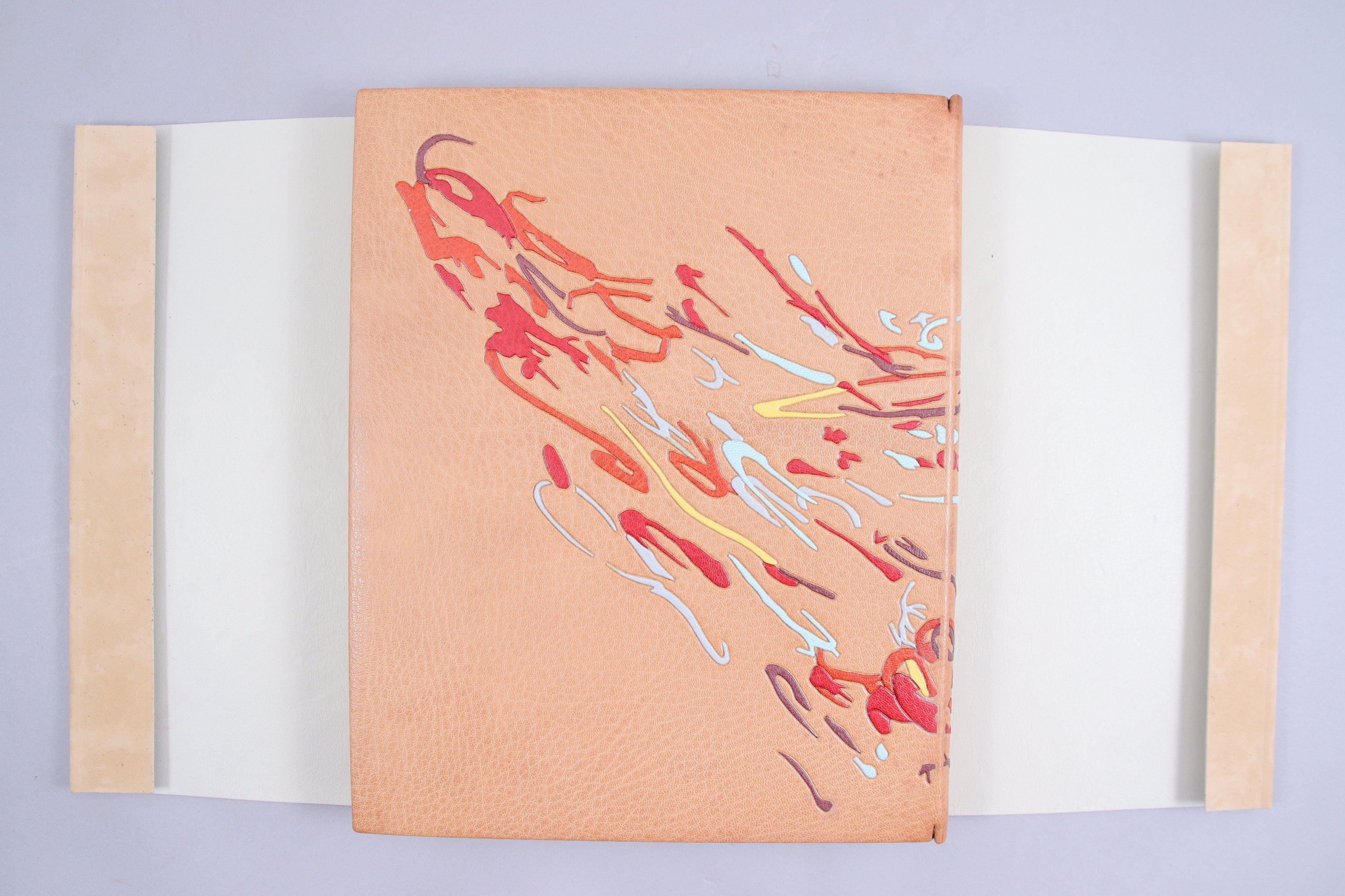 In-4°. Plein maroquin beige mosaïqué d'une composition abstraite en rouge, bleu, jaune et marron. Garde de feutrine noire. Chemise de daim beige. Etui recouvert de daim beige, le dos de feutrine noire. Tête dorée. Couvertures conservées. (Infime tâche sur le premier plat)