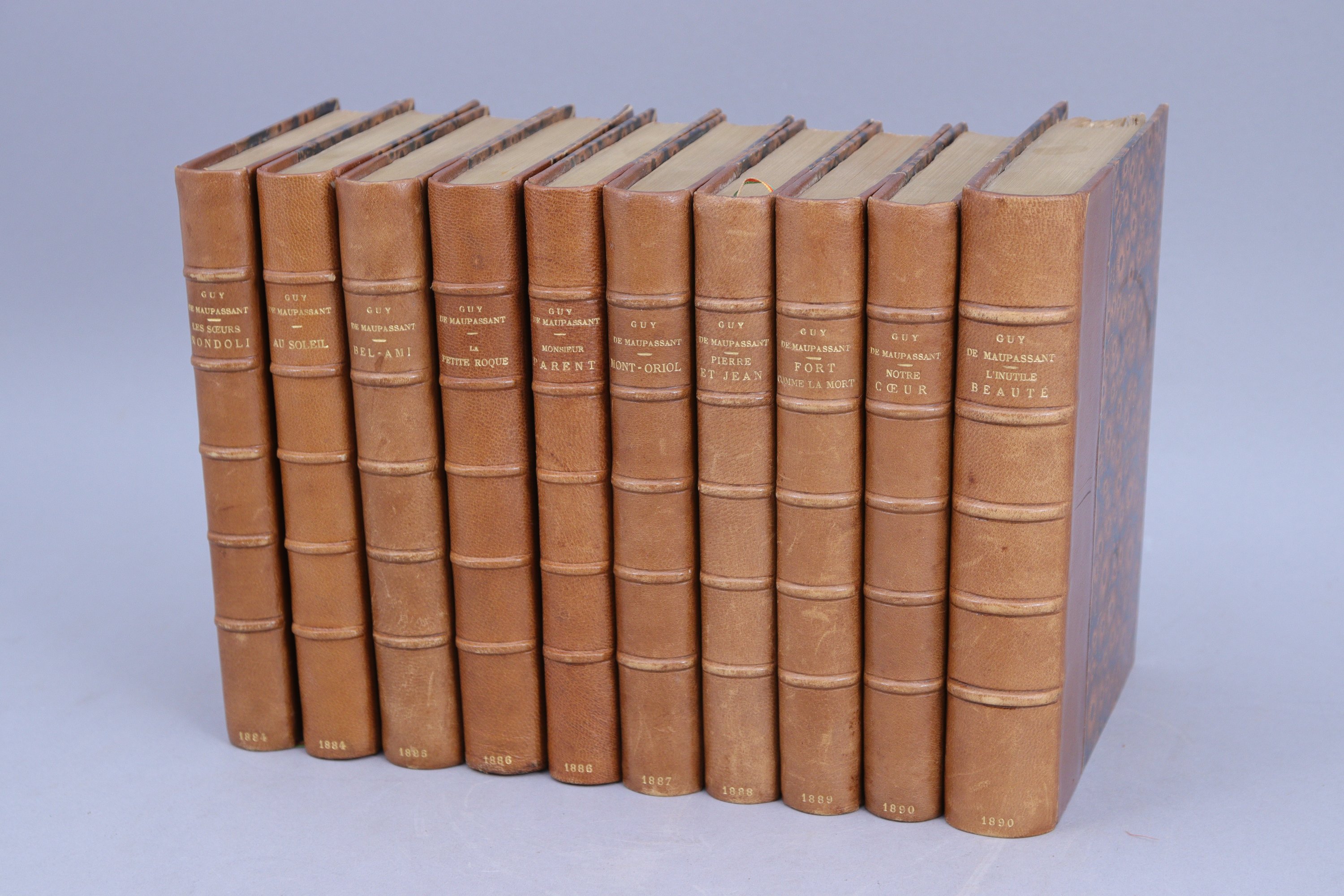 Dix éditions originales de Guy de Maupassant, dont une sur papier de Hollande et une avec envoi à Maurice Sand. Reliures uniformes établies dans les toutes premières années du XXème siècle en 1/2 veau havane, avec en queue la date de parution ; tête dorée, couvertures conservées.