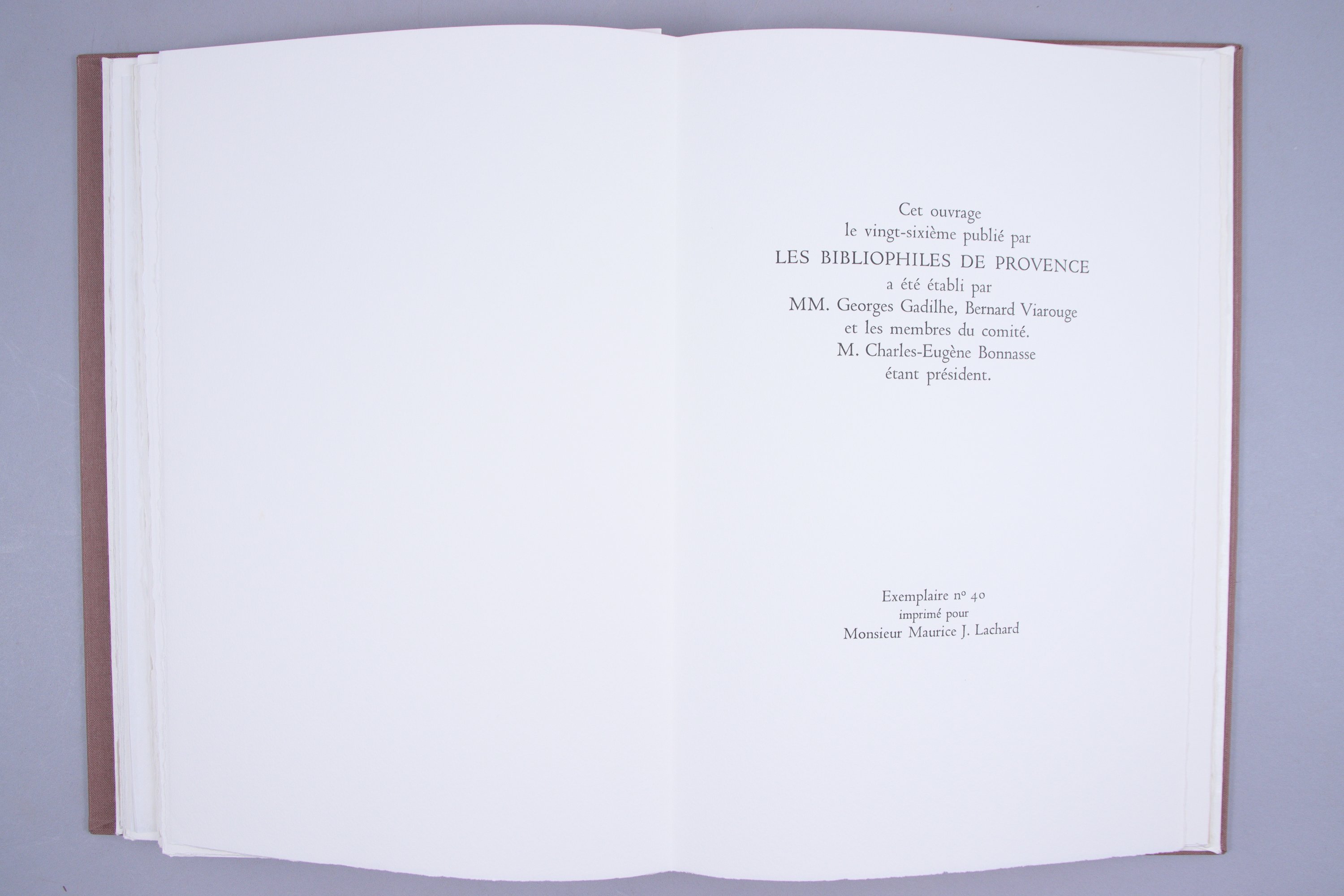 Tirage à 130 exemplaires seulement, tous sur vélin d'Arches, celui-ci un des 95 nominatifs, au nom de Maurice J. Lachard.