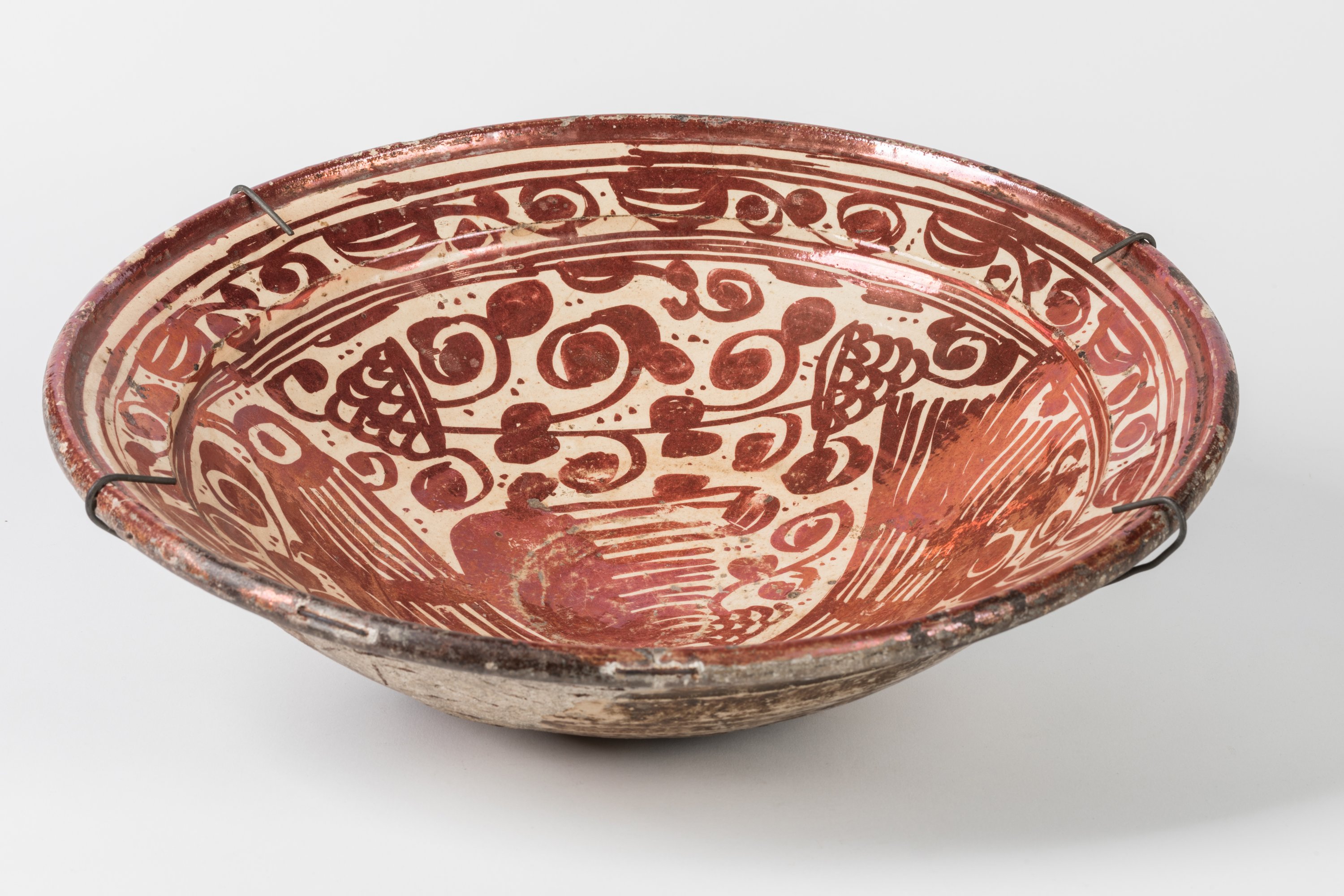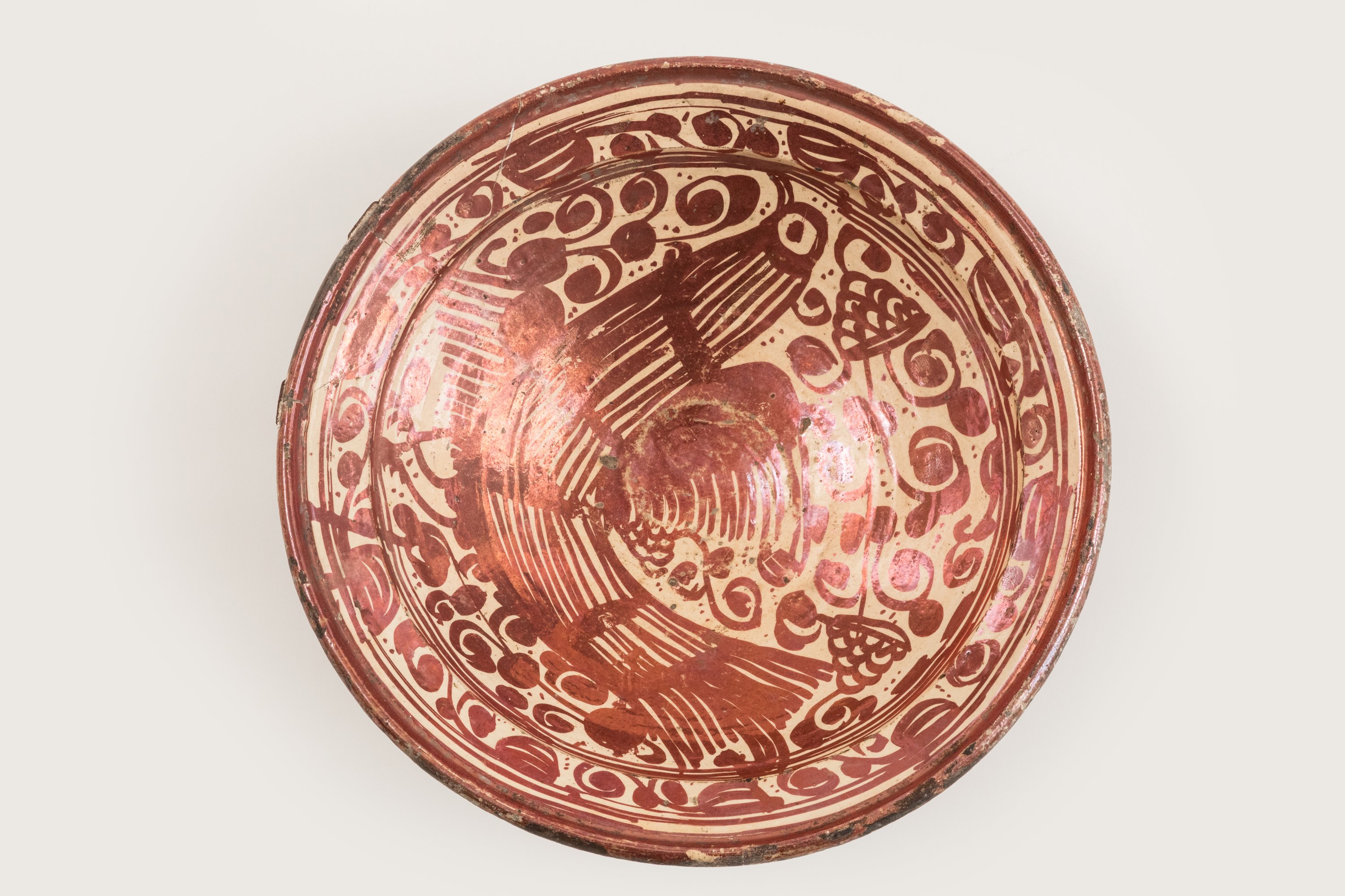 en faïence hispano-mauresque, à décor ocre lustré sur fond chamois au centre d’un pardalot parmi des fleurs stylisées.