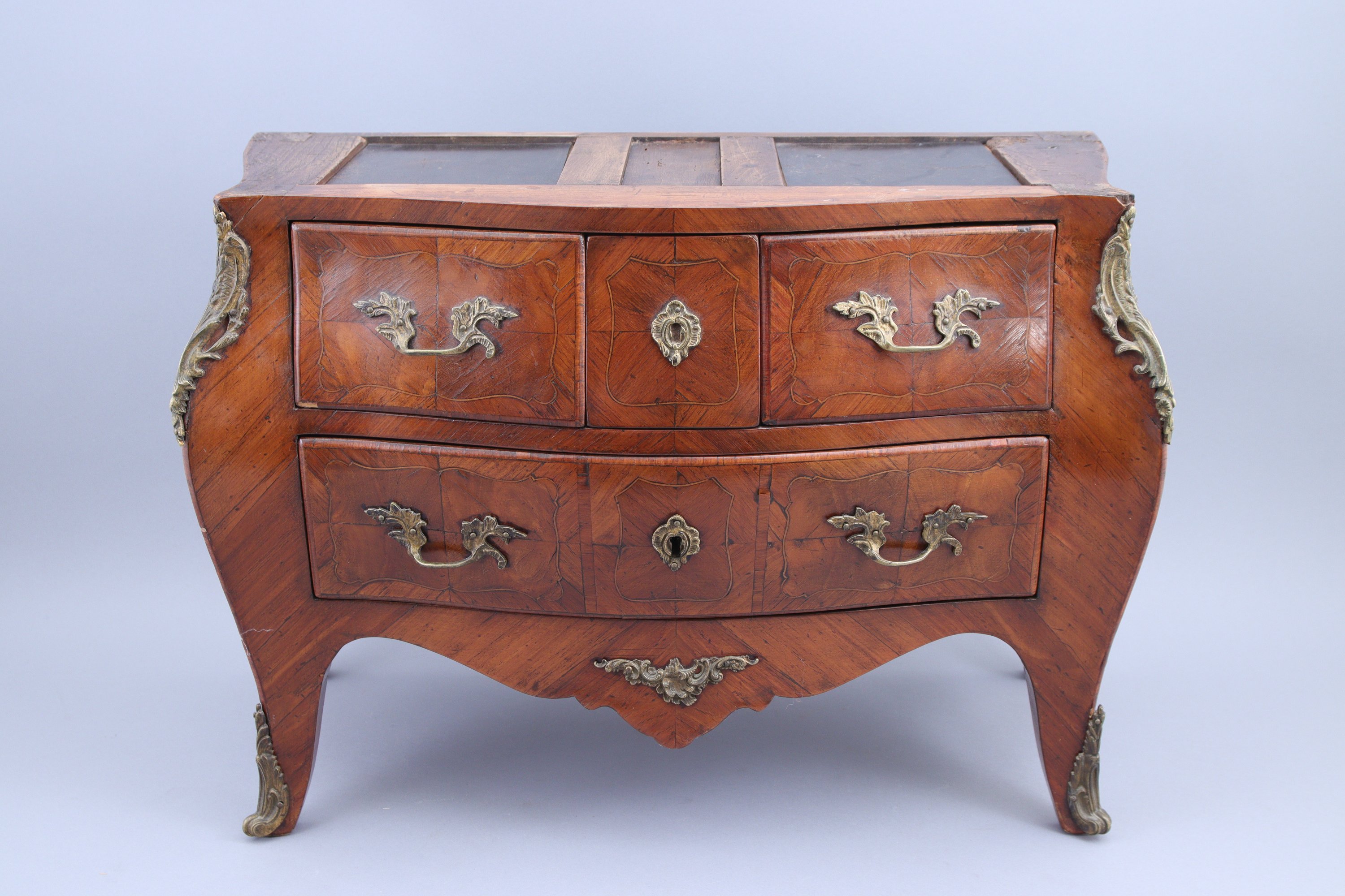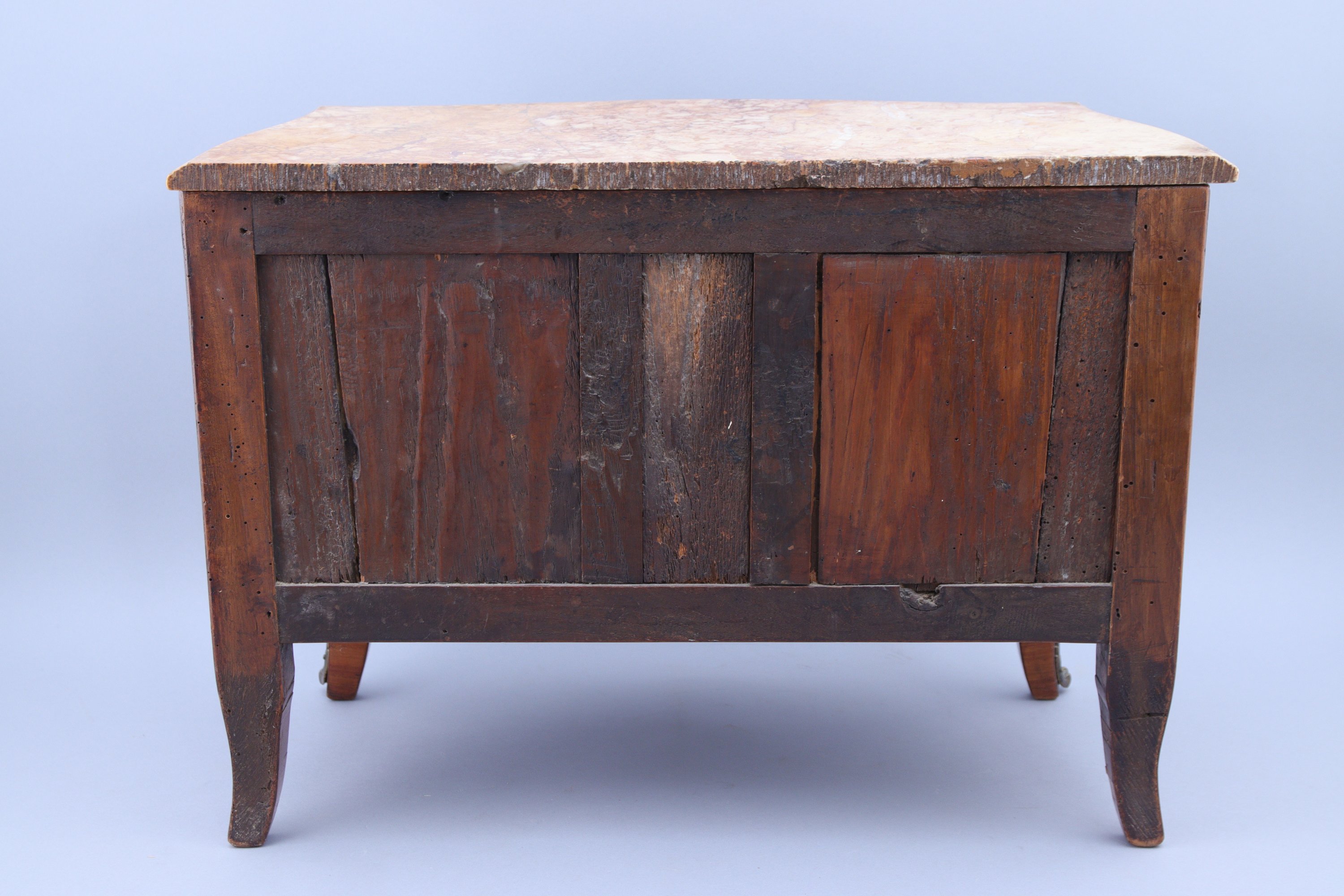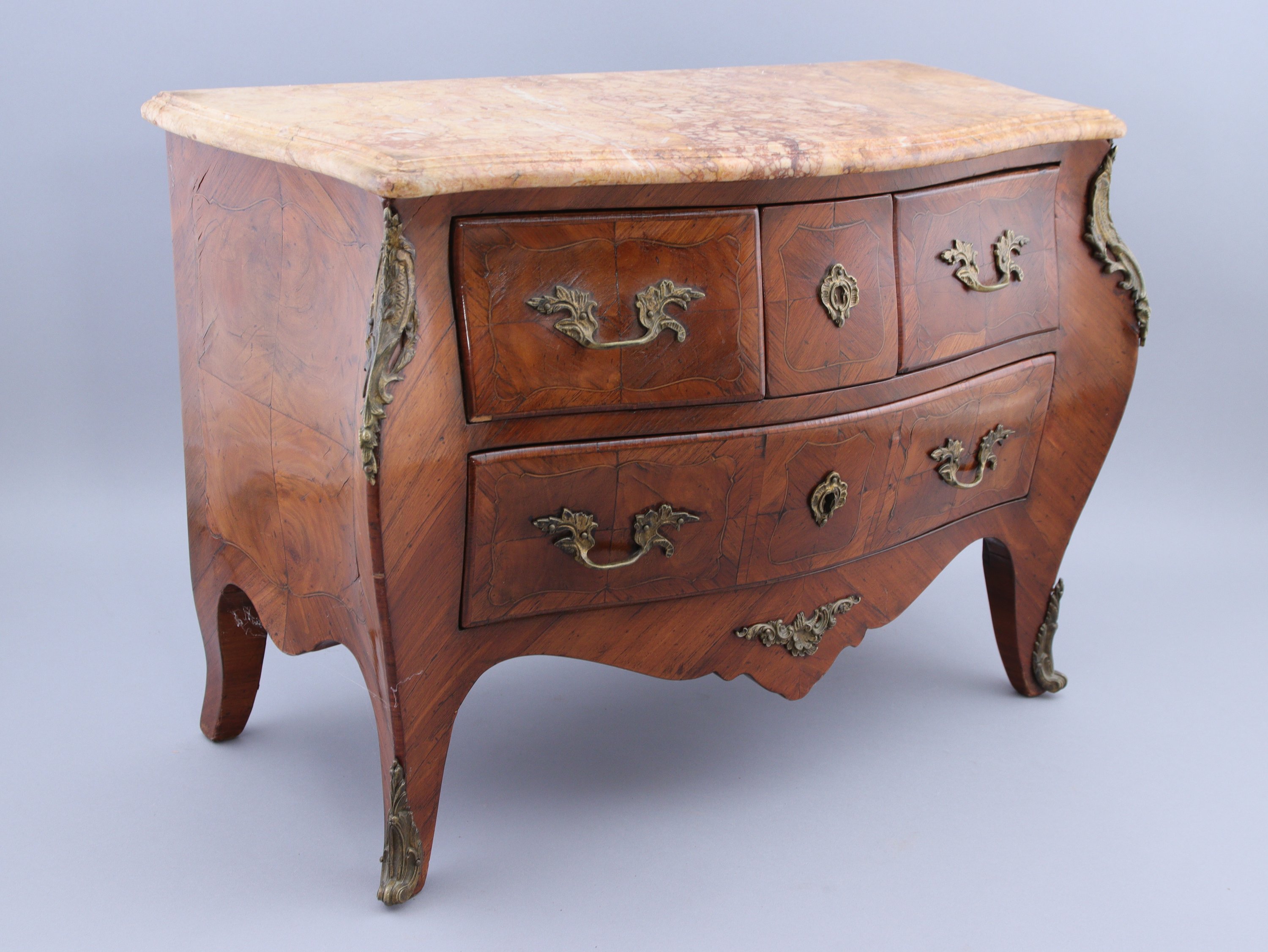 en placage de bois de rose sur fond de chêne, ouvrant par quatre tiroirs sur deux rangs, chacun décoré de cartouches à filet de bois clair. Le tablier en cul de lampe. Les montants pincés terminés par quatre pieds.