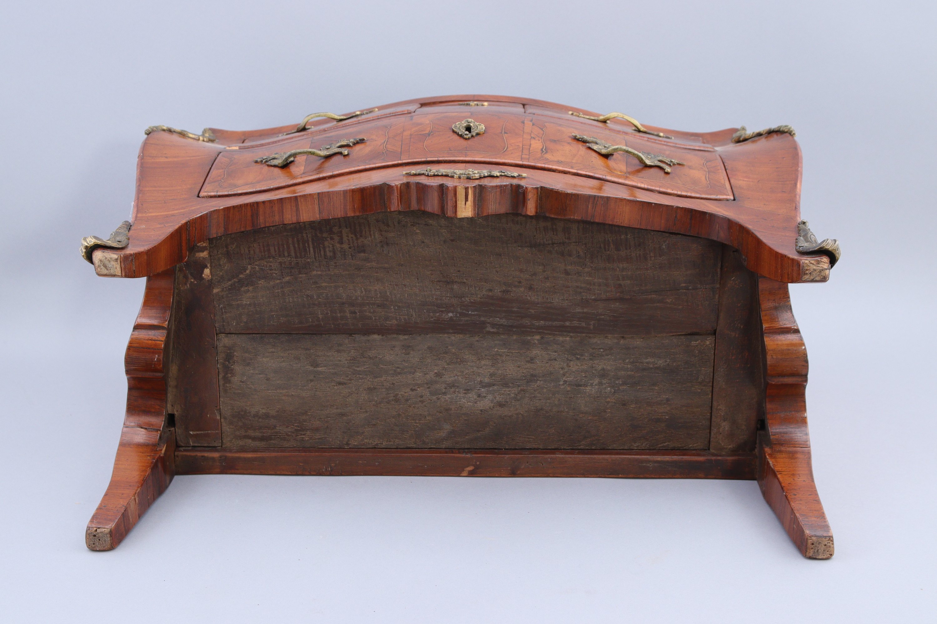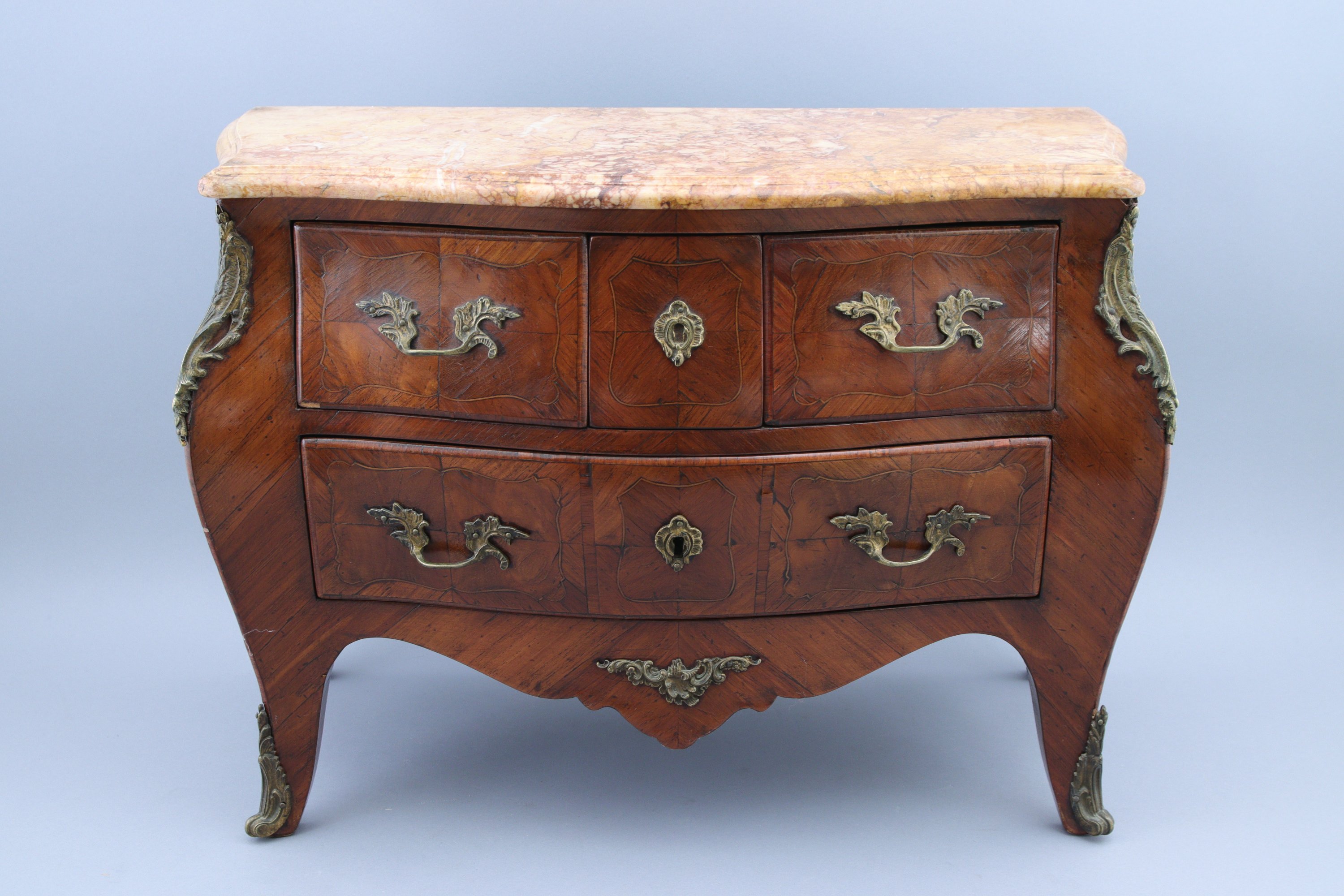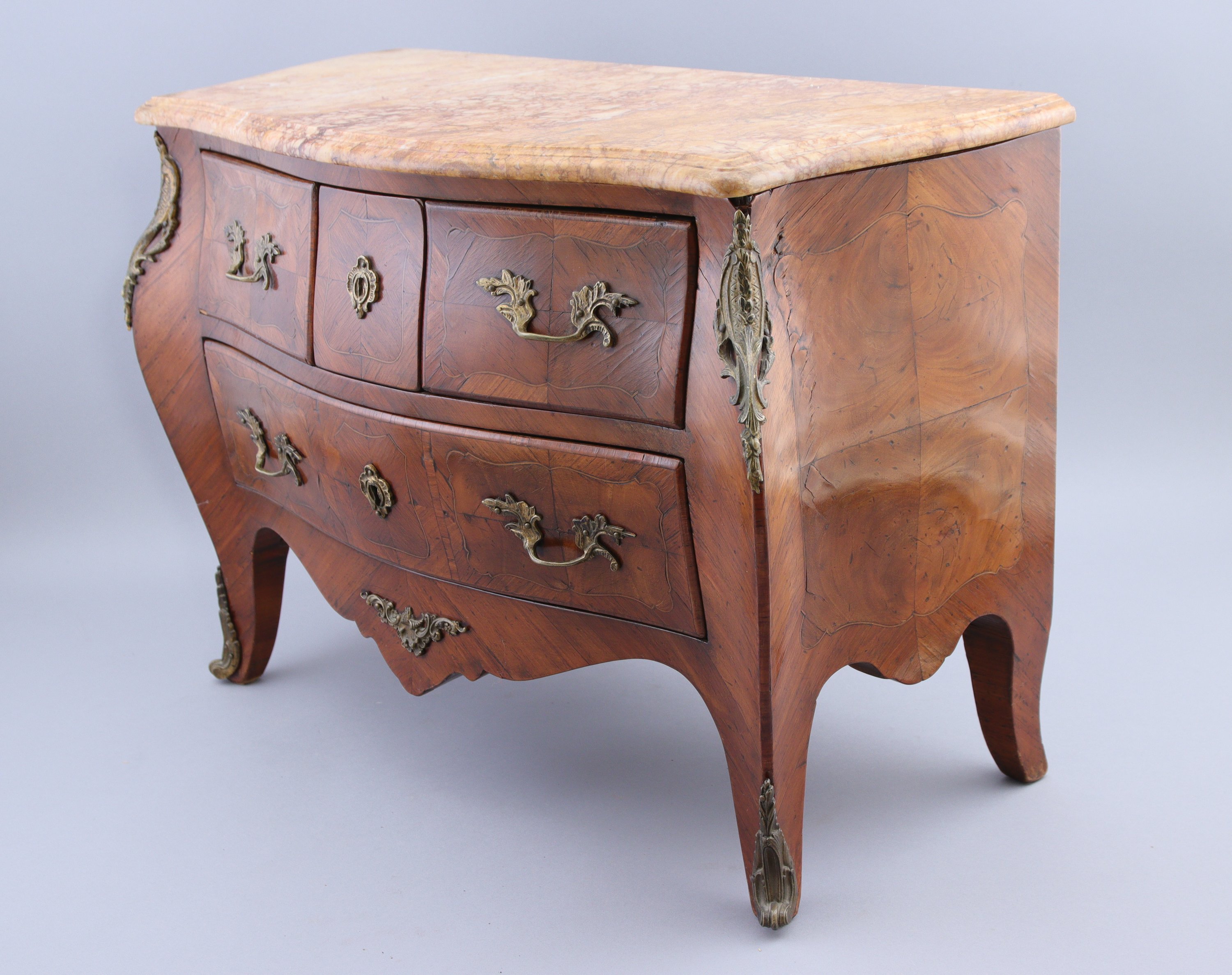en placage de bois de rose sur fond de chêne, ouvrant par quatre tiroirs sur deux rangs, chacun décoré de cartouches à filet de bois clair. Le tablier en cul de lampe. Les montants pincés terminés par quatre pieds.