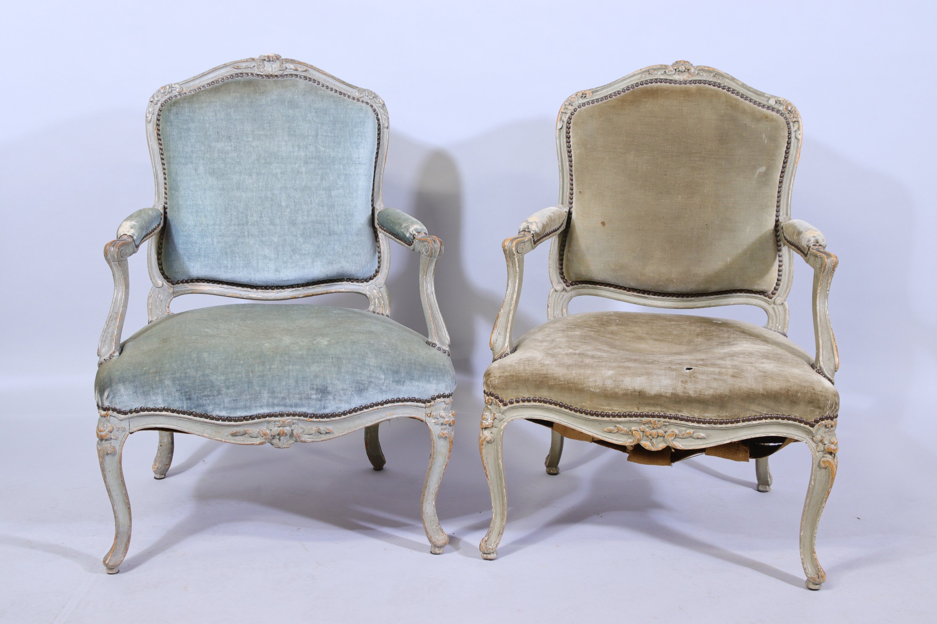 en hêtre mouluré, sculpté et laqué gris. L'amortissement du dossier et la ceinture à décor d'une fleur épanouie entourée d'enroulements et de guirlandes feuillagées se prolongeant sur les épaules. Les accotoirs à manchettes reposant sur des consoles mouvementées. Quatre pieds cambrés, les antérieurs sculptés de fleurs.